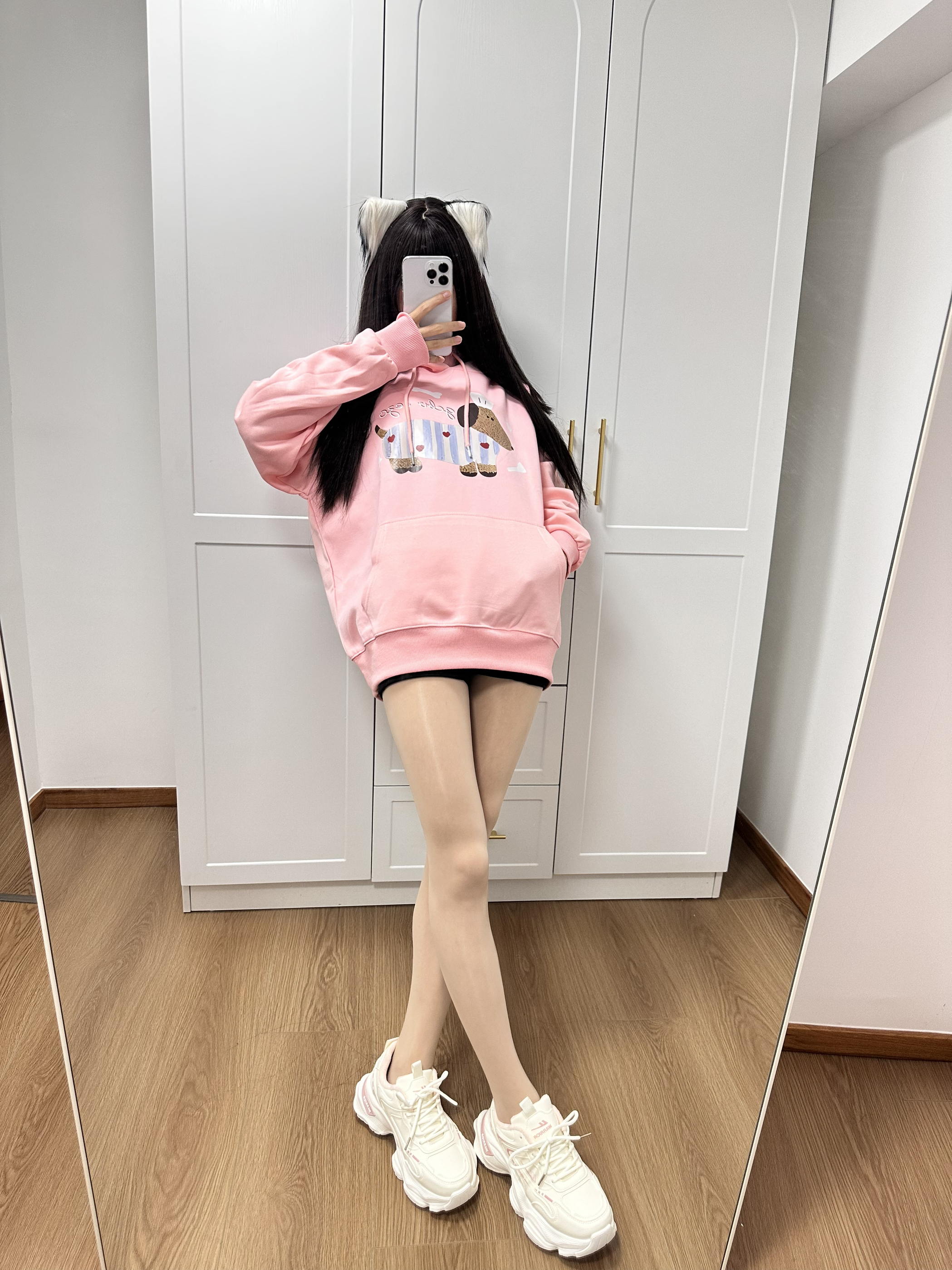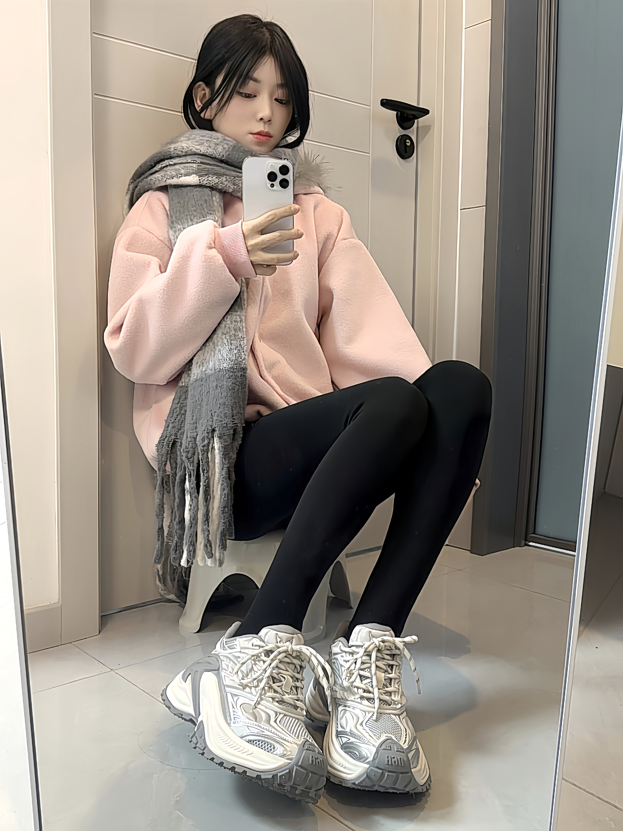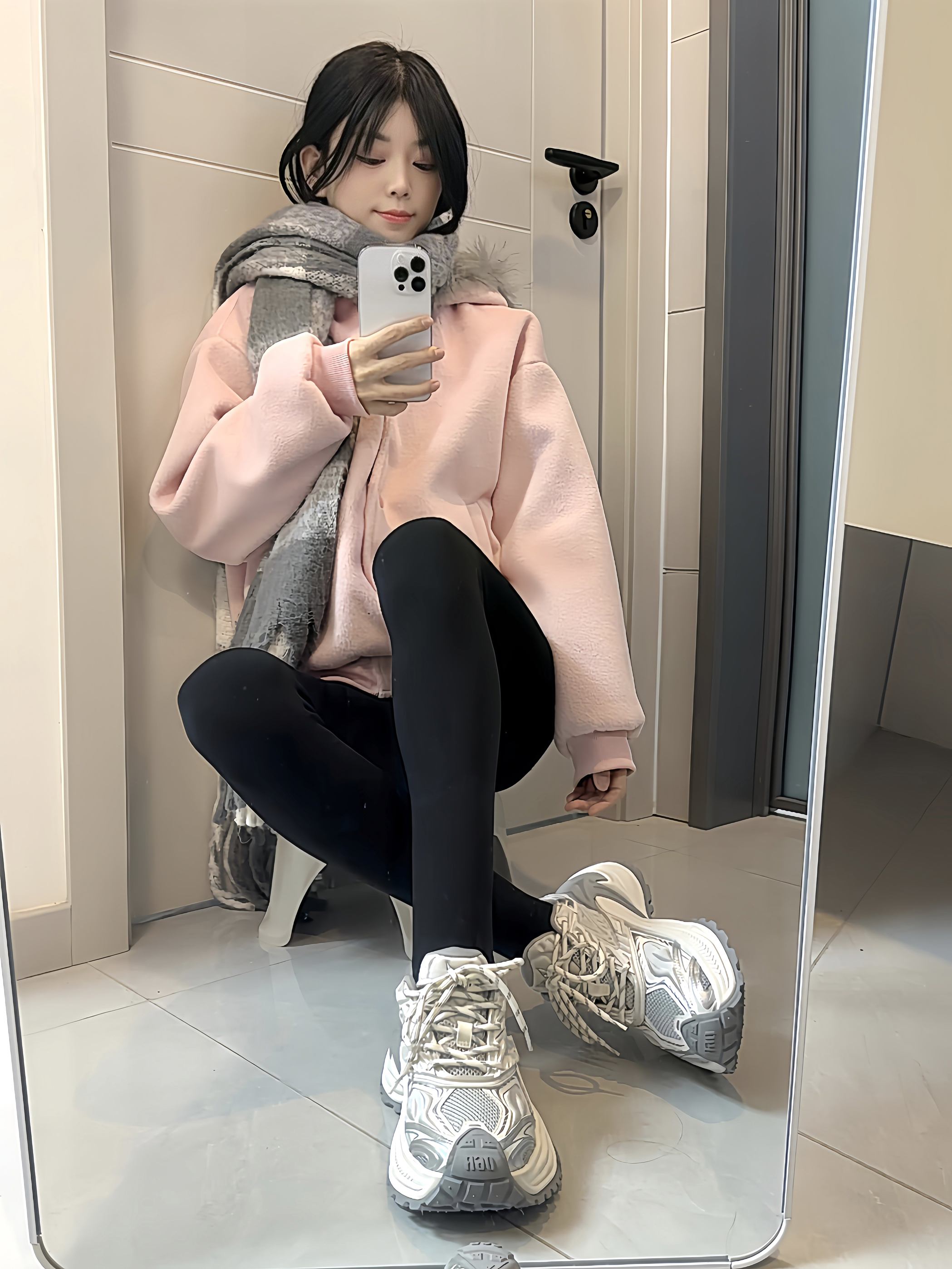 今天的穿搭是温柔挂的! 粉色毛绒外套🧥软乎乎的 裹上灰围巾暖暖的 搭黑色紧身裤刚好露出这双老爹鞋 银白拼色又酷又显腿长 厚底踩起来软软的 随手在镜子前拍一张 慵懒又舒服 是冬天出门不用费脑的松弛感~
