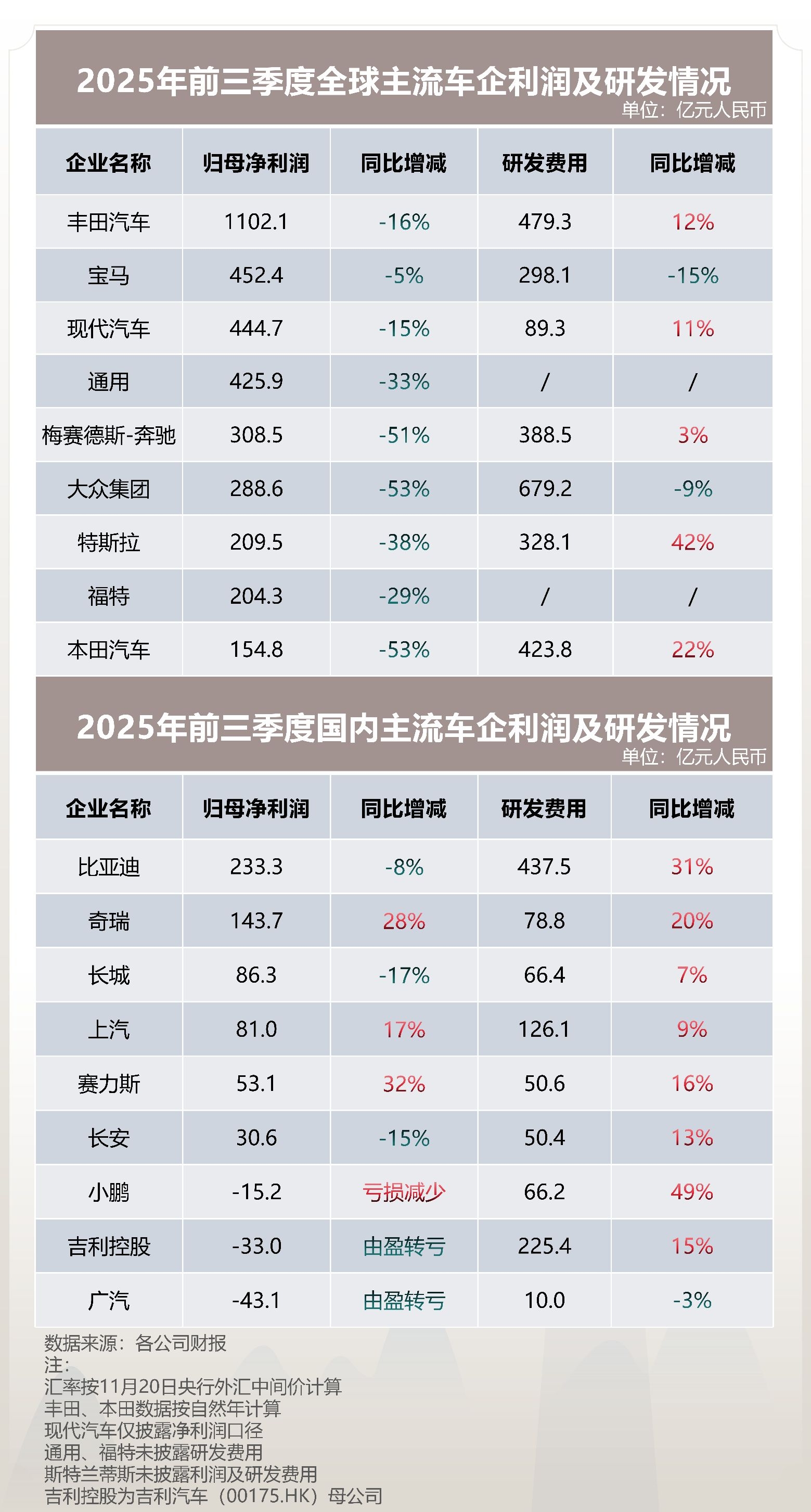 2025年马上就要结束了,从全球车企三季报数据来看,国内外车企业绩呈现出鲜明的反差,而“东升西降”的行业趋势也越来越明显。 海外传统车企的优势正在不断减少,除丰田、大众等少数企业维持平稳增速外,斯特兰蒂斯、本田、奔驰等销量同比下滑,特斯拉也出现销量负增长。营收端海外巨头增速多为个位数,部分陷入负增长,盈利更是大幅收缩,奔驰、大众、本田净利润降幅超50%,丰田利润也下滑16%。 ...