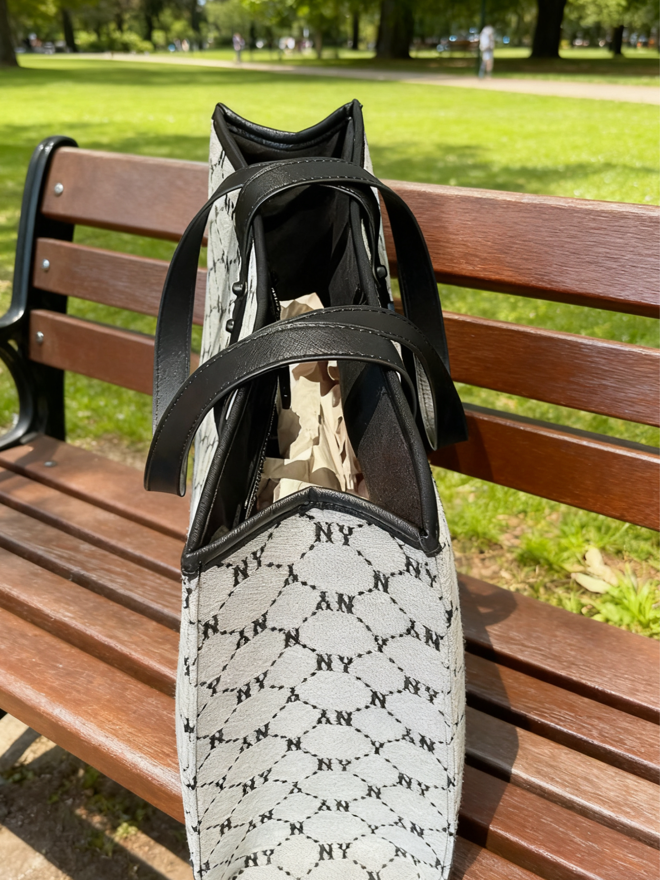 周末逛公园随手把新包放长椅上拍了张,这只NY老花托特真的越背越爱,浅灰老花+黑金标,随便搭件T恤牛仔裤都有松弛感,容量能塞下我的平板+水杯+补妆包,通勤逛街都能打
