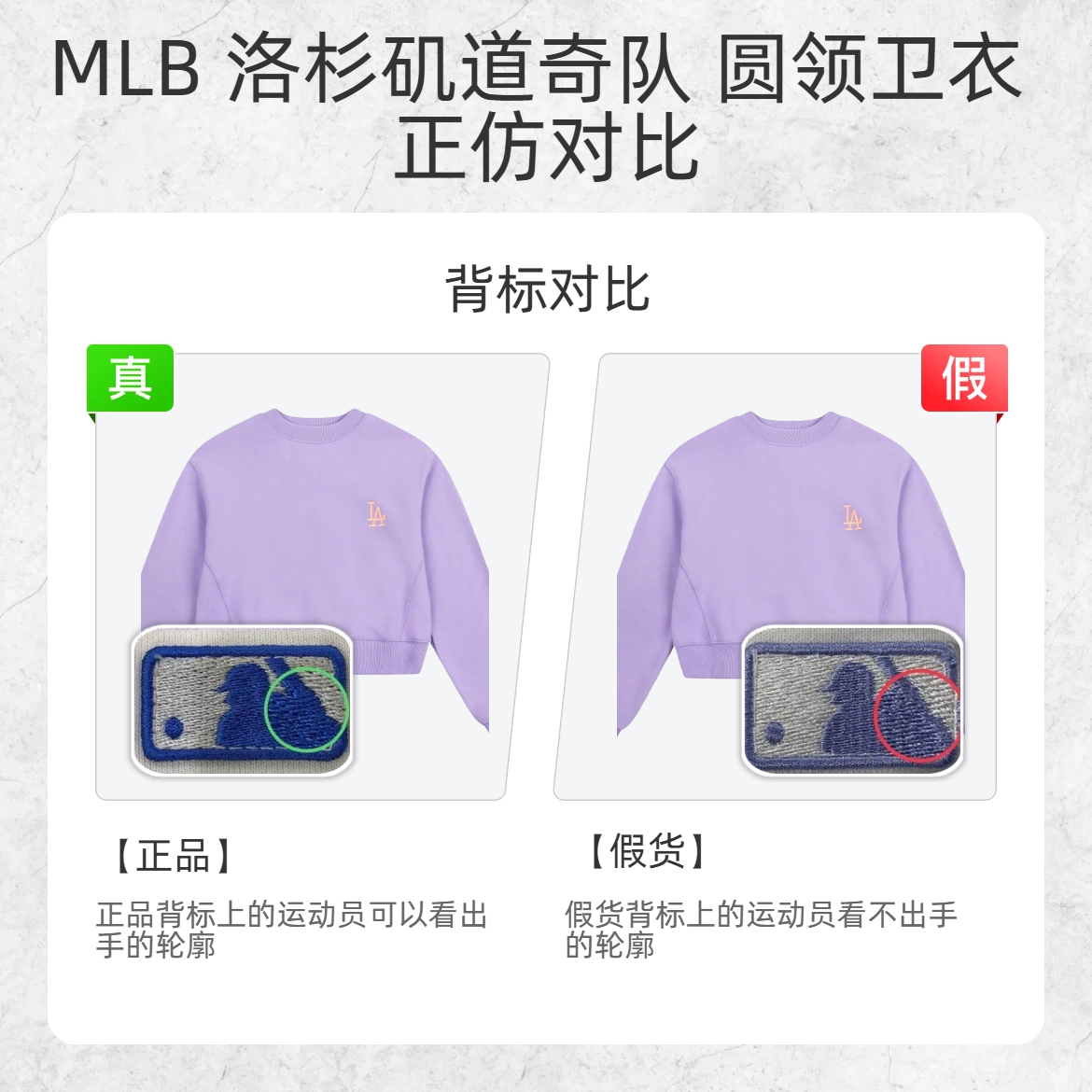 姐妹们!MLB 这件香芋紫卫衣真的美到我心巴上,但假货真的太多了!今天手把手教你 3 招辨真假,避免踩坑! 1️⃣ 背标细节 ✅正品:背标上的棒球运动员,能清晰看到手的轮廓 ❌假货:运动员手部模糊成一团 2️⃣ 领标缝线 ✅正品:领标 “B” 字母边缘缝线很密集 ❌假货:缝线稀疏 3️⃣ 水洗标棒球 ✅正品:水洗标上的棒球图案是圆润饱满的 ❌假货:棒球又扁又塌 这件香芋紫真的又嫩又显白,但...