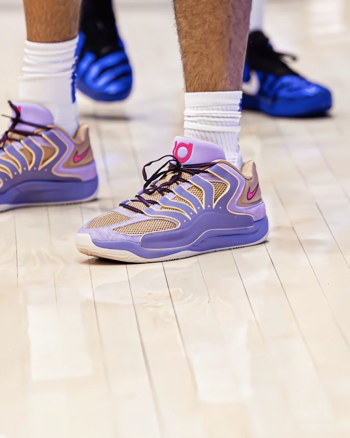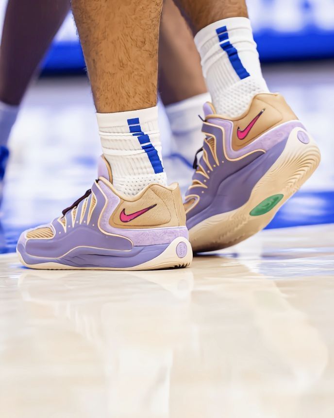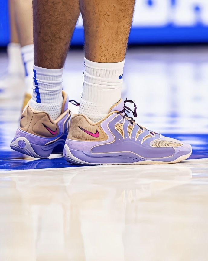 今天杜克暴打印第安纳州立那场,布泽尔这35+12+5+3+3的全能数据直接杀疯了,不过我眼睛全程粘他脚上这双紫KD18了——这“B.A.D”配色实物比官图还能打啊! 先说脚感:看他全场蹦跶29分钟,快攻、抢板、盖帽都没见他皱眉头,KD18这中底反馈是真的顶,软弹但不卸力,突破启动那下很跟脚,我猜缓震极限对大体重也友好。 实战性能这块,鞋面支撑比我想象中稳,网眼+覆层的组合,透气的同时没牺牲...