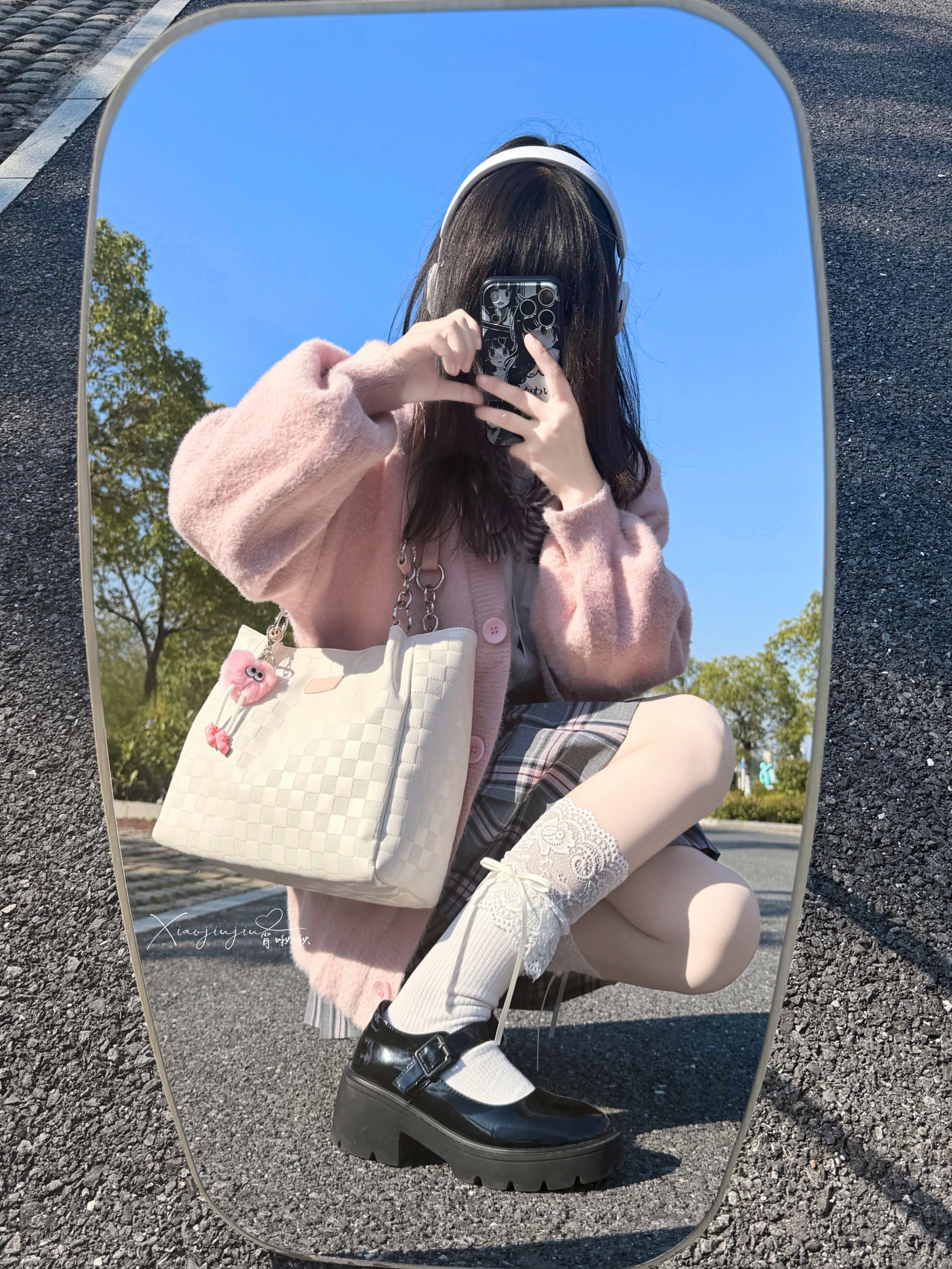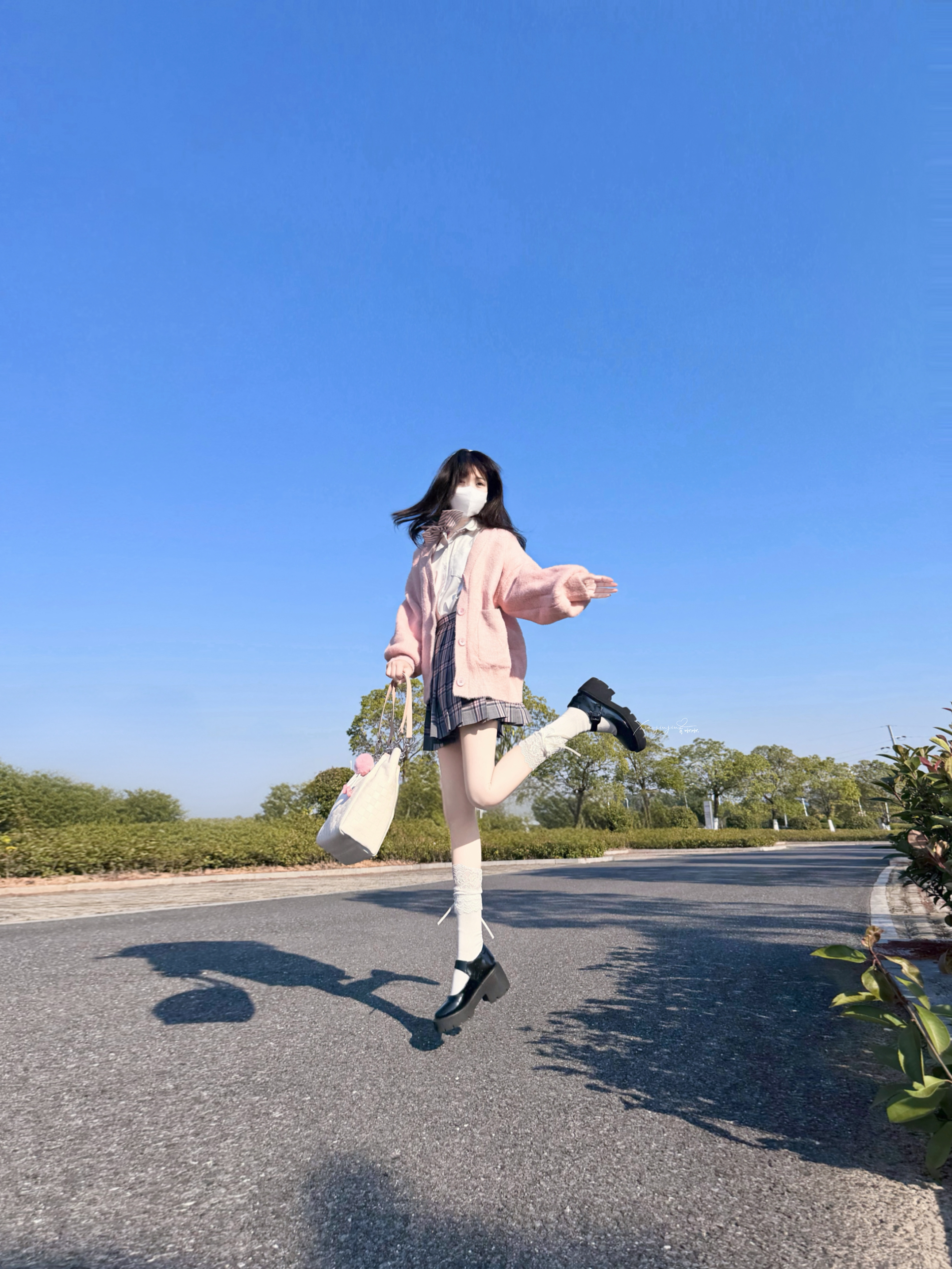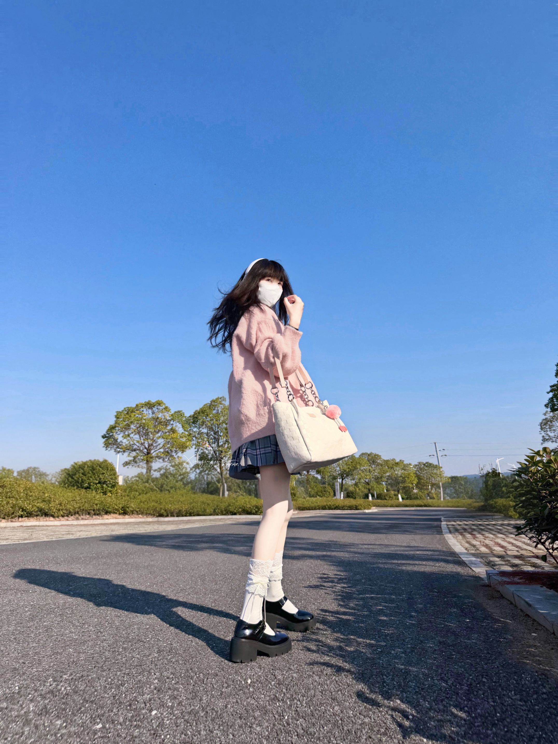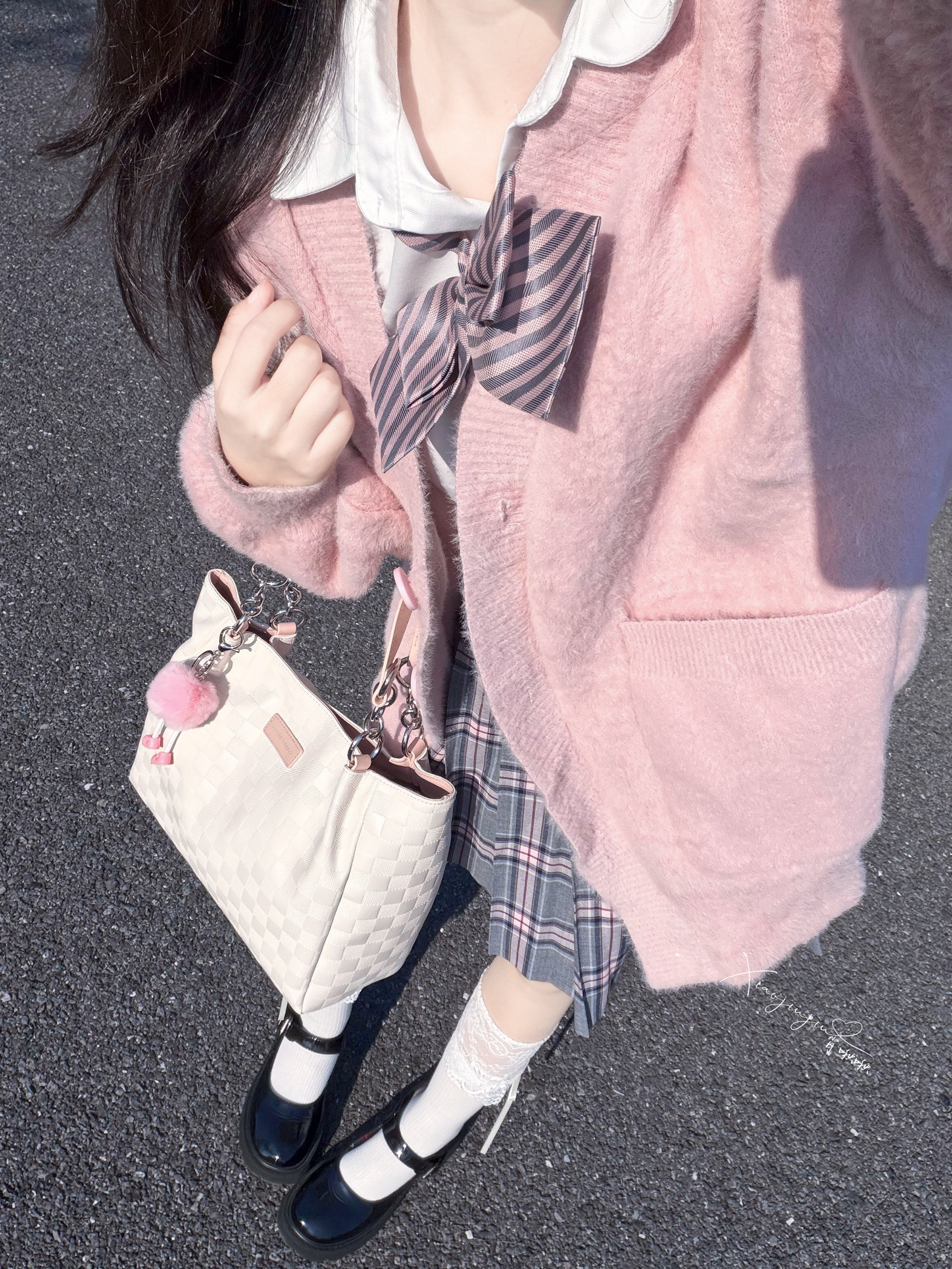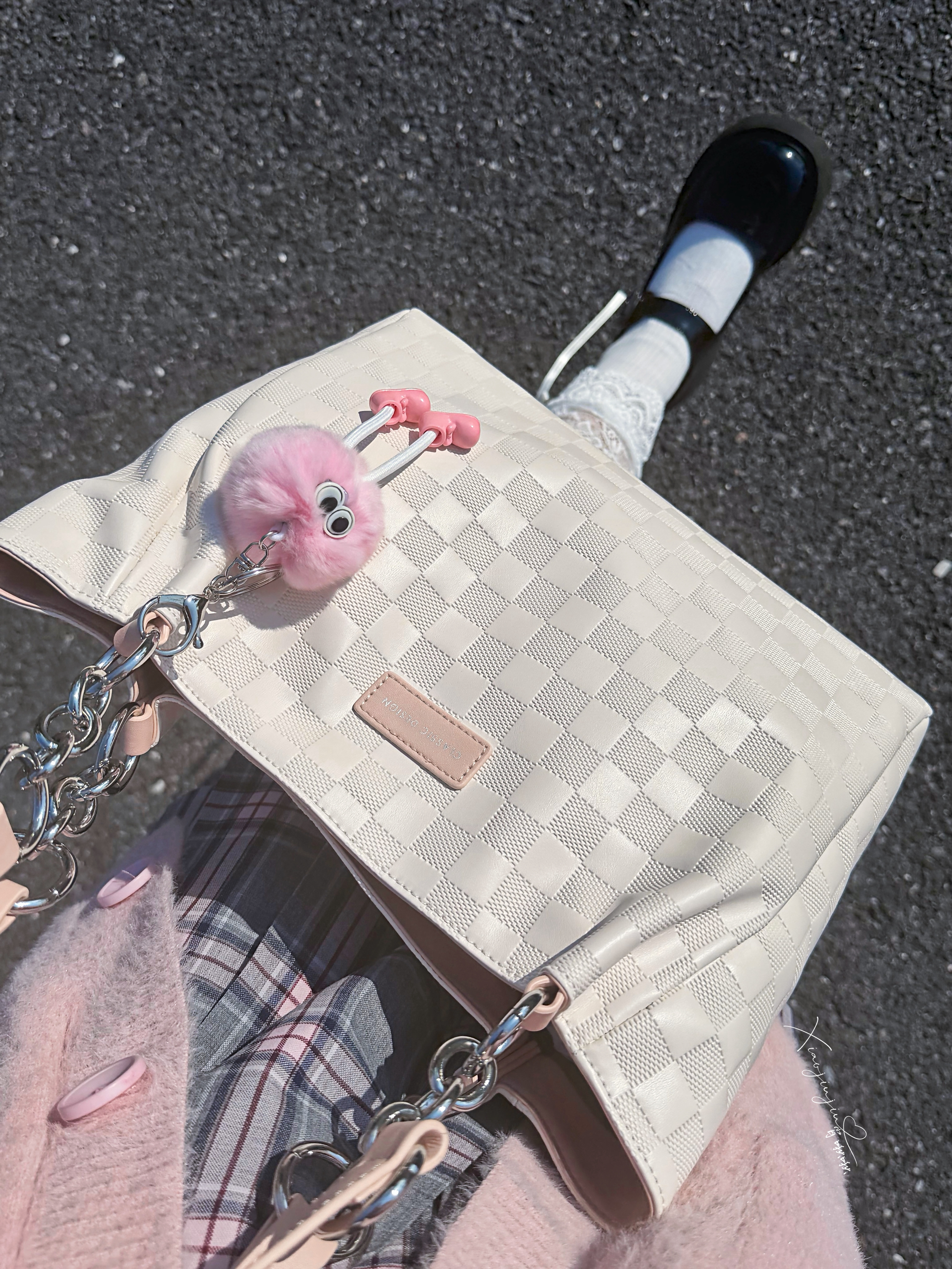可以的 下午阳光☀️明媚,啾啾约了朋友去操场散步 搭配了粉色背包和灰粉格子裙 是甜美俏皮女孩👧 包包容量大,里头我装了ipad和书,没有满 小操场,hin多落叶🍂,阳光照上去hao温暖~