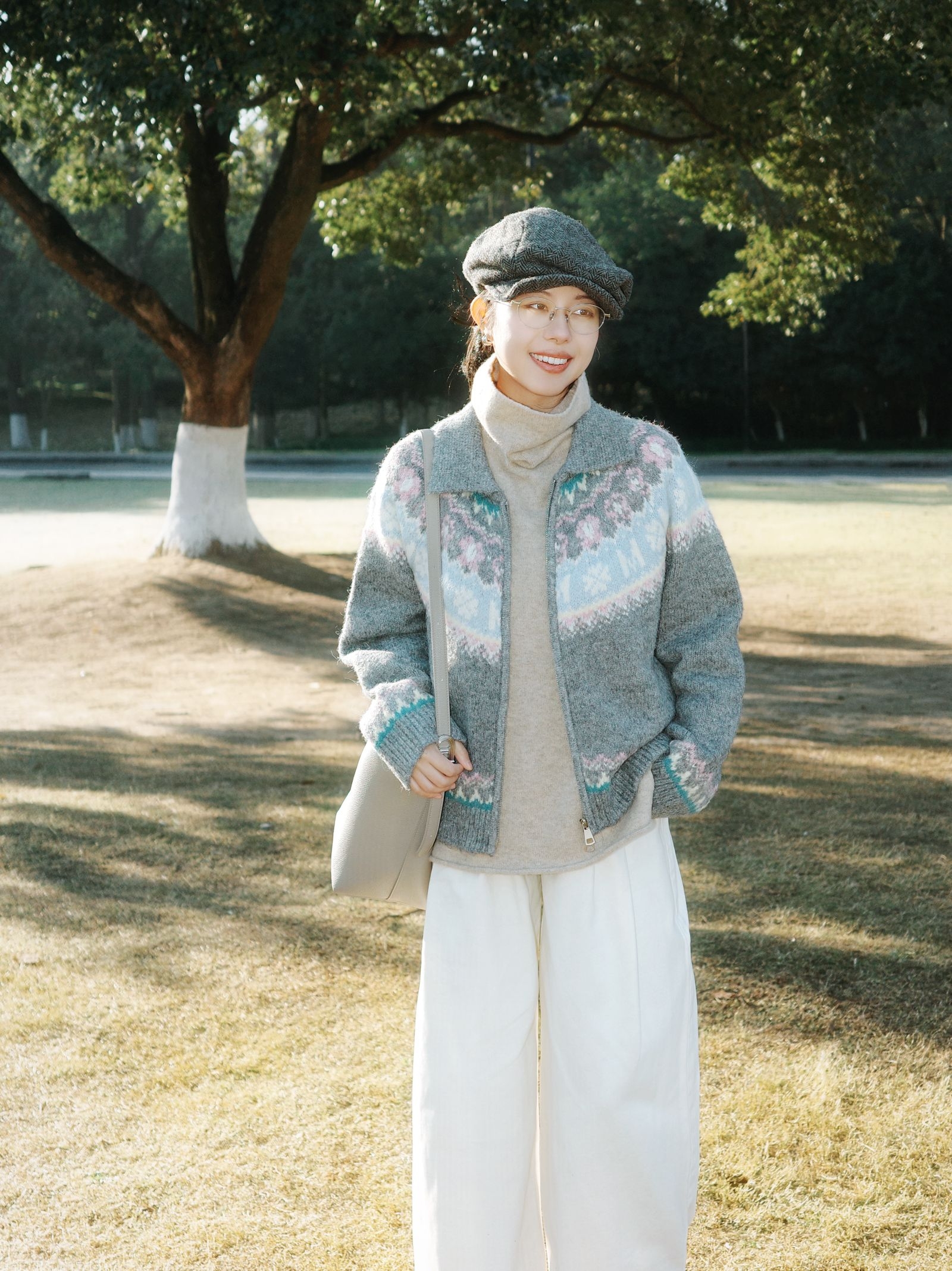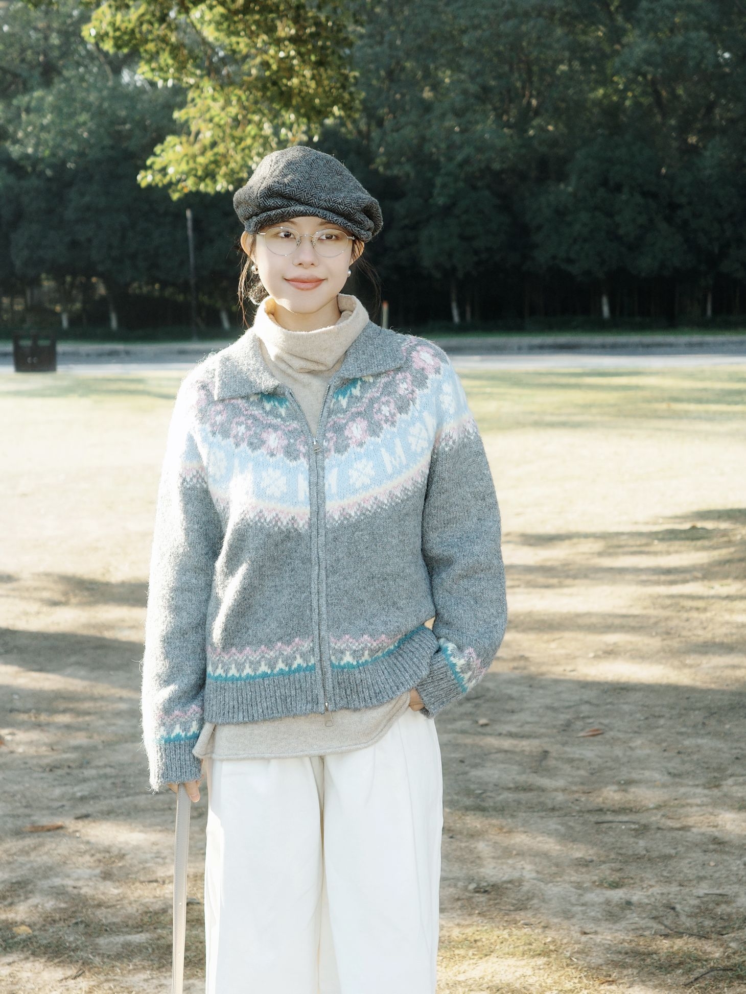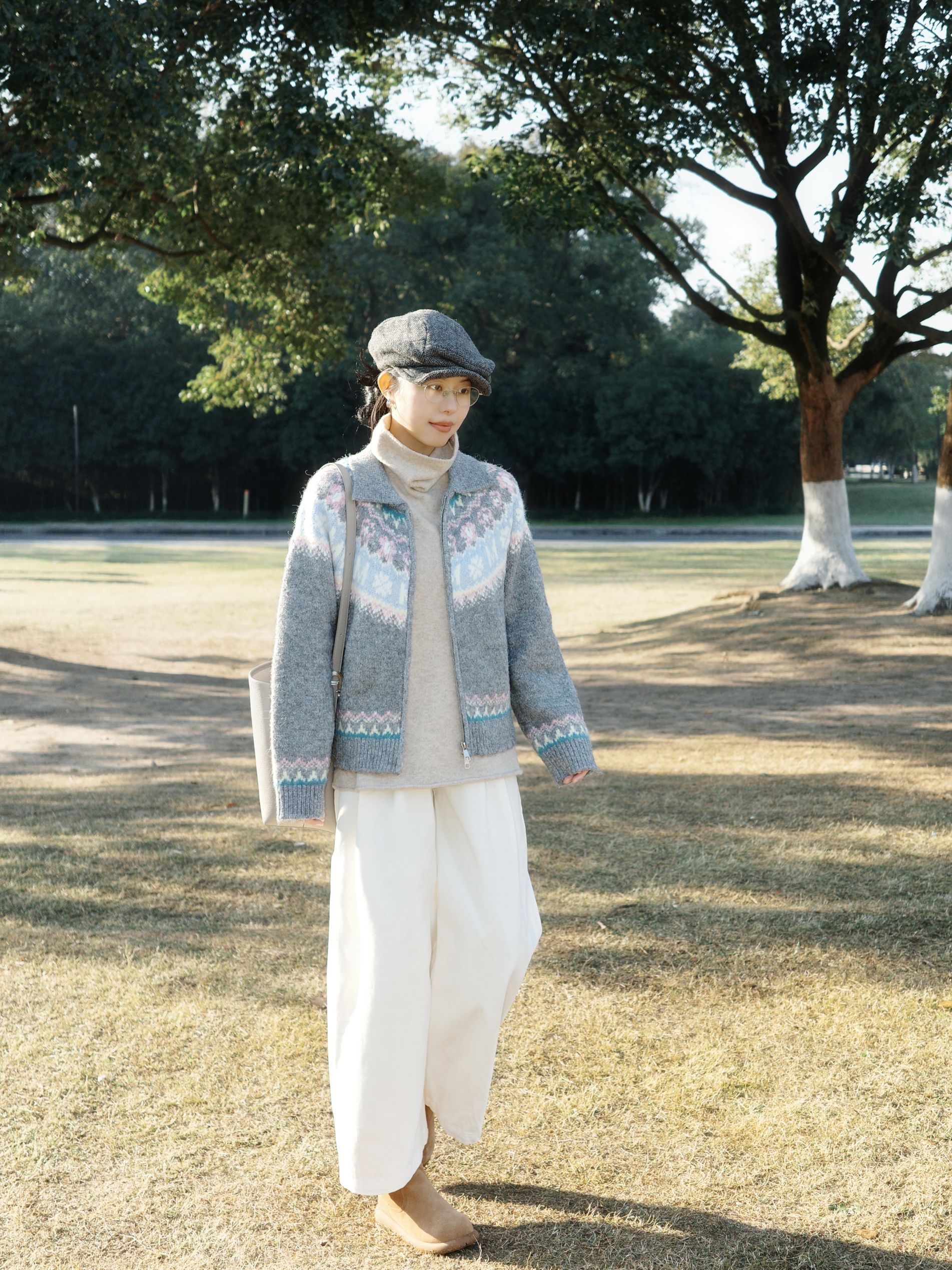 秋日午后去公园晒太阳,阳光透过树叶洒下来,这套搭配从材质到配色都透着文艺感。 费尔岛毛衣外套软乎乎的,花纹带着点复古北欧感,下身搭配白色阔腿裤,藏肉还显腿长。内搭是卡其色的高领毛衣,再配上棕色报童帽,复古感瞬间拉满。 整体灰蓝、米白、暖棕的配色在秋天里特别柔和,让身体和心情一起放松下来~