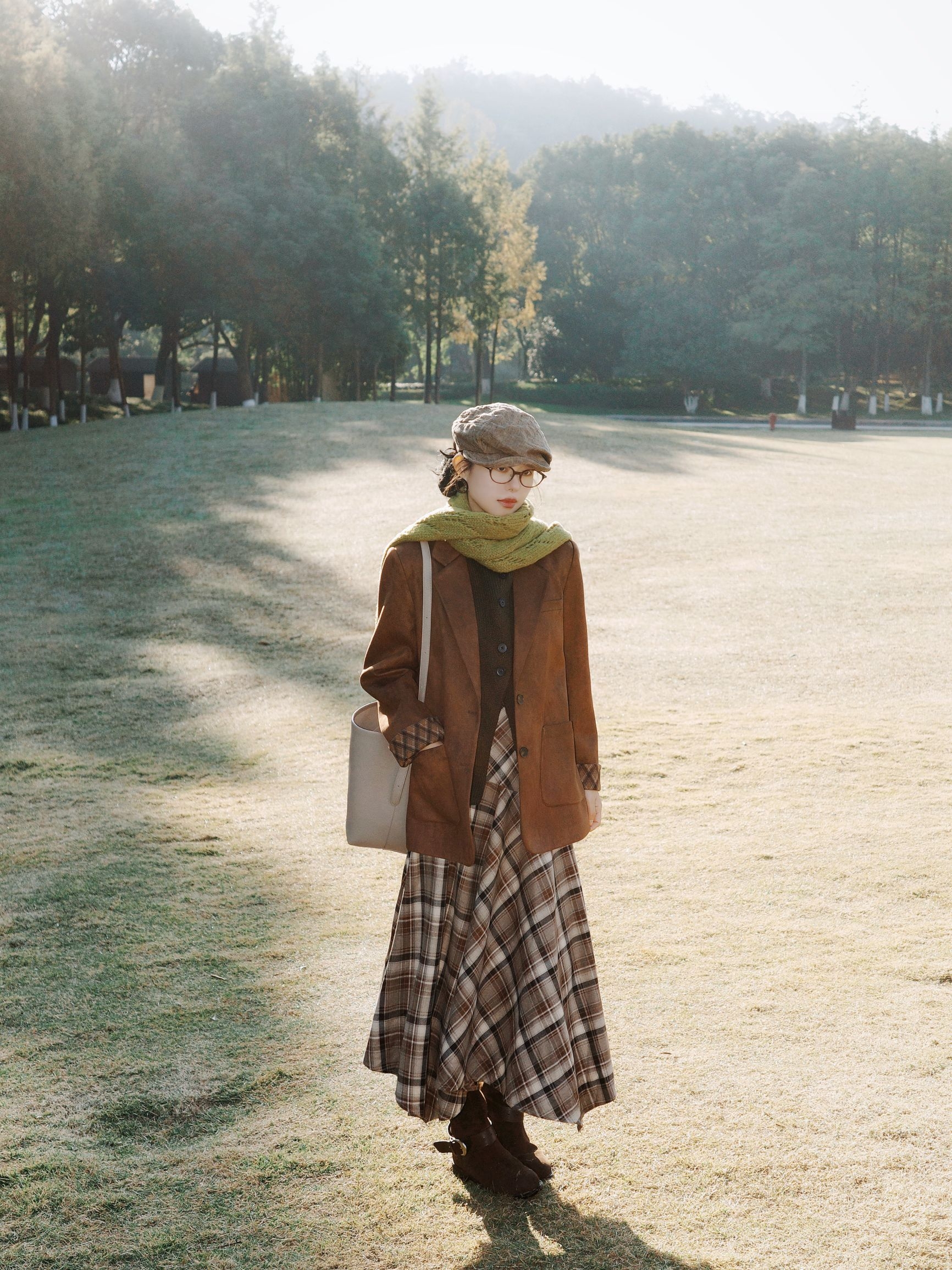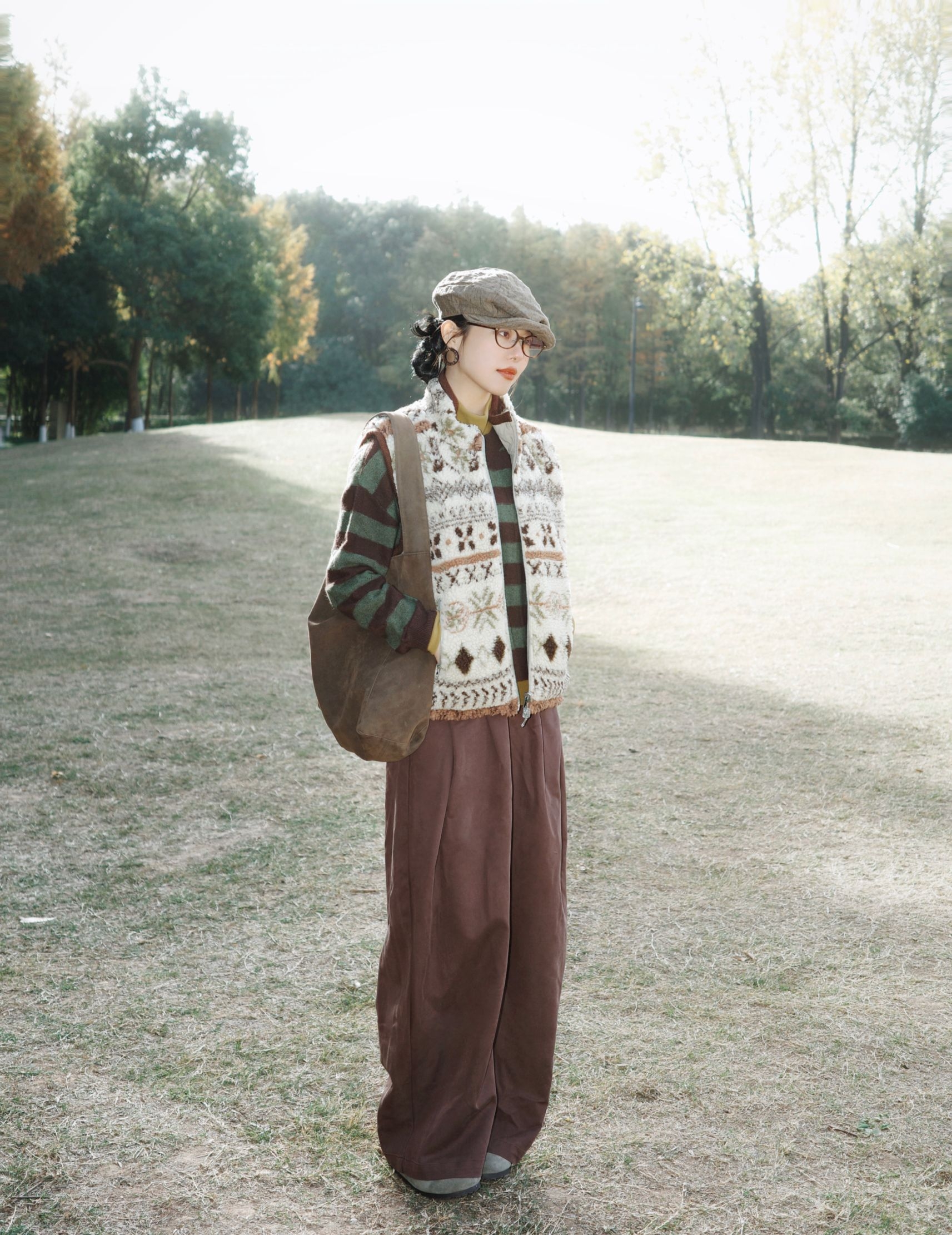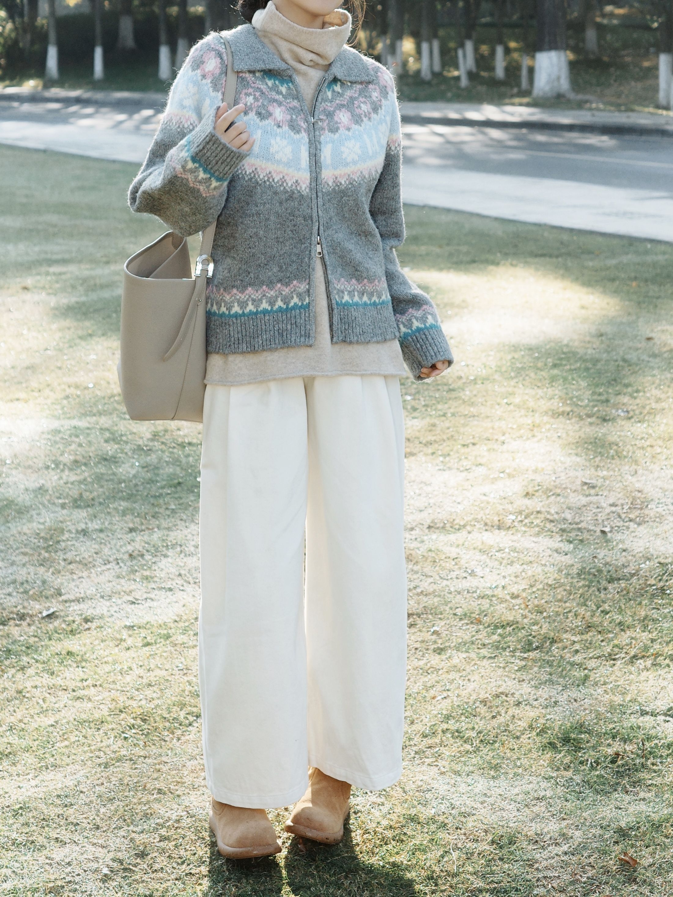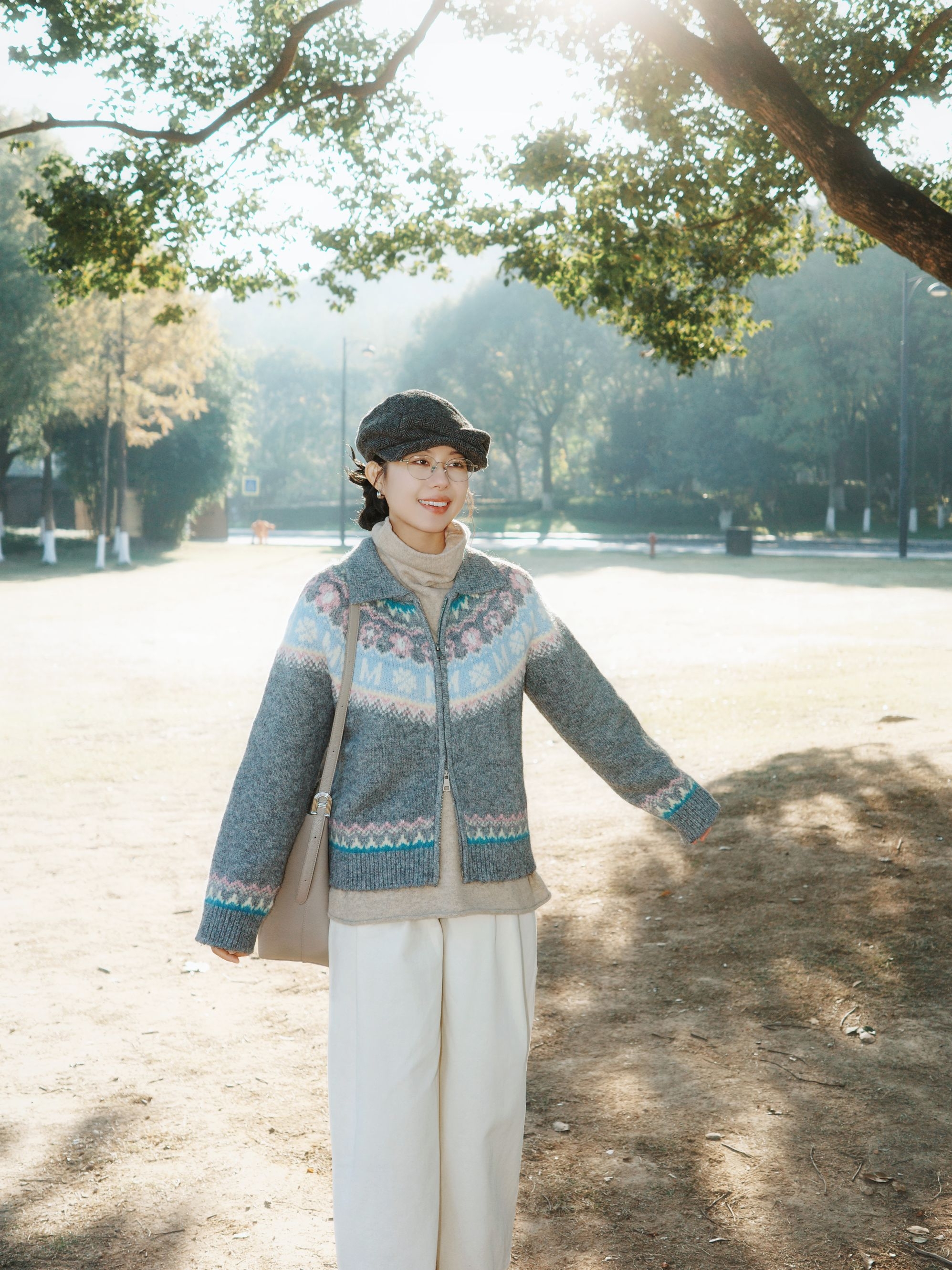 秋日午后去公园晒太阳,阳光透过树叶洒下来,这套搭配从材质到配色都透着文艺感。 费尔岛毛衣外套软乎乎的,花纹带着点复古北欧感,下身搭配白色阔腿裤,藏肉还显腿长。内搭是卡其色的高领毛衣,再配上棕色报童帽,复古感瞬间拉满。 整体灰蓝、米白、暖棕的配色在秋天里特别柔和,让身体和心情一起放松下来~
