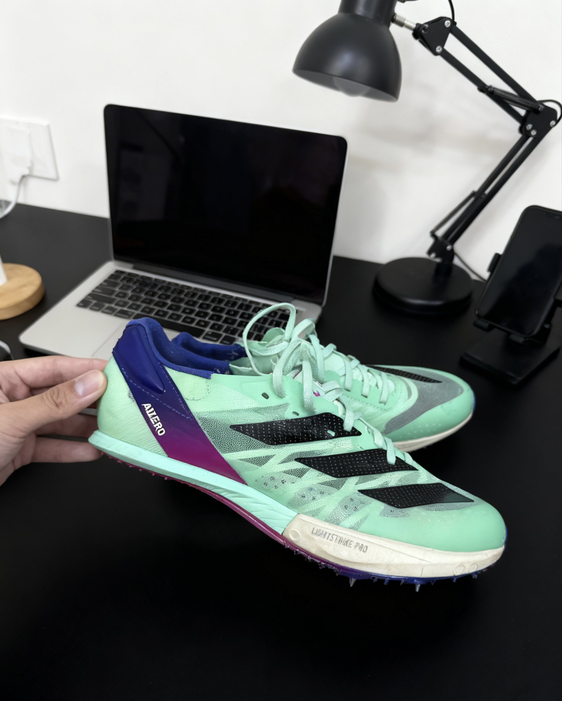 这双薄荷绿Adizero钉鞋在田径场贼扎眼,撞色直接拉满回头率。脚感贴地裹得紧,反馈快,起跑抓地够狠,加速那股劲儿给得特爽。