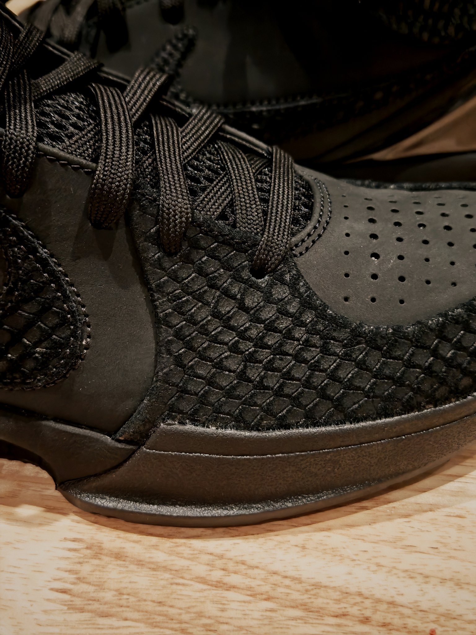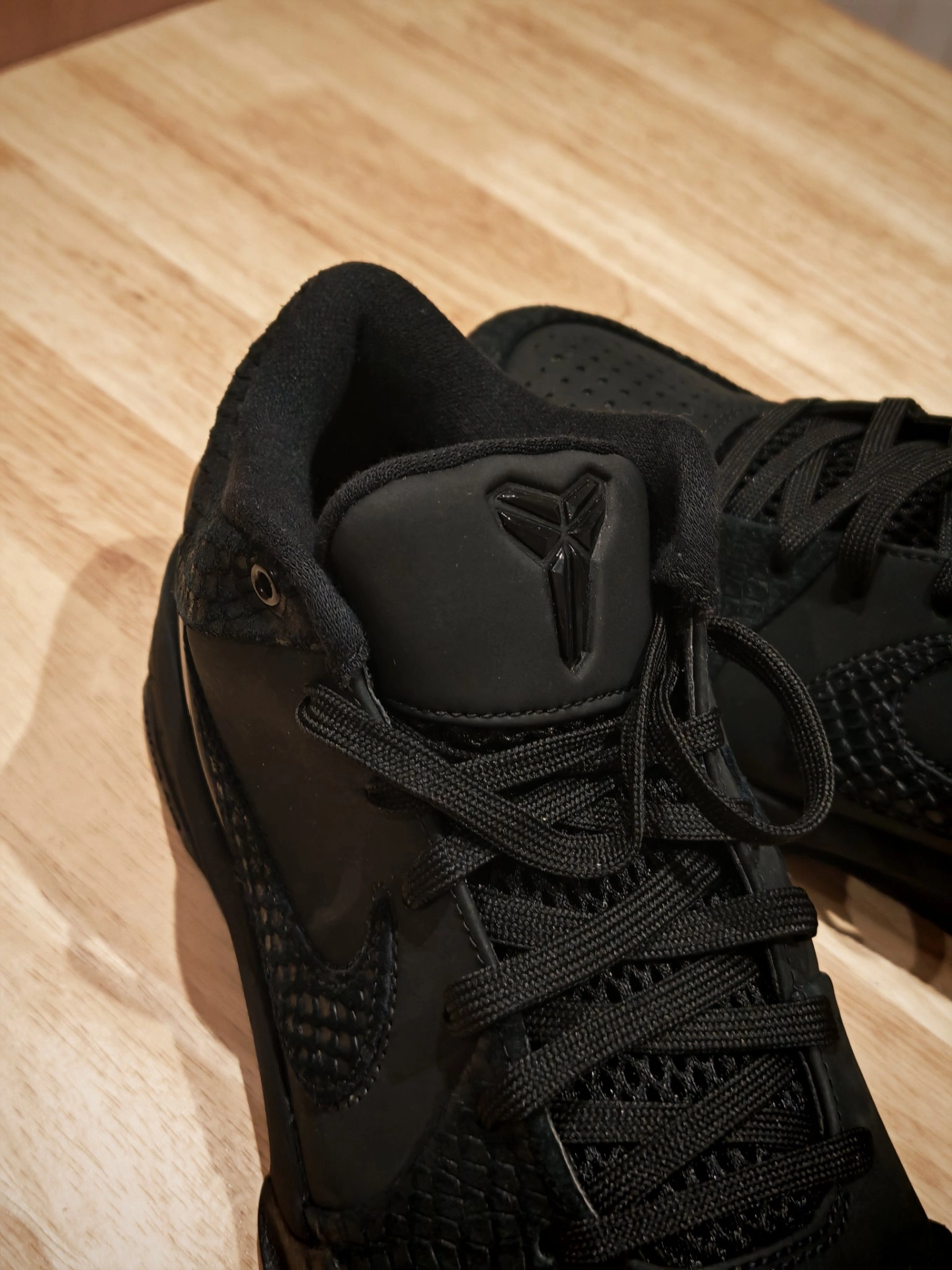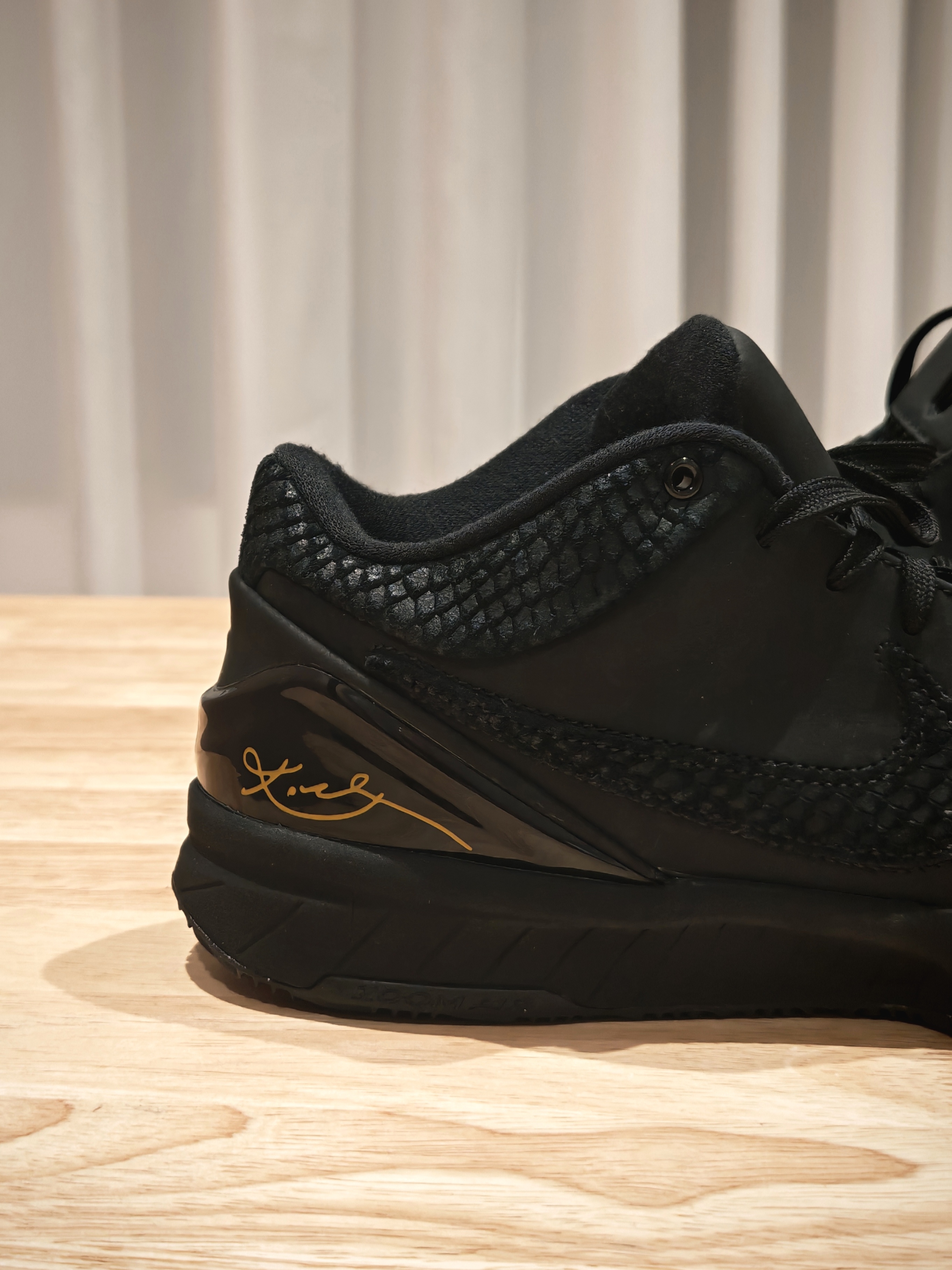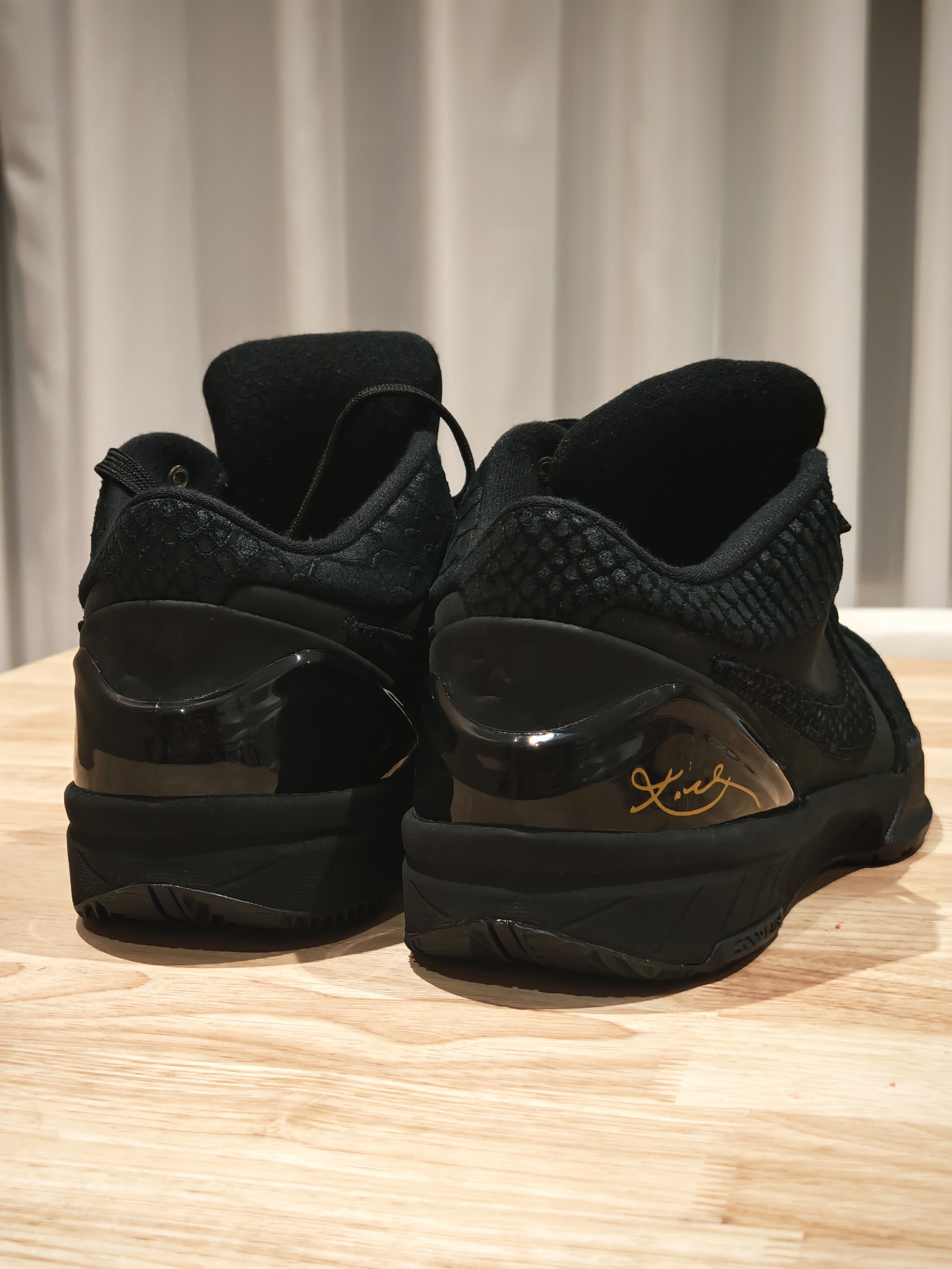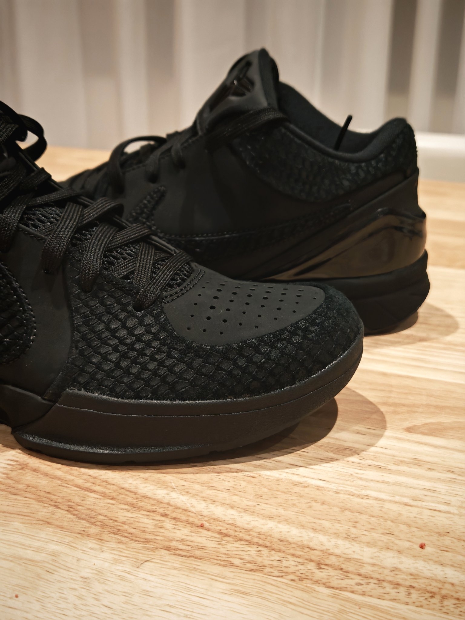 我这双科比4 “黑曼巴”,真是越看越觉得不像双篮球鞋了,更像个小雕塑。 不知道你们有没有仔细看过它的鞋面?那种黑还不是单纯的一种黑,底下是有点绒感的麂皮,上面盖着一层带着蛇鳞纹路的皮,两种黑色叠在一起,质感一下就上来了。后跟那块TPU上有个烫金的科比签名,小小一点金,在黑鞋面上特别提神。 我穿它打过几次球,该有的性能都在线,包裹、响应都没得说。但现在更多时候,我反而喜欢把它当日常鞋穿。低帮设计...