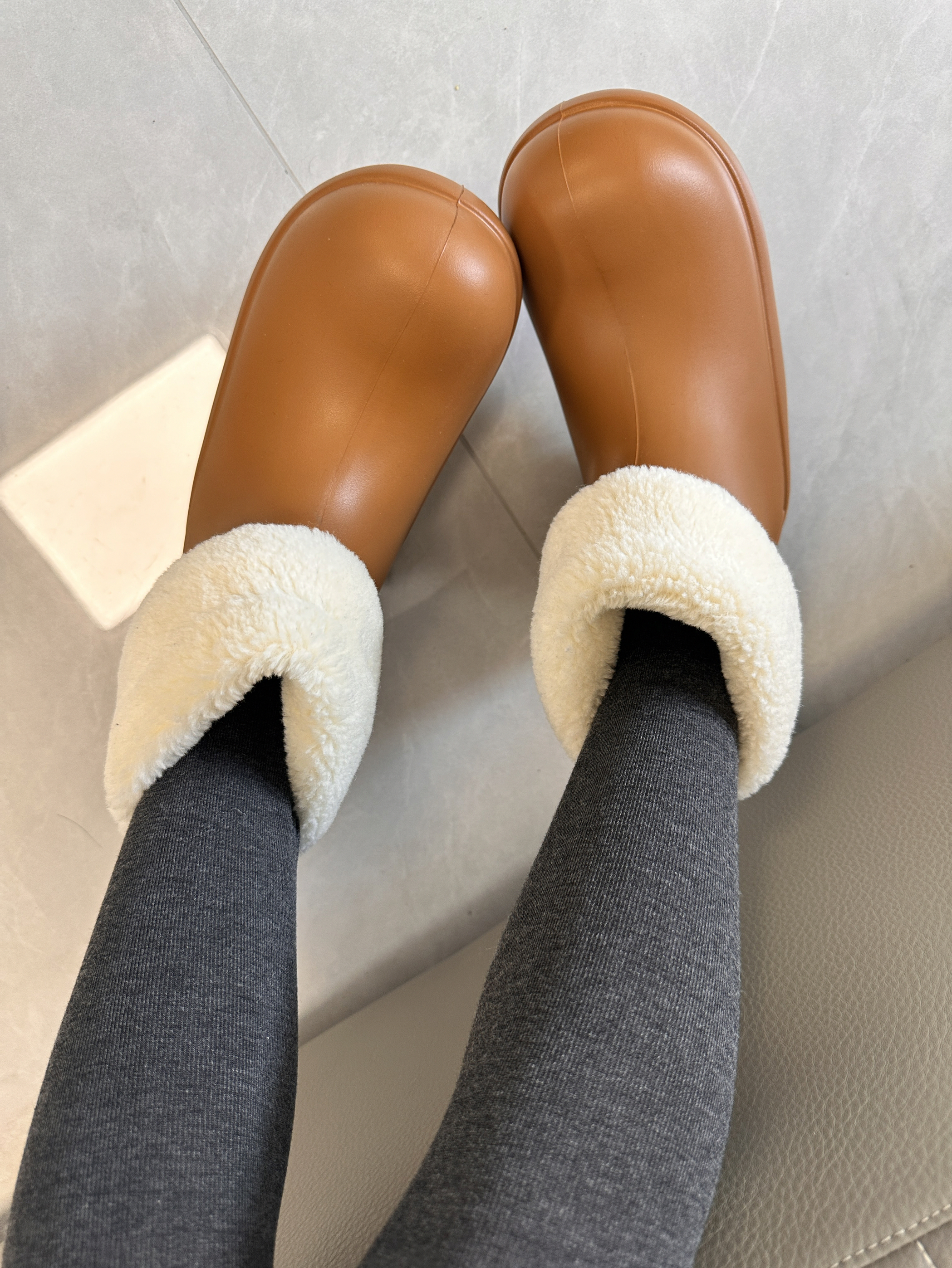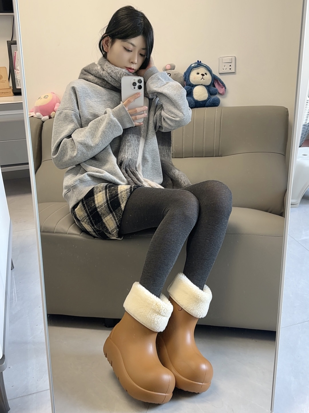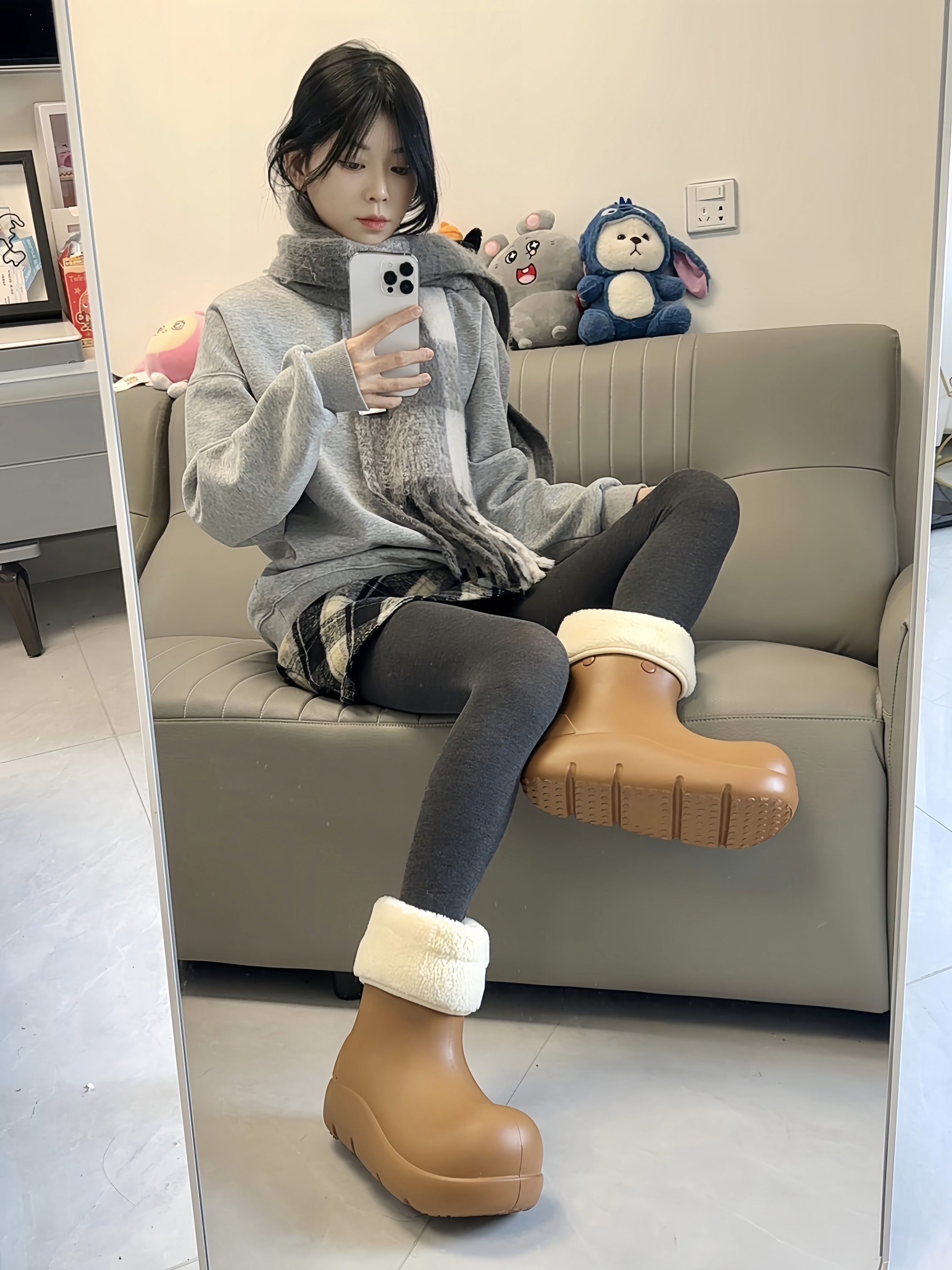 今天穿的这套真的戳中我💖 灰卫衣+格纹短裙+灰裤袜 慵懒又带点甜 配上这双Beys栗色小丑靴直接封神! 羊羔毛翻边看着就暖和 🦶上脚包裹感很强 不用担心漏风 鞋底防滑 雨雪天也不怕✌️ 这个冬天有了它 温暖又有型😎