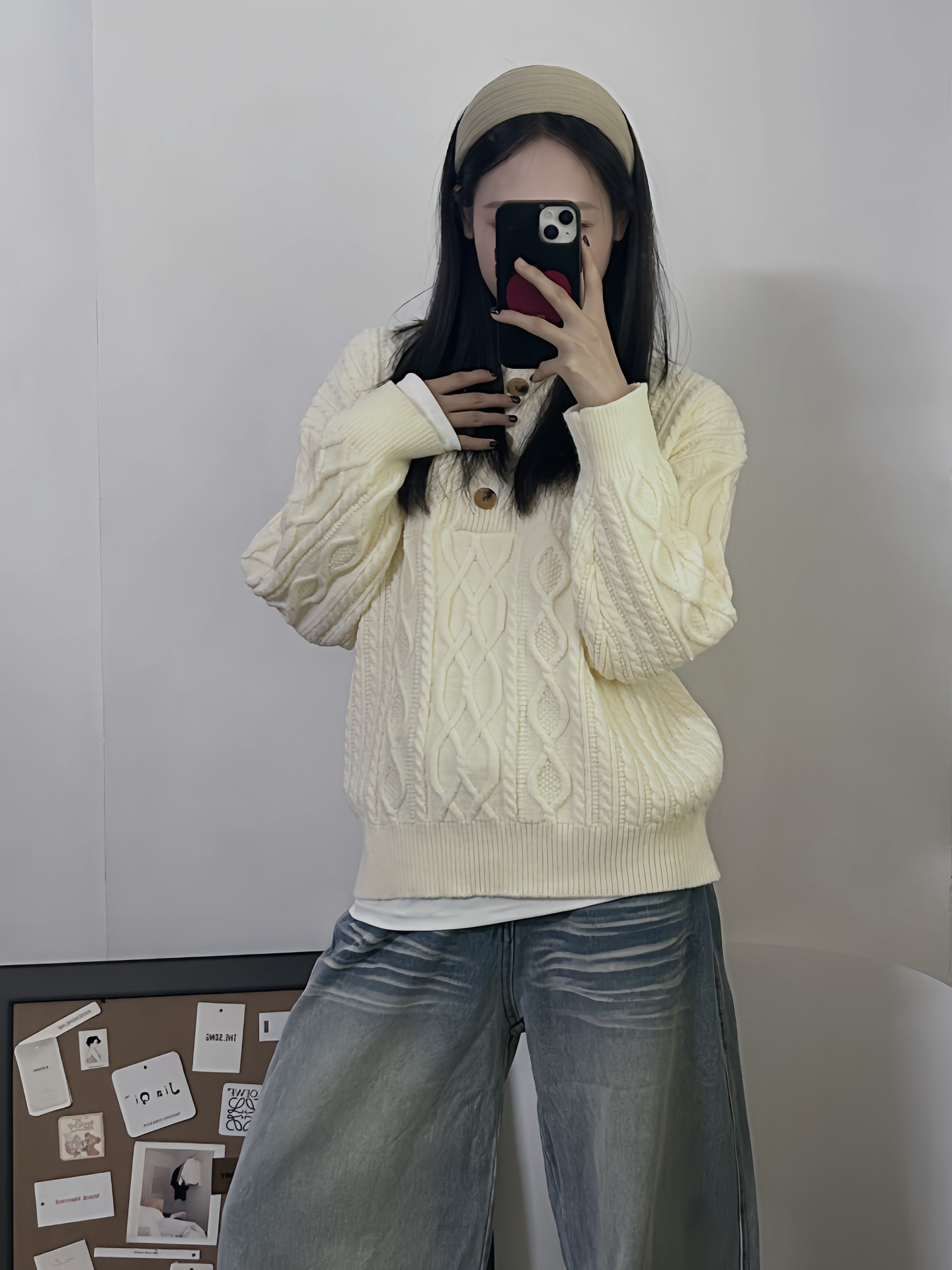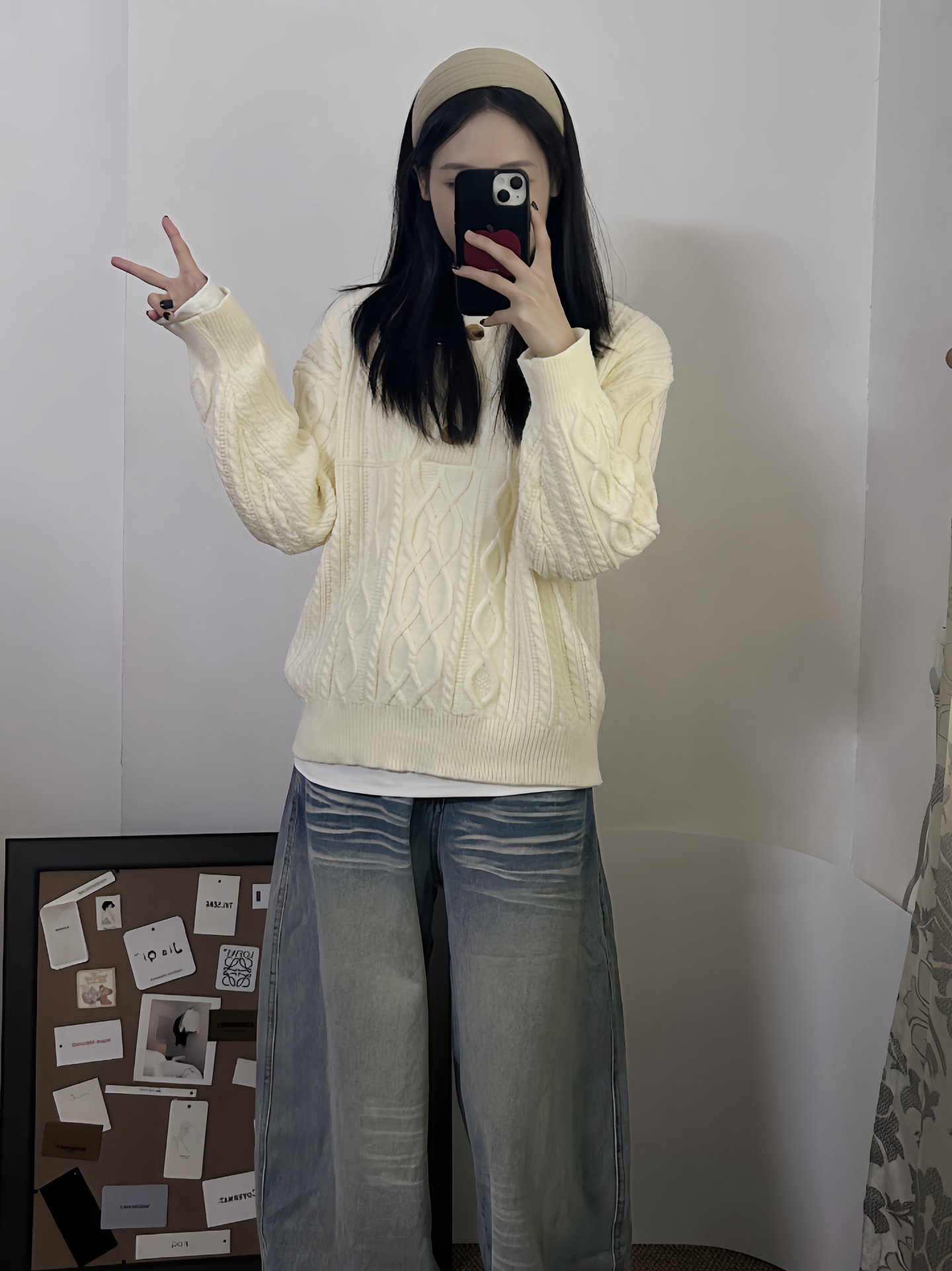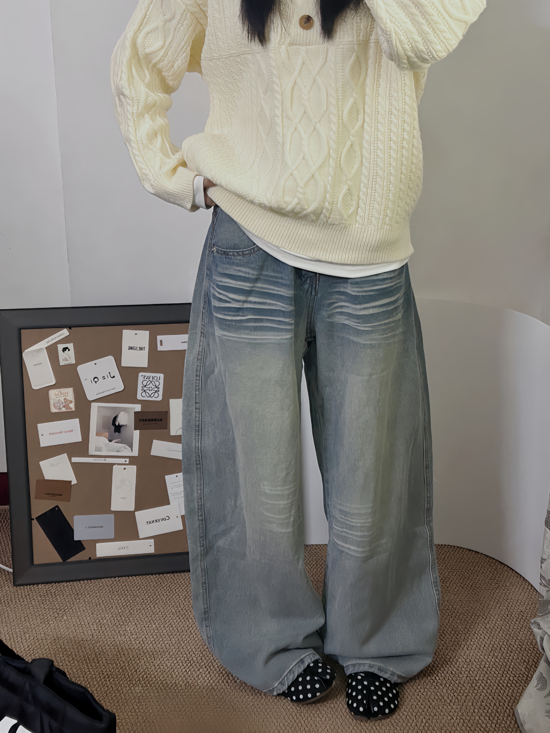 奶白麻花毛衣裹在身上像抱了团软乎乎的云 松松垮垮的旧洗水牛仔裤是老熟人了 踩双波点袜踩出点不刻意的俏皮 没什么“精心搭配”的小心思 就是把衣柜里最称心意的几件捞出来往身上套 舒服得能晃悠着逛完整个下午