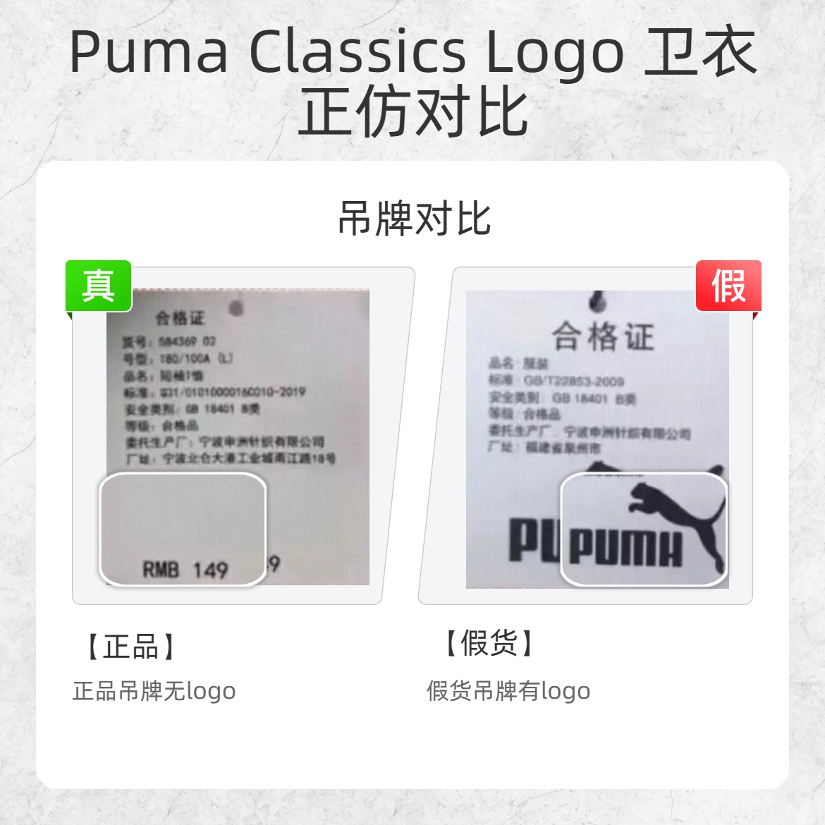 谁还没被假 Puma 坑过?!今天手把手教你 3 分钟辨真伪,网购党 / 学生党必看👇 🔍【吊牌细节】 ✅正品:吊牌只有合格证信息,无 Logo / 无多余图案,价格标注清晰 ❌假货:吊牌乱加 Puma 标 🐆【Logo 细节】 1️⃣ 耳朵:正品耳朵夹角小;假货耳朵夹角大 2️⃣ 五官:正品有明显的眼睛 / 鼻子弧度;假货五官模糊成一团 3️⃣ 商标:正品 Logo 右下角有商标;假货无商标 ...