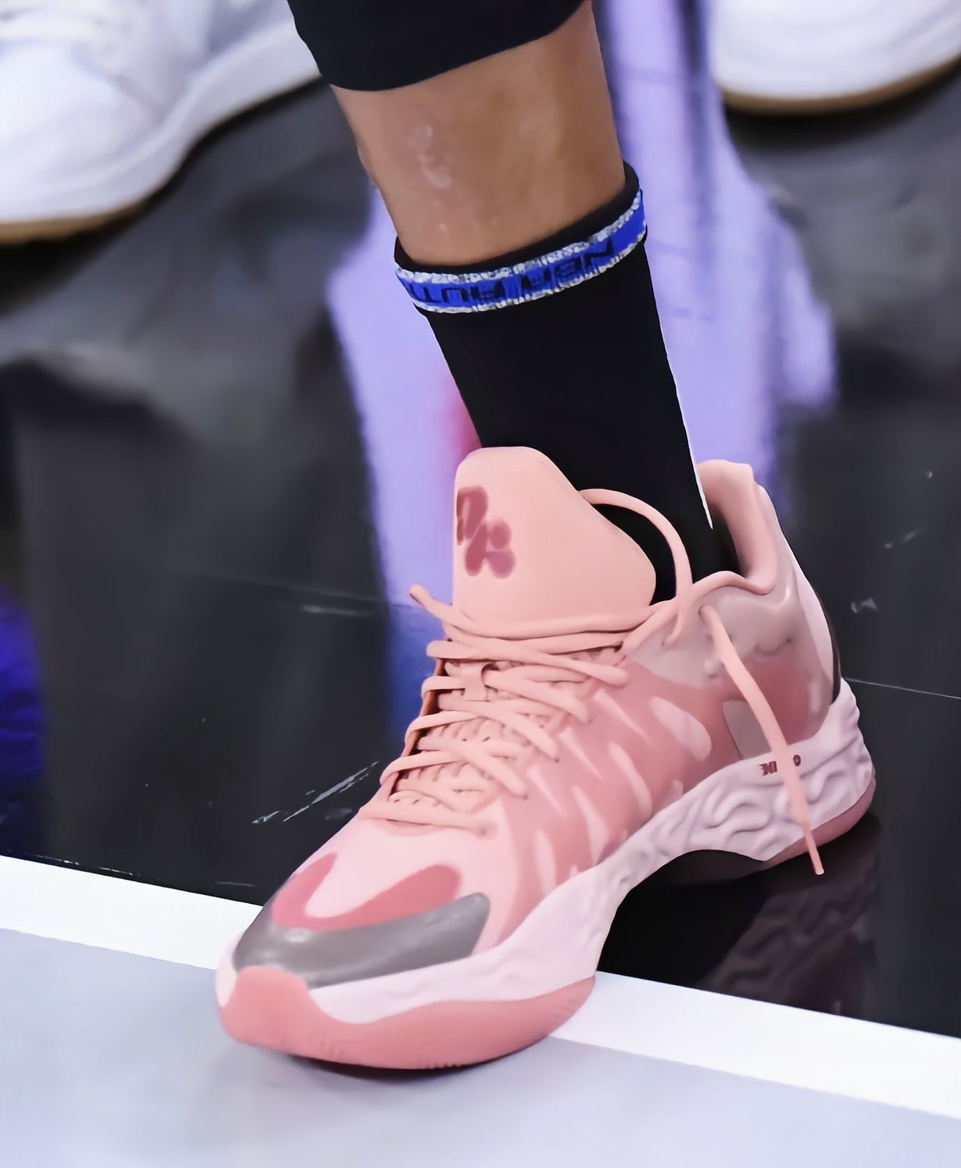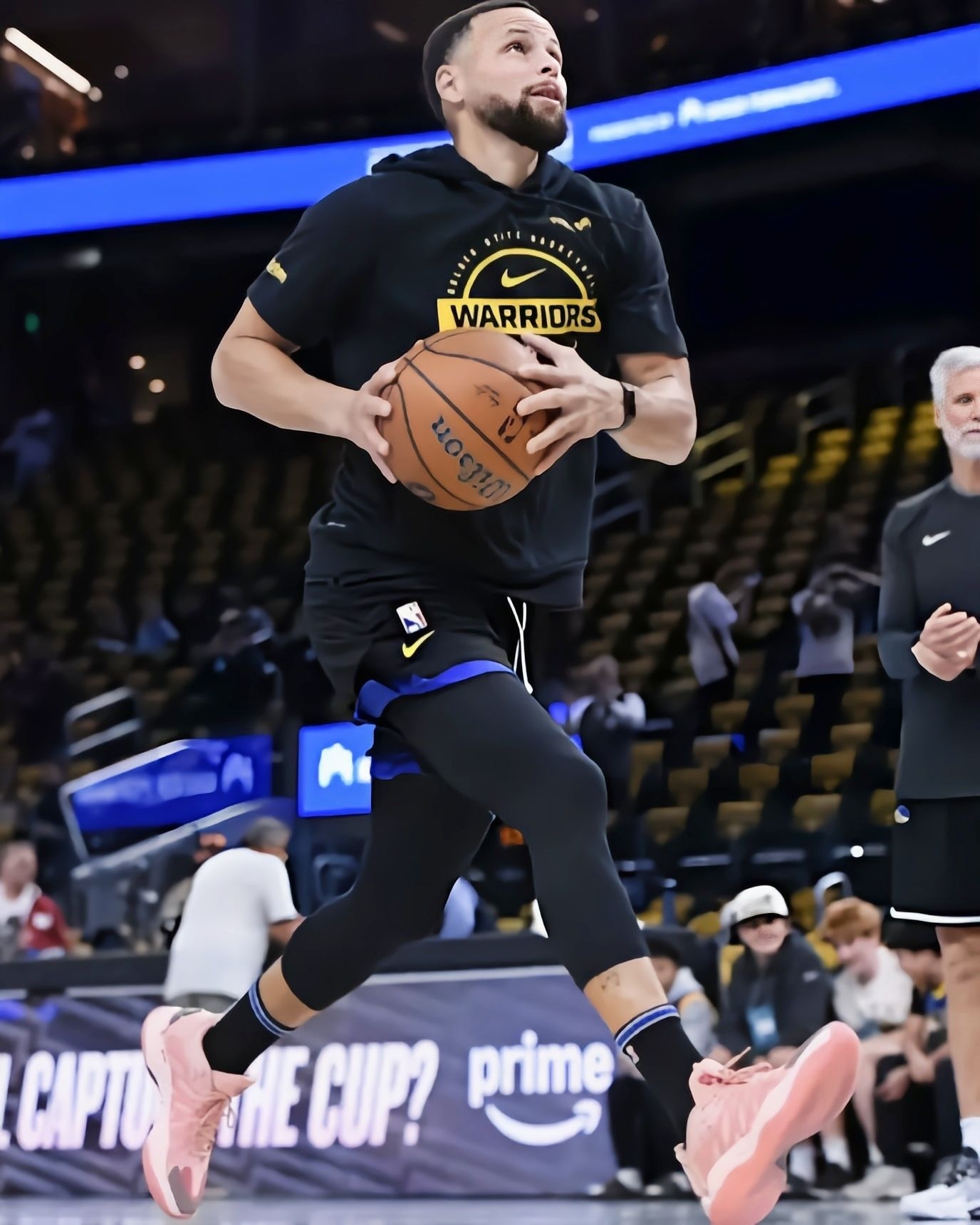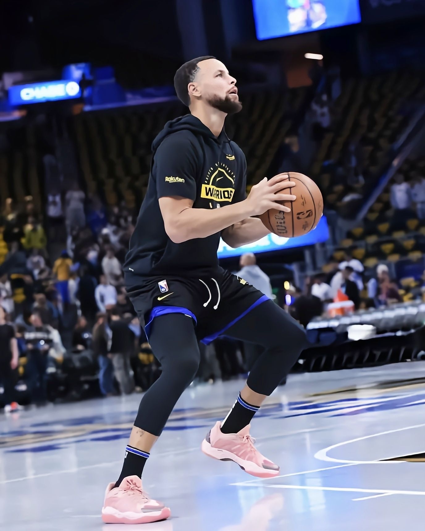 11月27日讯 今日NBA杯小组赛勇士主场迎战火箭的比赛。 赛前热身里,库里直接上脚了泰瑞斯-哈利伯顿的初代签名鞋“Hibiscus”——这双粉调配色,刚好是今天正式发售的新款。 从外观和配置来看,这鞋的重量看着就轻,据说单只不到400g,跑起来应该不会有拖沓感。前掌用的是NITRO泡棉,贴地感应该挺强,突破启动的反馈速度大概率不会慢;后掌的缓震厚度看着适中,跳投落地的缓冲应该能接住。 鞋...