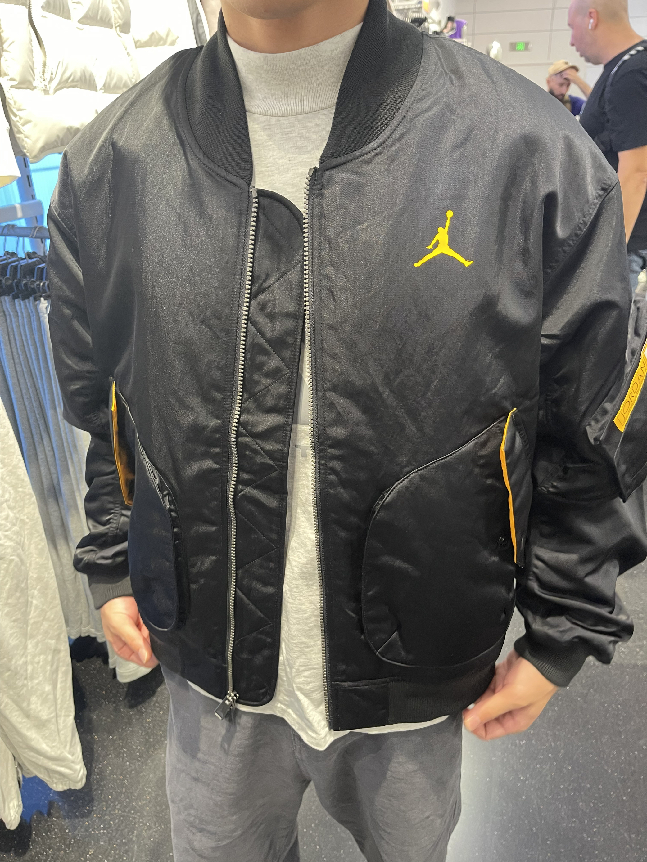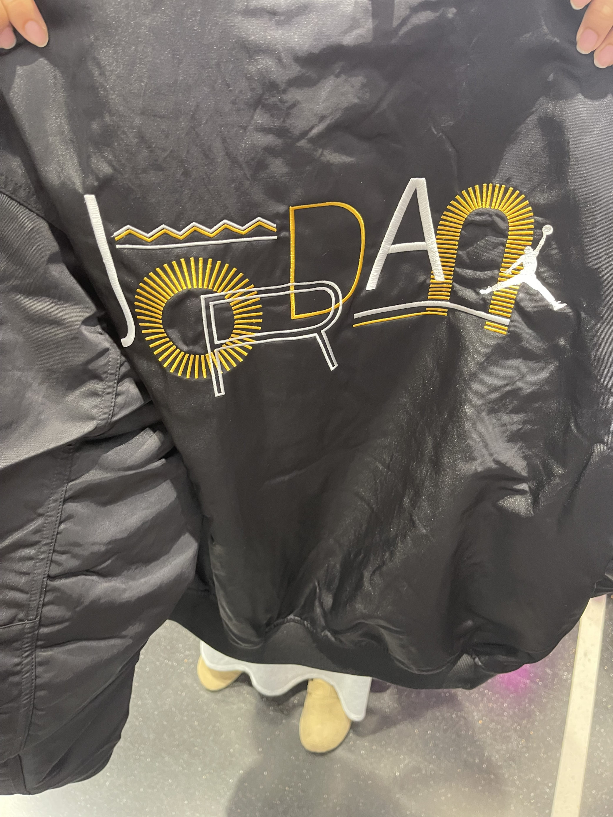 黑+金撞色:经典AJ飞人标用大学金刺绣 版型:落肩+短款剪裁,宽松不臃肿,内搭卫衣/T恤都能叠出层次感 工装口袋:胸前斜插袋+臂部贴袋,机能感直接拉满❤️