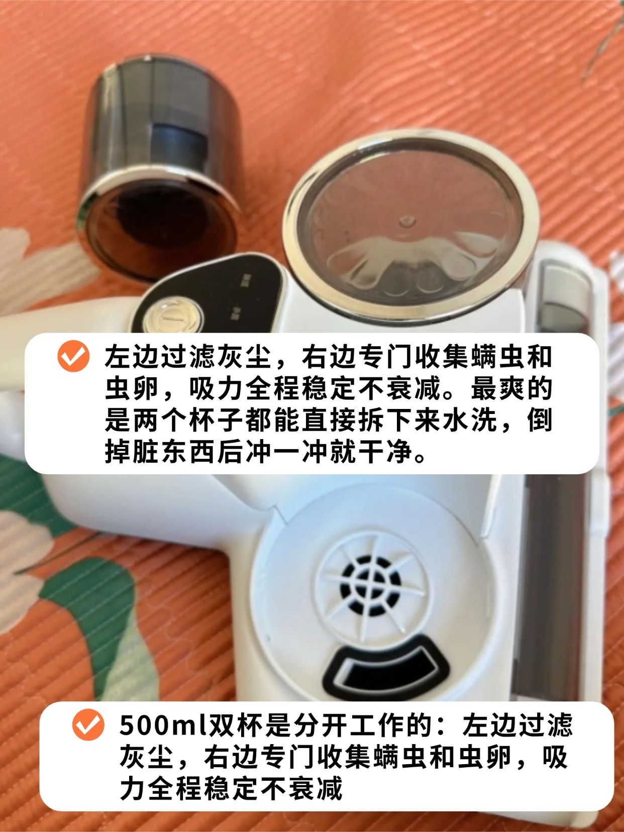 双杯设计和七重过滤也戳中我!500毫升的透明尘杯能清楚看到战果,倒垃圾的时候尘螨分离不会扬尘,HEPA滤网还能水洗,不用频繁买耗材,长期用超省钱。南方姐妹更要冲,55-60℃热风循环除螨还能除潮,梅雨季吸完的被子摸起来都是干爽的,再也没有黏糊糊的潮气了~