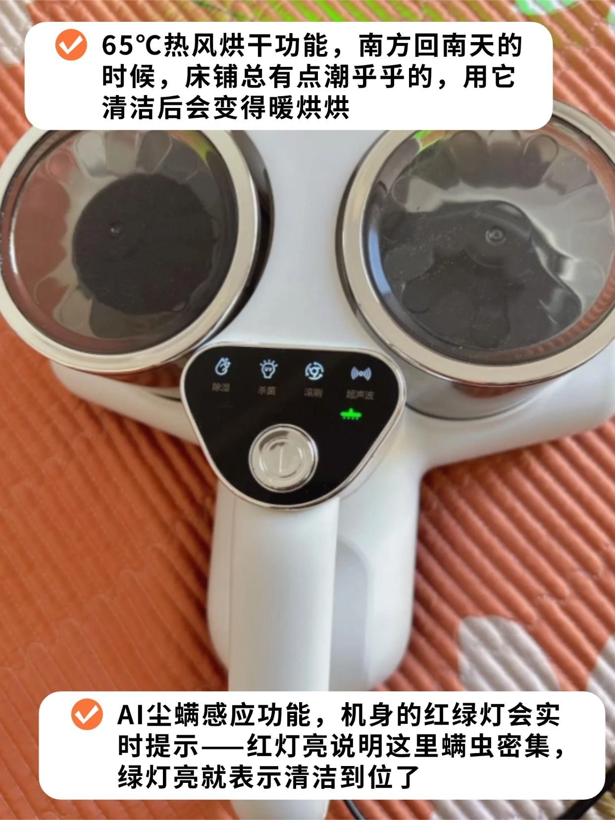 必须夸爆它的“除螨组合拳”!12000次/分钟的高频拍打真不是盖的,能深扎进75cm的床垫里把虫卵震出来,再用15000Pa大吸力全吸走。最绝的是那个尘螨感应灯,枕头底下一推就变红,吸到绿灯亮才敢停,不用瞎忙活真的太省心了✅