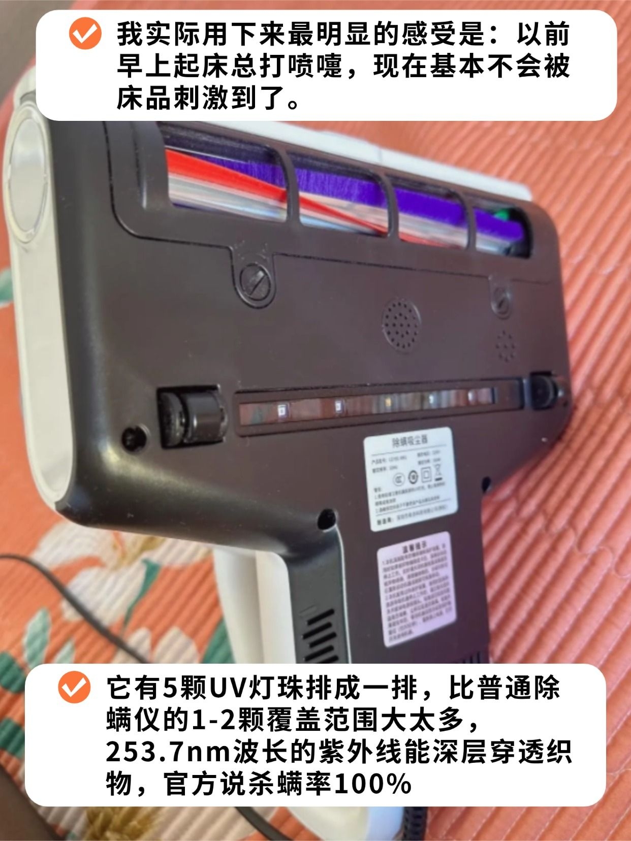 用了大半年,后背的红点没了,鼻炎发作都少了,现在每周吸一次床品成了固定习惯。300多的价格能有这配置,真的是平价除螨仪里的天花板了!养宠党、鼻炎星人、南方姐妹直接闭眼冲,不好用你来骂我!