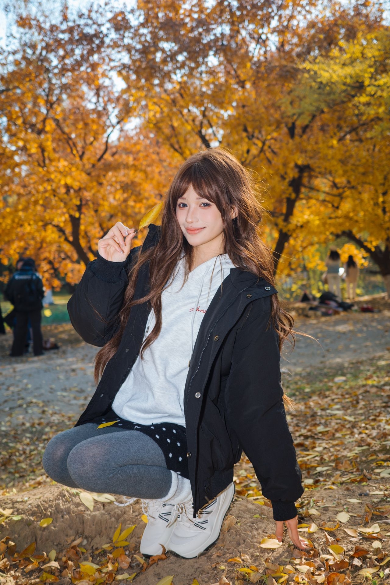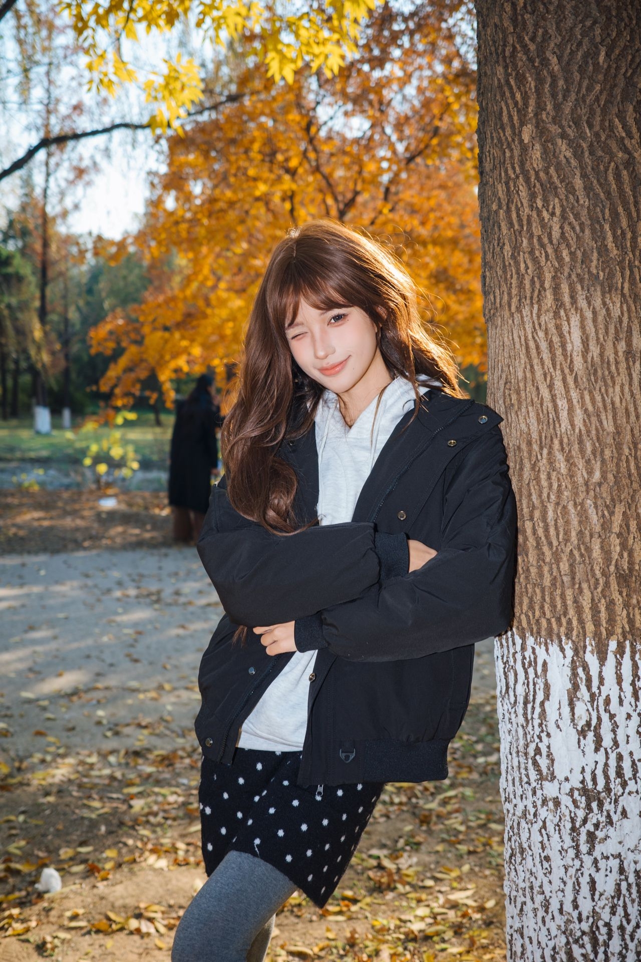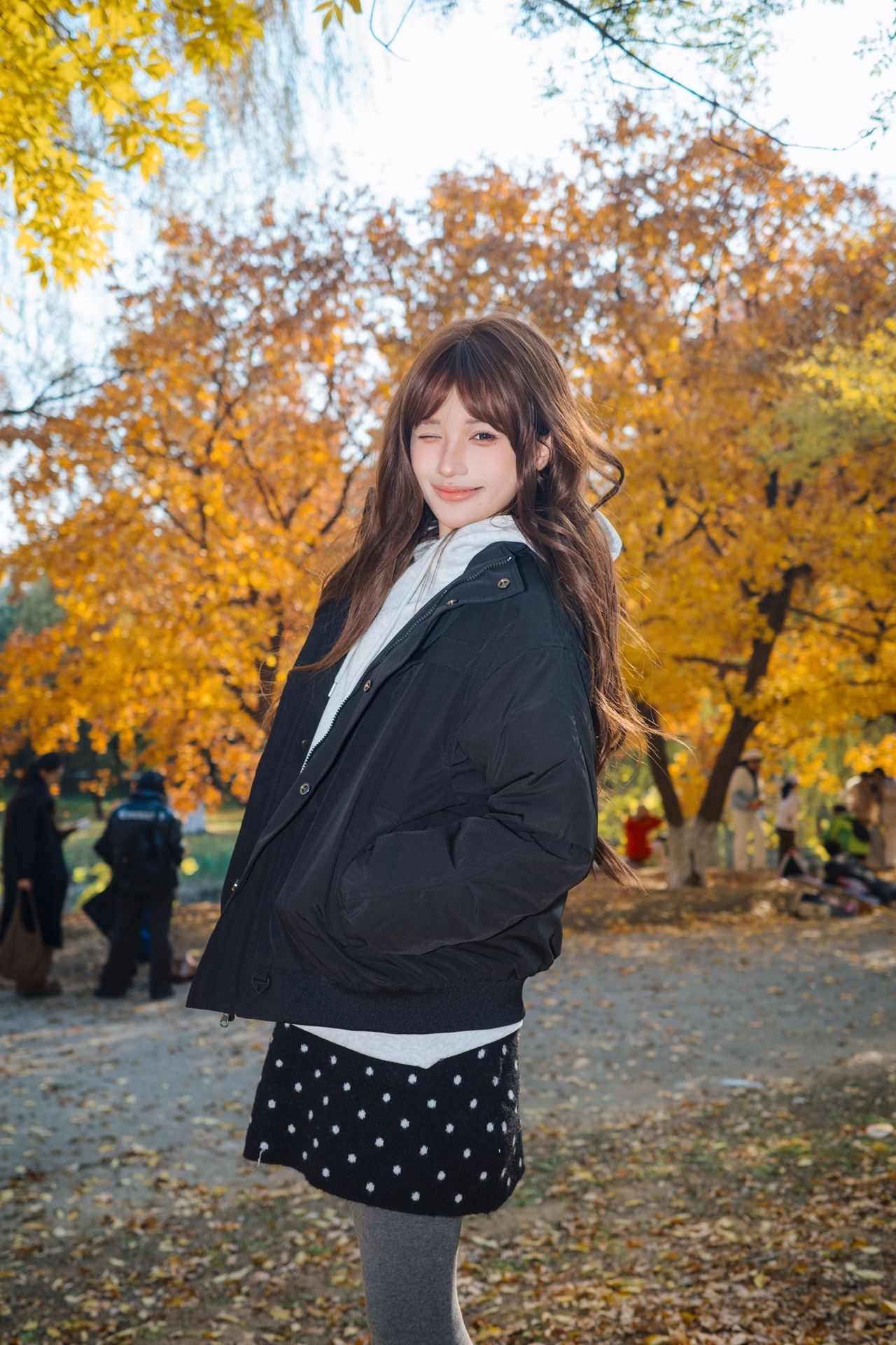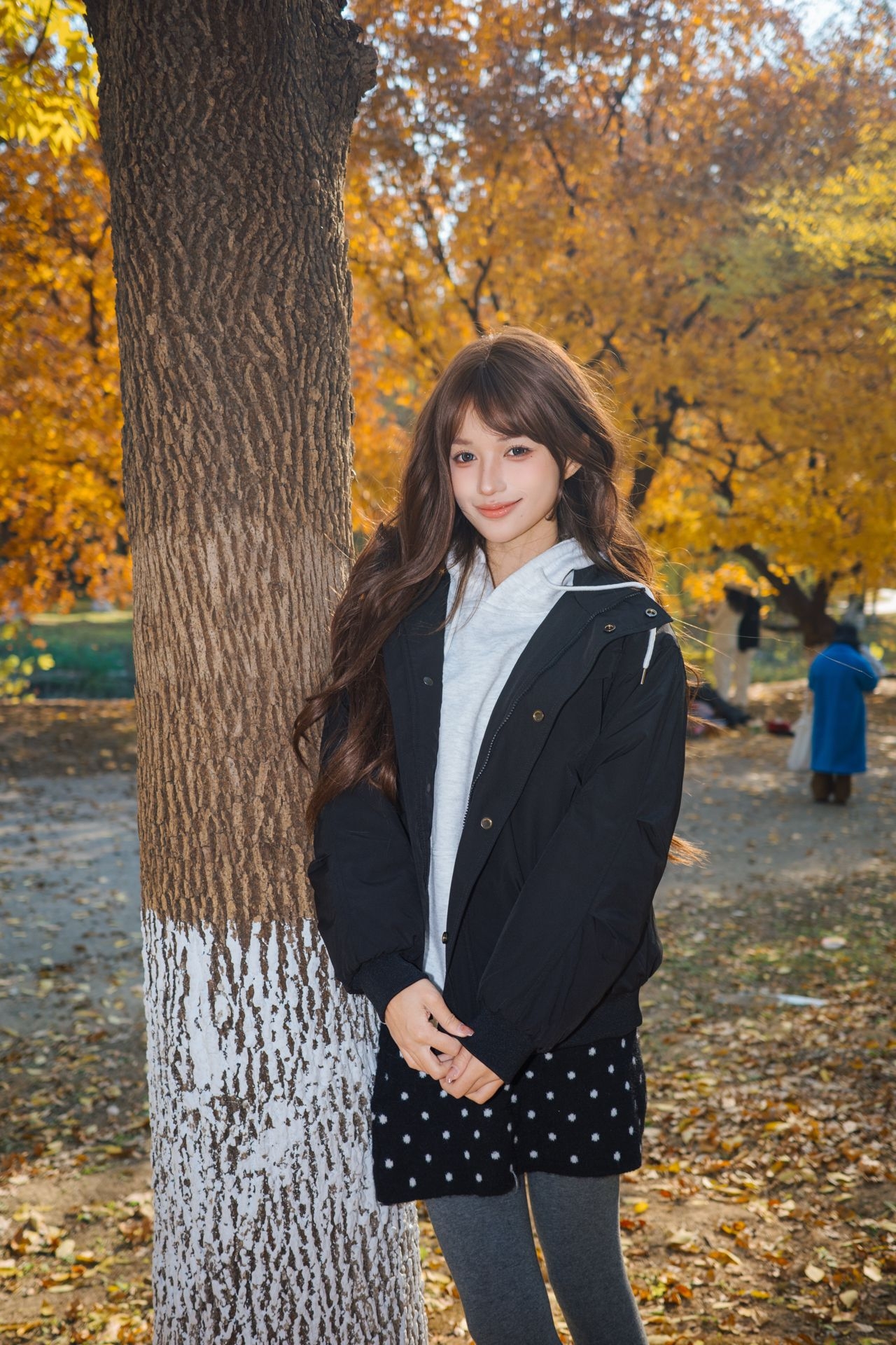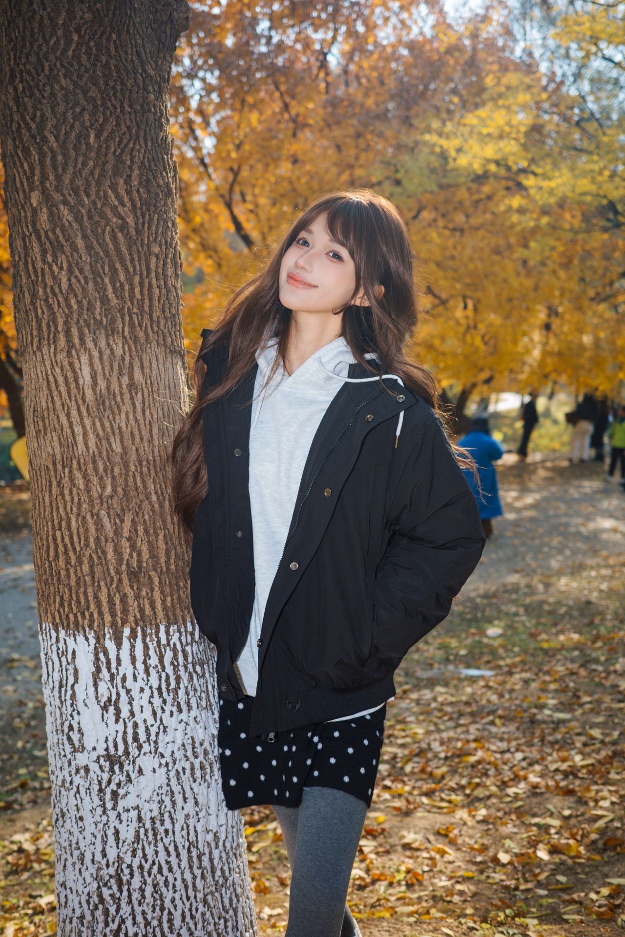 全世界都是金黄色的 这个时候穿着一件全黑的外套不要太好看啦 这件日系复古的外套是我的心头爱 虽然是棉服但是却一点不臃肿 保暖又出片呀