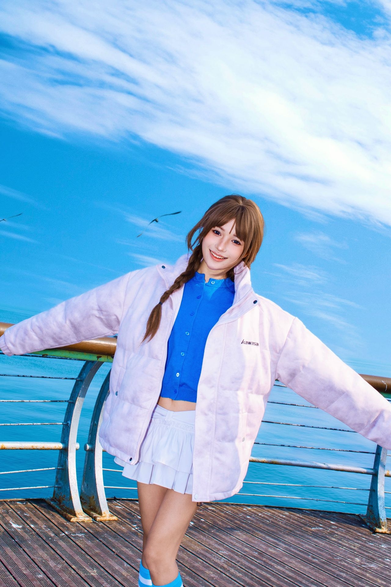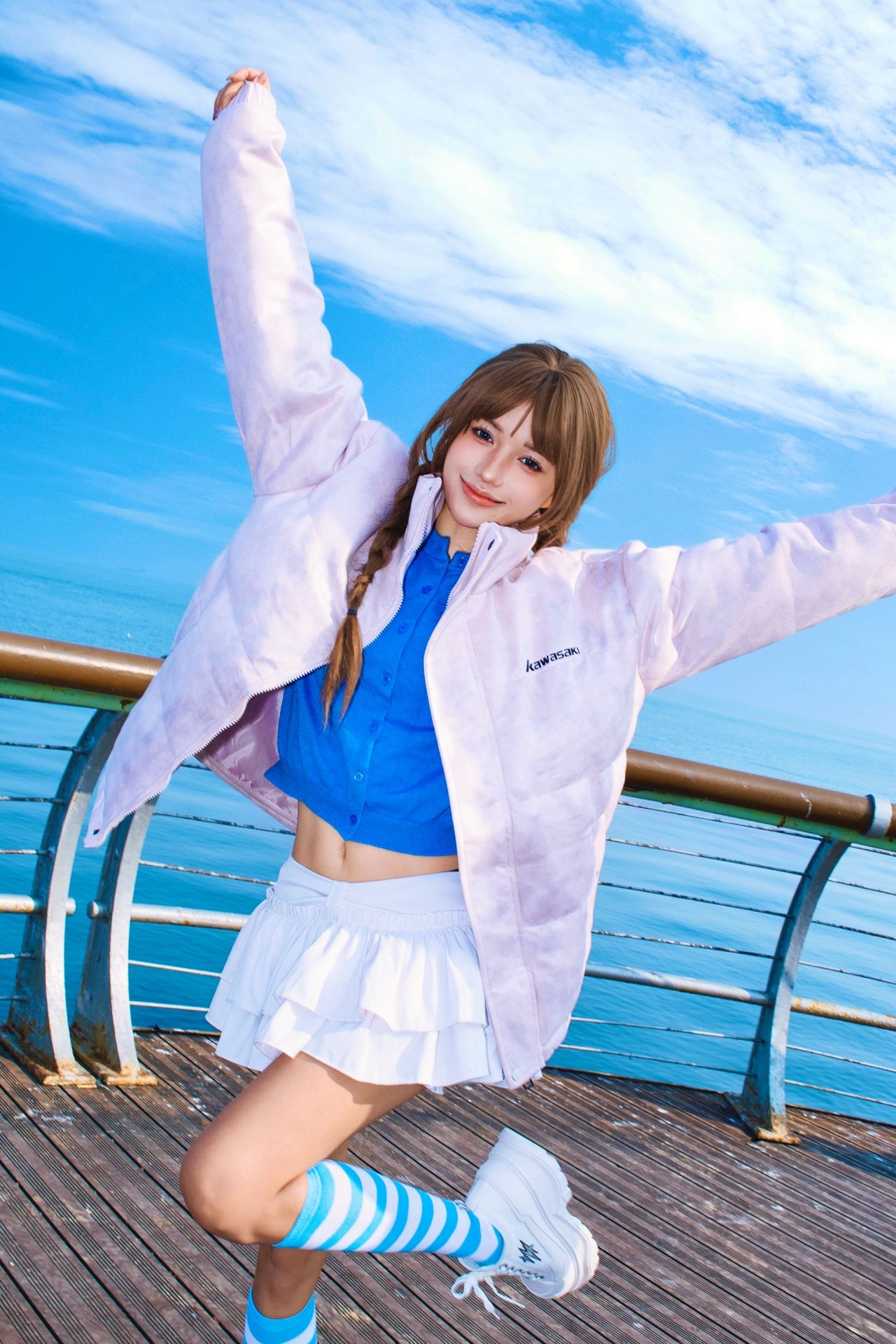 谁懂啊!海边+晴天+粉蓝撞色=快乐翻倍💖 粉糯糯的川崎外套软乎乎像抱了团棉花 内搭克莱因蓝直接把元气拉满 蓝白条纹袜和大海同色系🌊 随便往海边栏杆旁一靠 就出片啦 ootd公式:浅粉棉服+亮色内搭+撞色袜 轻松get元气少女感!