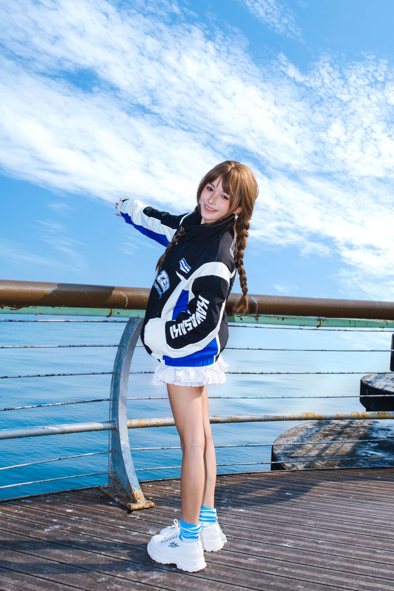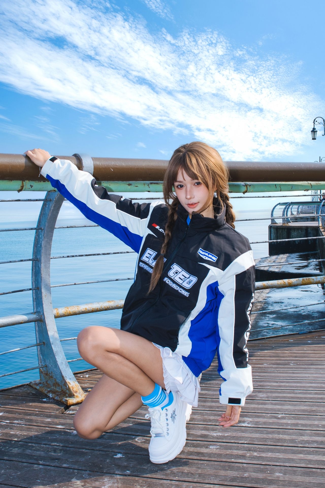 海边的风再野,这件撞色机车服也能稳稳hold住 黑蓝白拼接自带赛博潮感 防风面料裹住暖意 抬手摆pose都不冻胳膊~ 配百褶裙+厚底鞋 甜酷反差感直接拉满! 蓝天碧海当背景,随便站在栏杆边就能出片