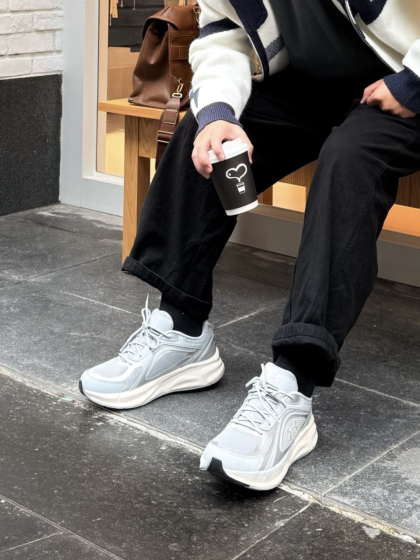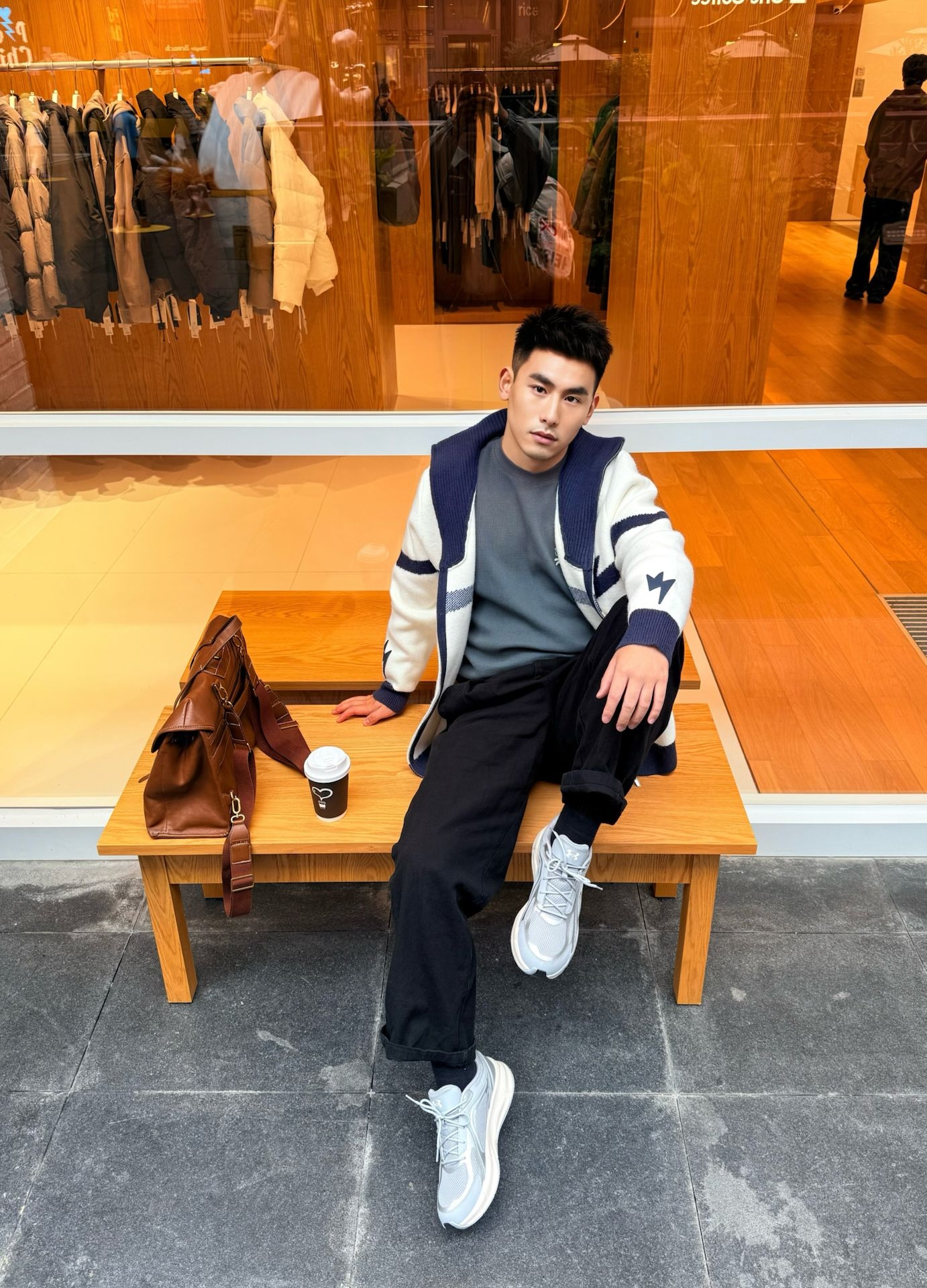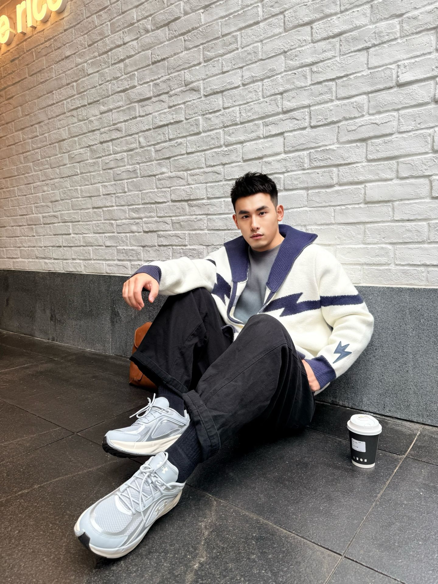 白蓝针织外套配黑色直筒裤,简约清爽; 重点来咯!脚踩安德玛HOVR Phantom运动鞋,蓝灰色调增添活力,针织鞋面轻盈包裹感很舒服,所以上脚走路不怕硌着不舒服! 整体风格舒适休闲,兼具运动与通勤感,轻松驾驭多种场合。