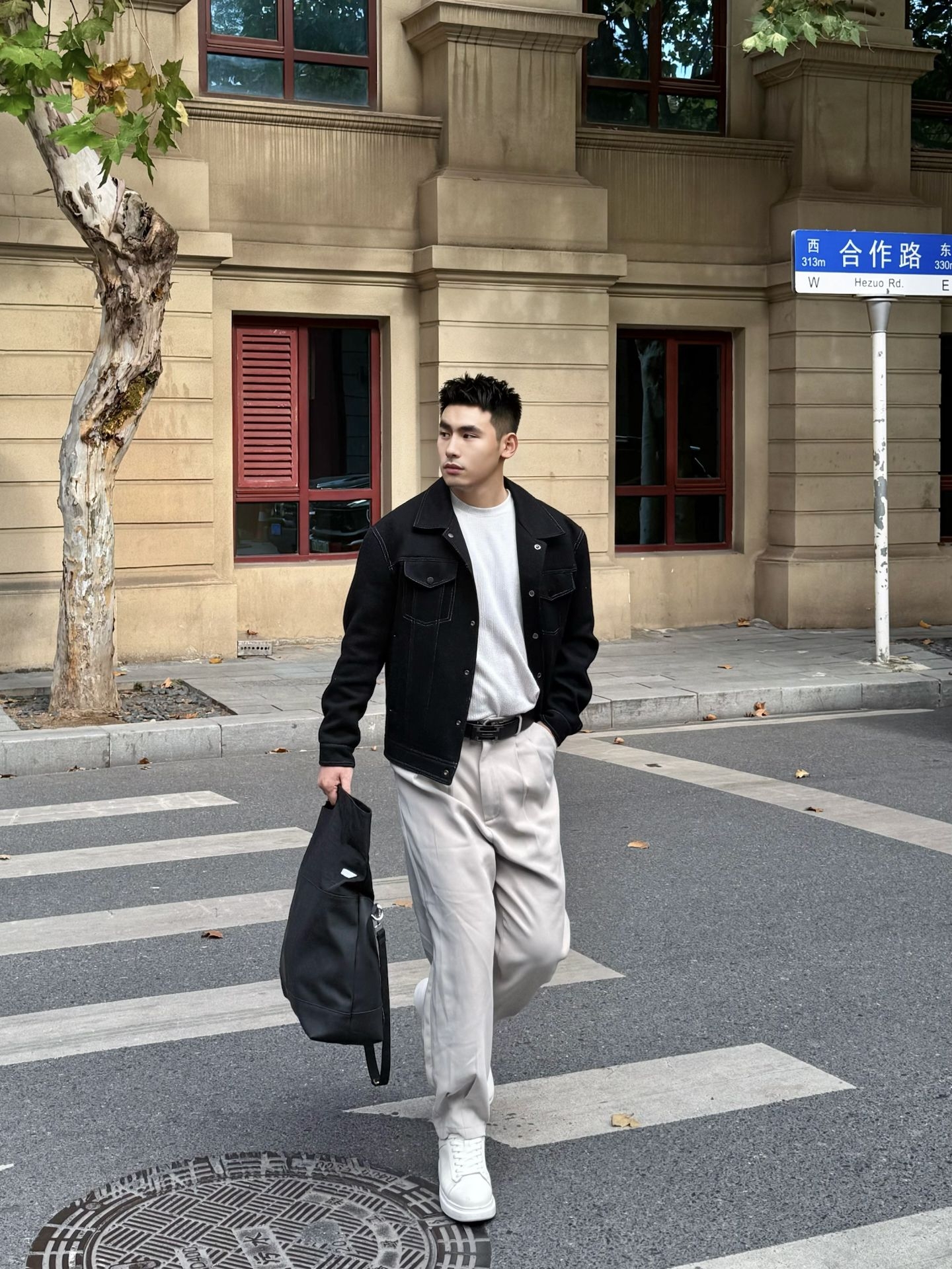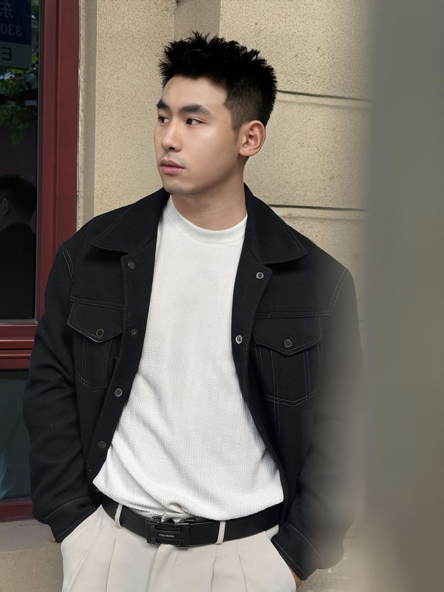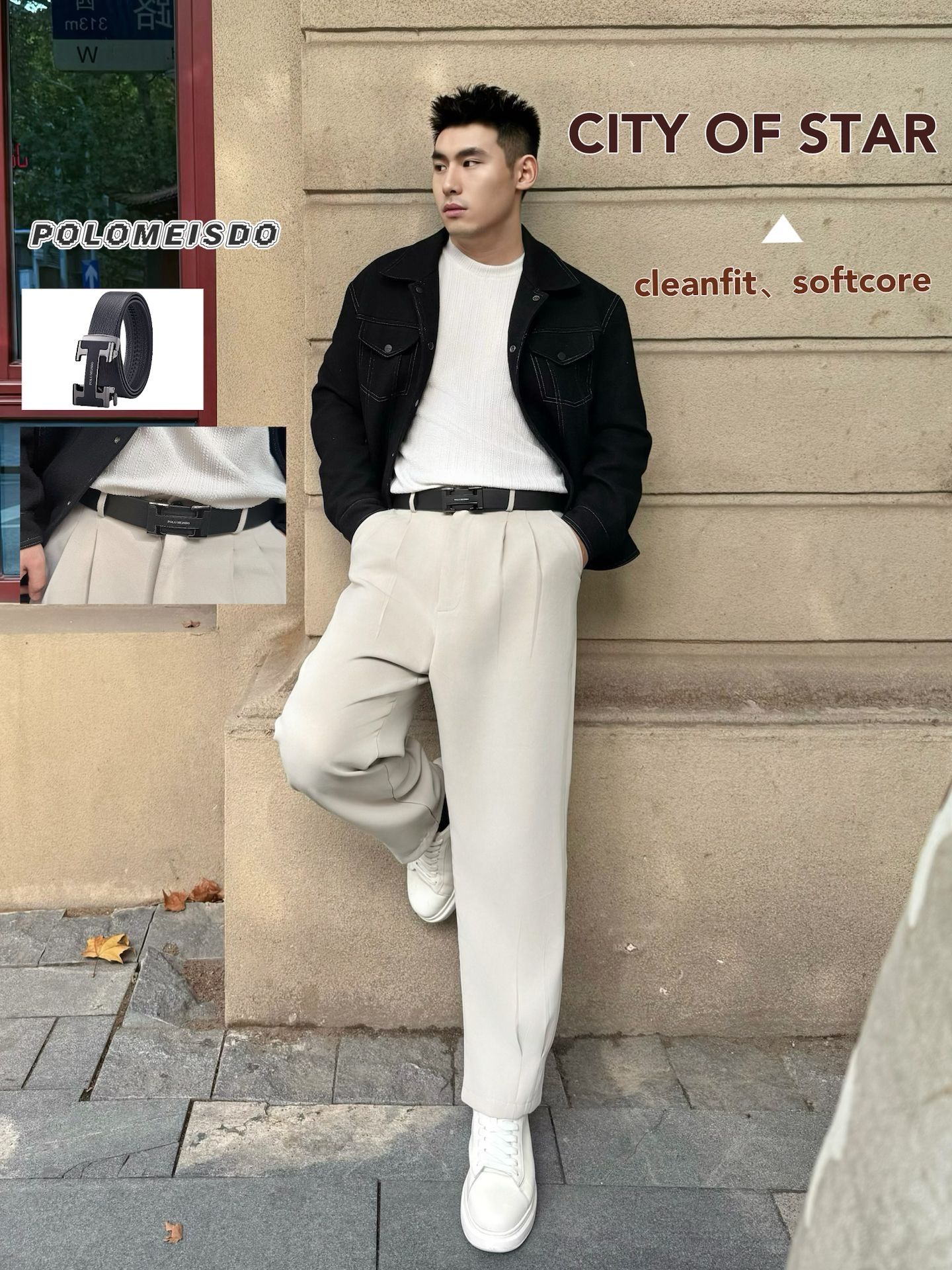 酷感黑白,经典配色松弛有型!这身穿搭将黑色短款毛呢外套与全套白色内搭、直筒白西裤组合,干练利落又不失休闲感。 一条POLOMEISDO的皮带,这次皮带头设计奢感很足,极简中透出高级潮流触觉。超级喜欢!自己用,送人都有派头,整体风格是现代简约风,完美平衡通勤与街头型格。