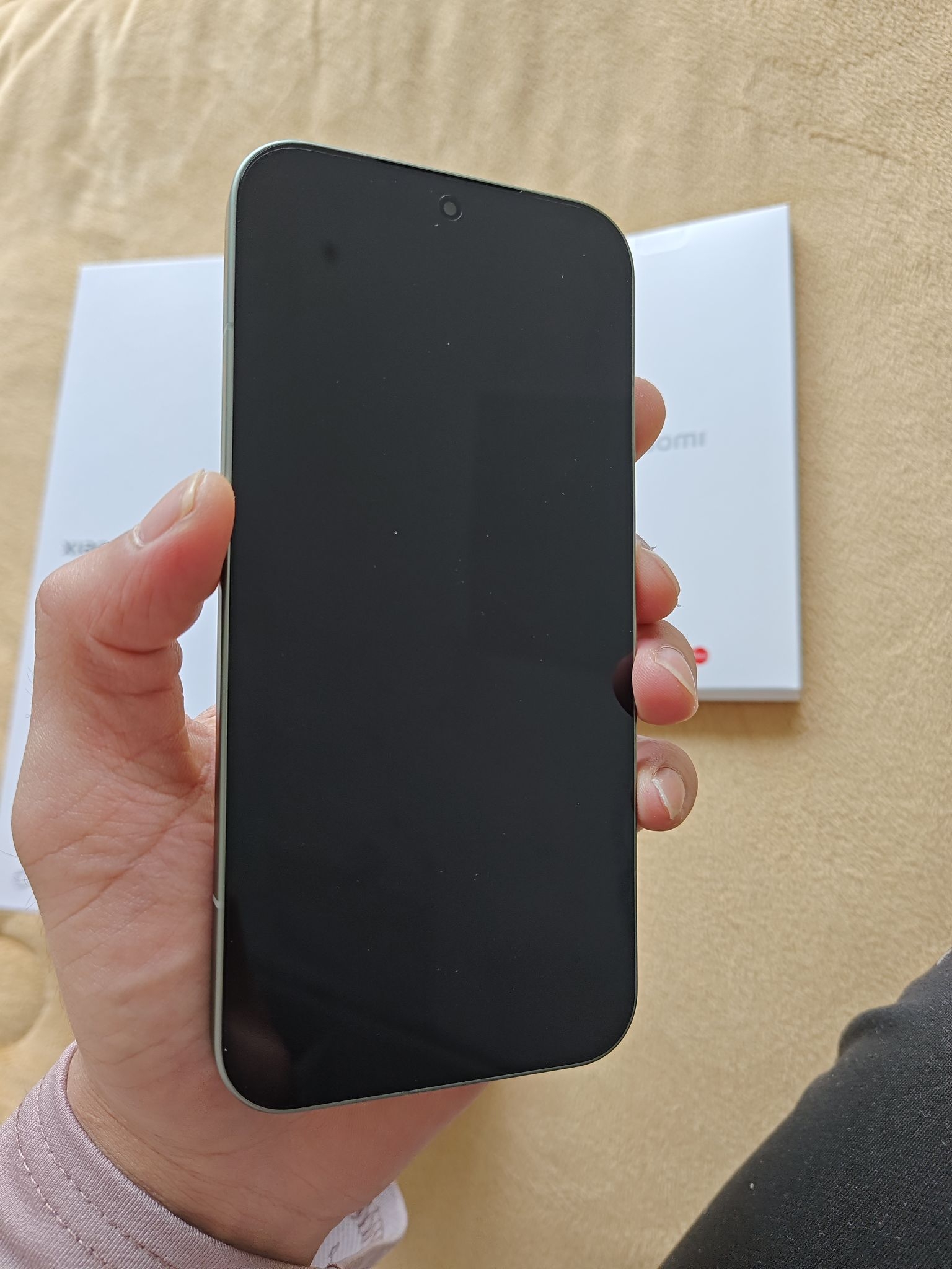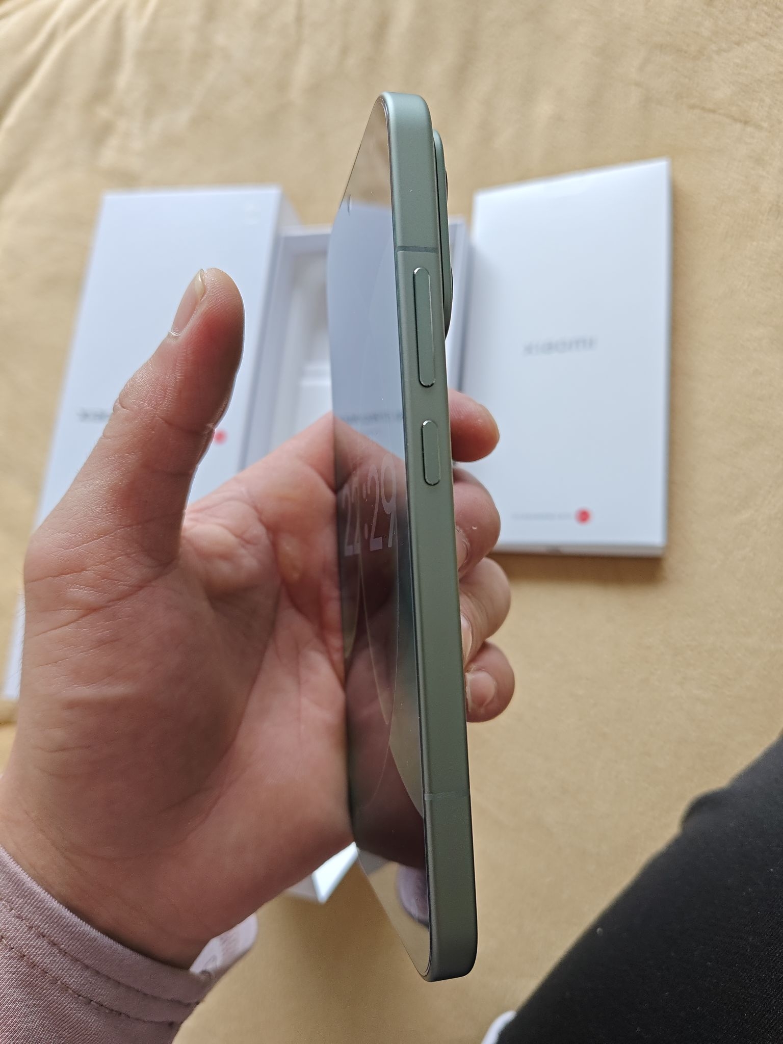 图片里能看清手机本体,我这款是淡绿色,背面质感看起来不张扬,挺有高级感。金属中框的过渡处理得很圆润,拿在手里没有硌手感,重量分布也均匀,即使屏幕大,单手握持也不会觉得太累。窄边框带来的沉浸感在看视频时特别爽。