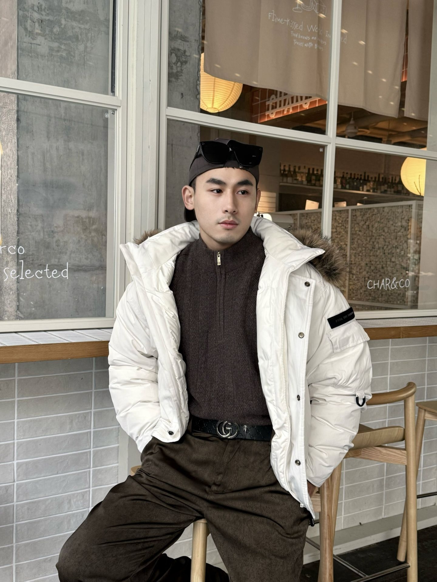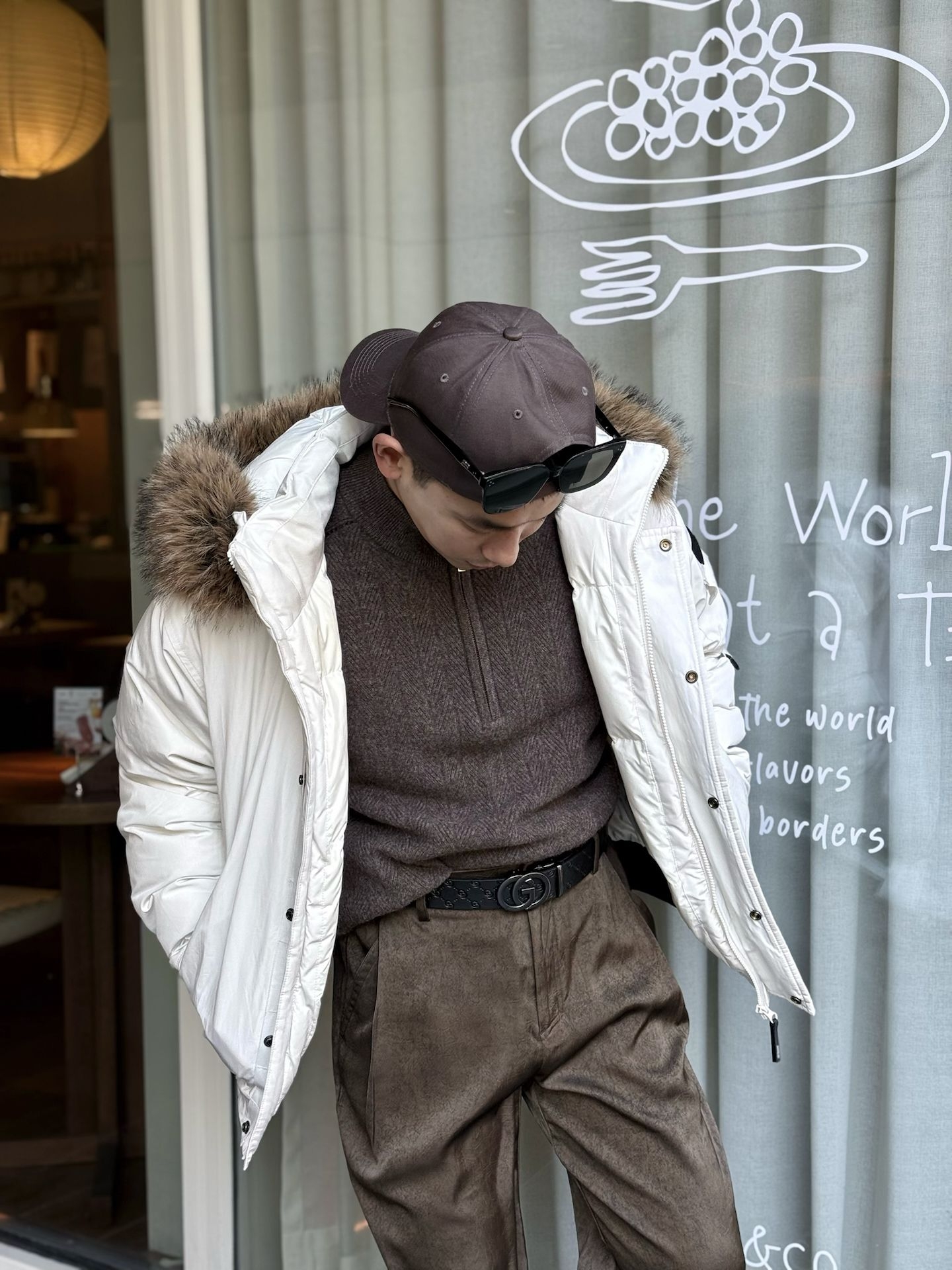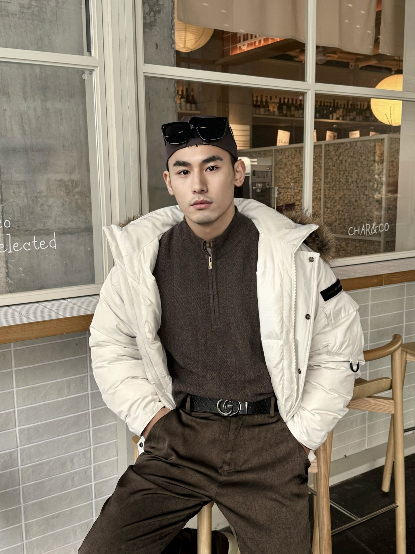 冬日暖棕系穿搭,简约松弛又不失高级感。白色羽绒服清爽明亮,内搭同色系毛衣与直筒裤,层次感十足。POLOMEISDO的皮带头非常有设计感,皮质也很柔软,整体低调提升质感,给穿搭赋予慵懒时髦感,更不费力出街!