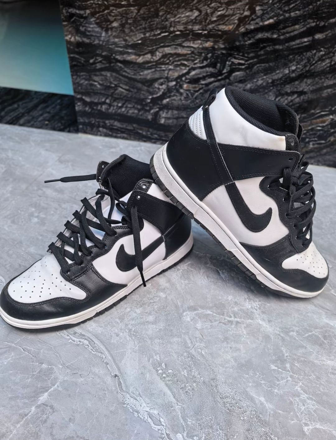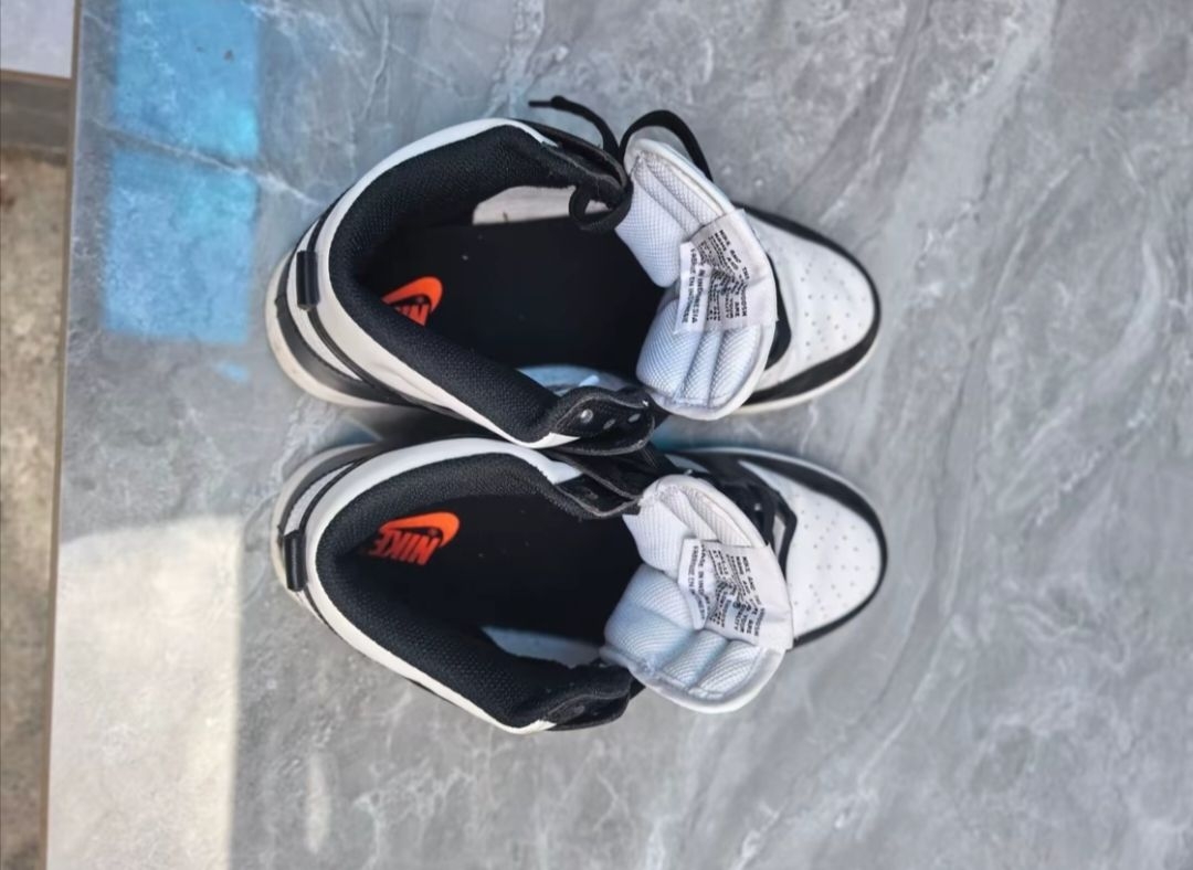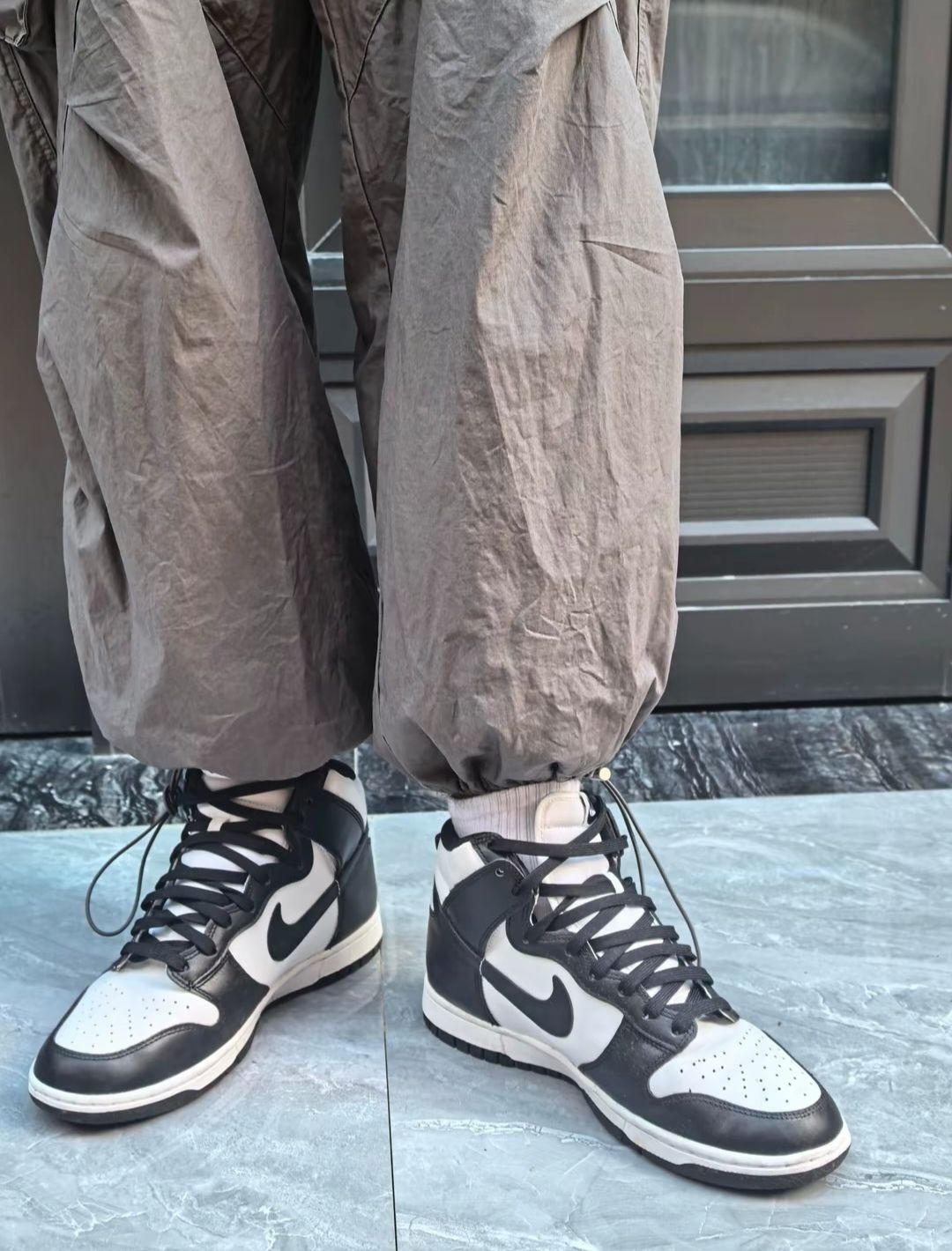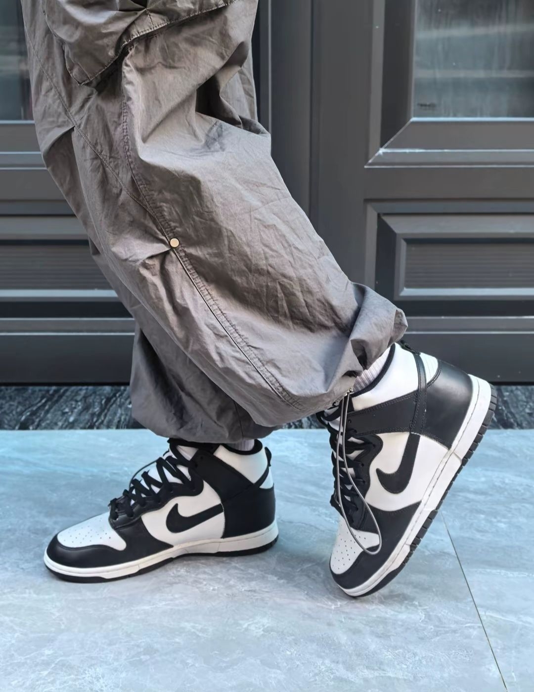 最近常穿的这双Nike Dunk高帮,说不上多惊艳,但越穿越顺眼。 白鞋面配黑Swoosh和鞋头,像杯加了冰的美式——干净不抢戏,却让人忍不住多瞅两眼。 鞋侧有细腻的透气孔,夏天穿不闷脚;鞋舌内侧藏着橙色小标,低头系鞋带时总被它戳中,有点小惊喜。 最常搭的是这条高灰束脚裤:裤脚松松堆在鞋帮上,不卡脚踝也不拖沓,配大理石地面走起来稳当,搭深色木门或金属栏杆背景,镜头里也自然。