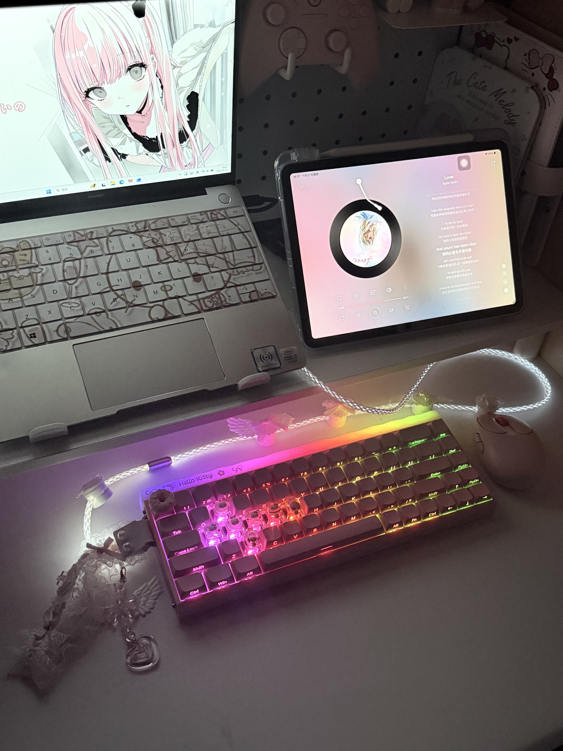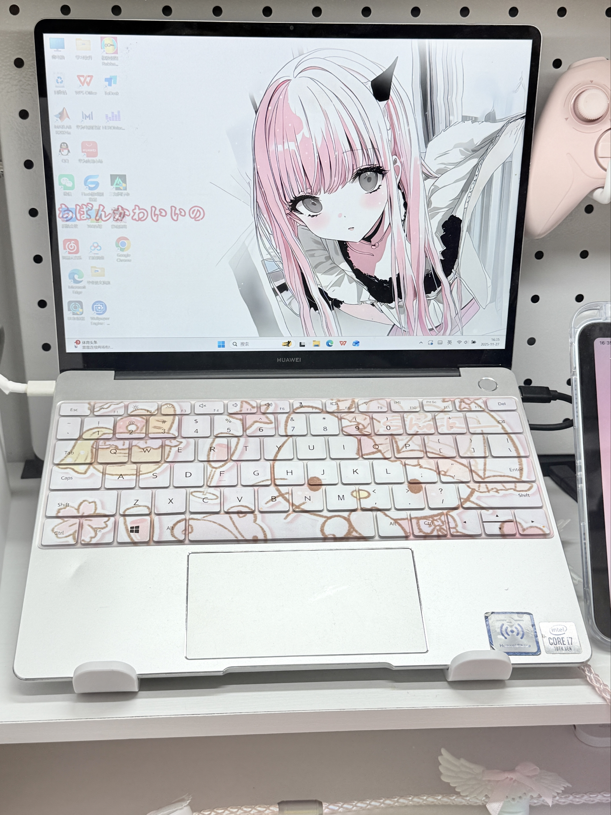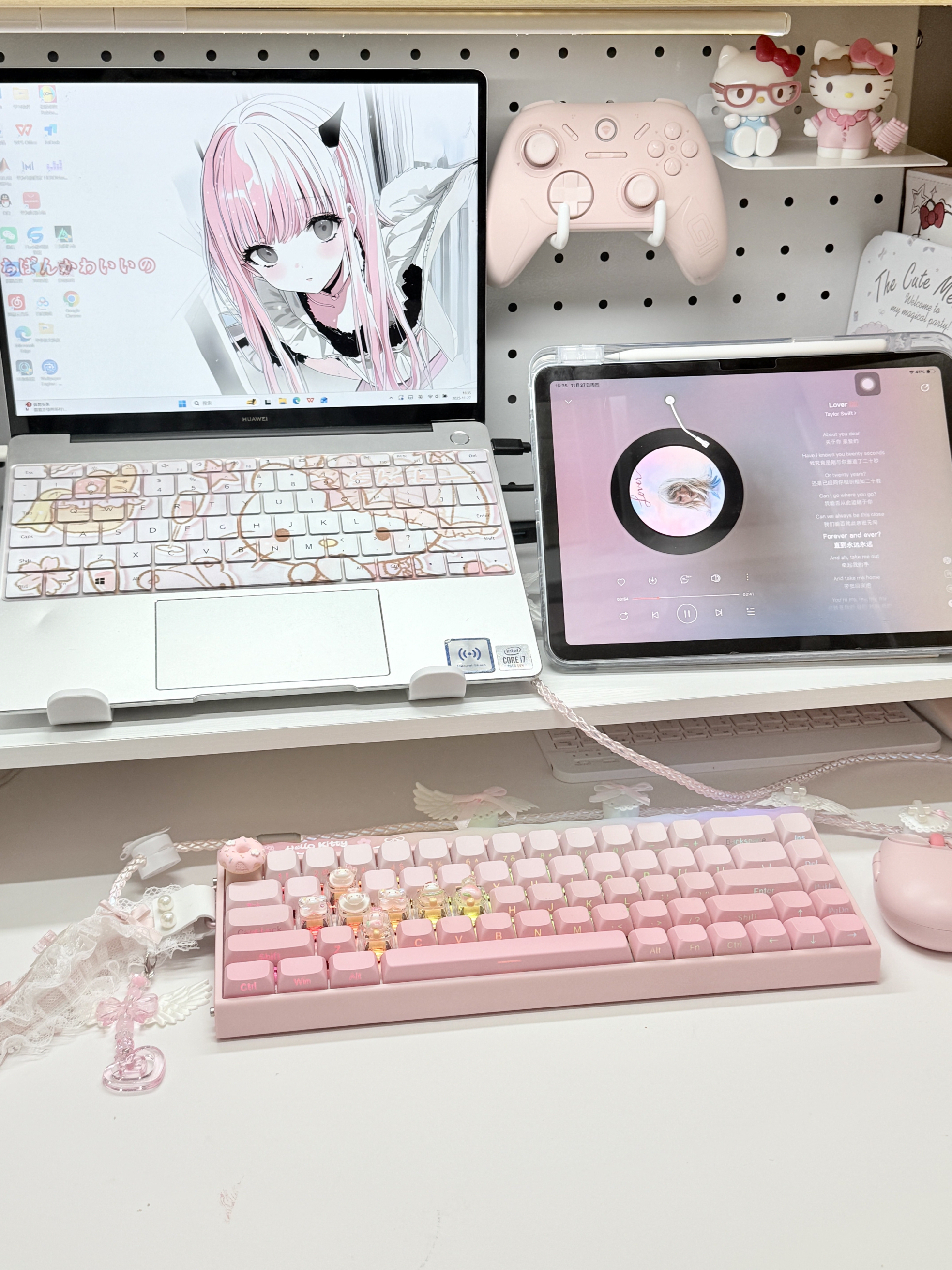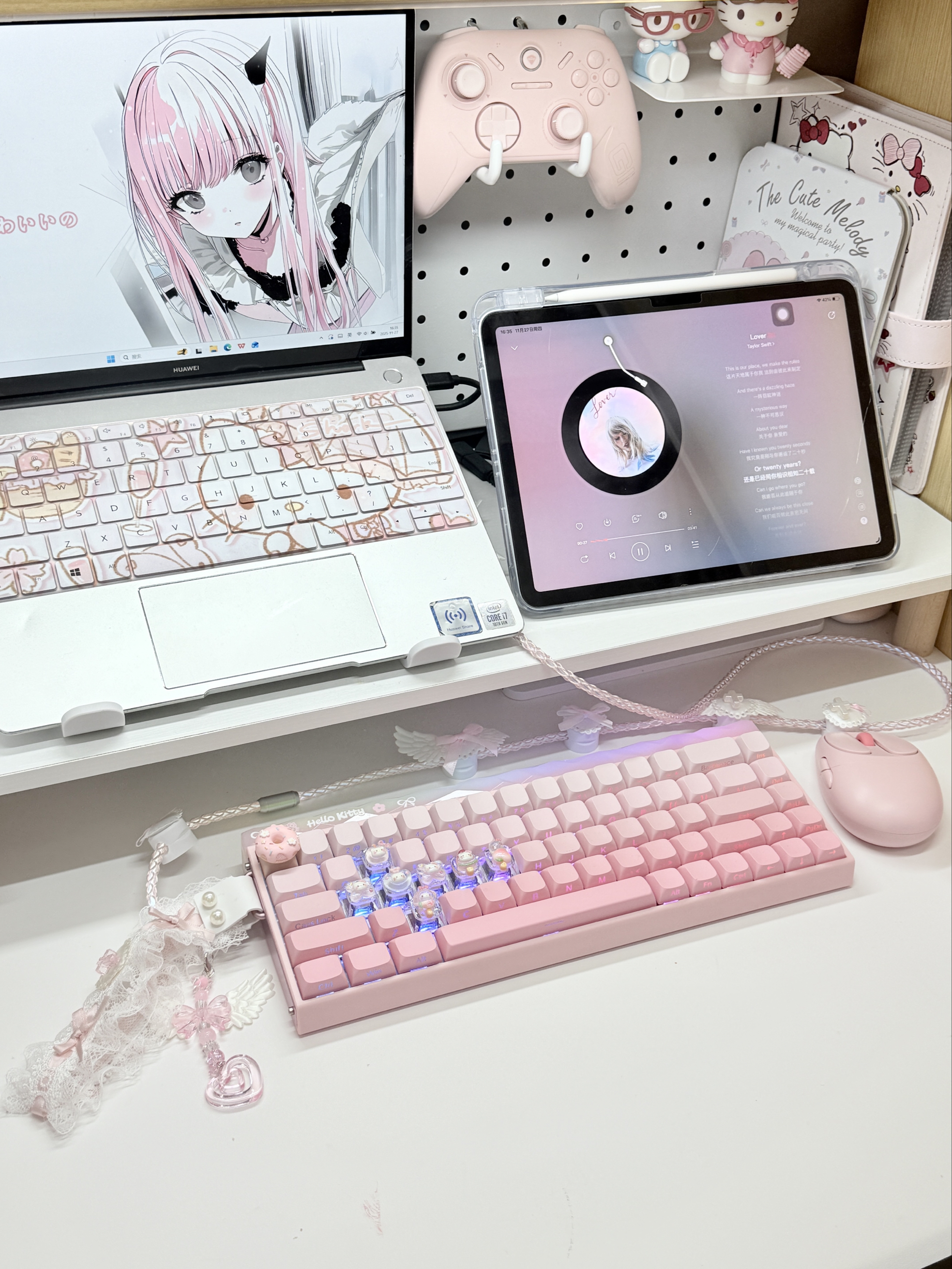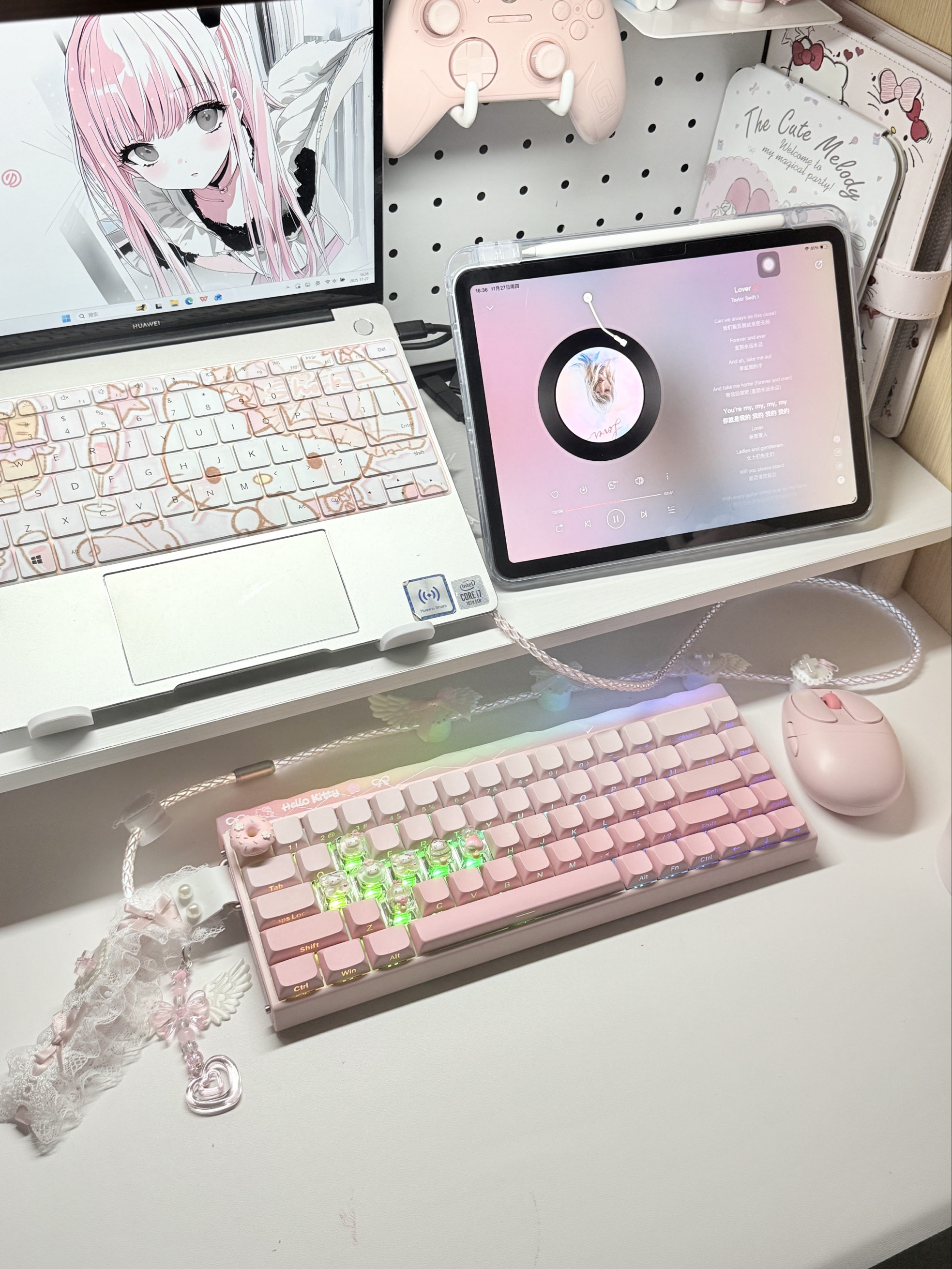 今天给大家展示我的桌面啦 主色调是粉白哦 我的桌面比较小 所以选择电脑的时候会考虑尺寸 电脑是13寸的华为轻薄本 这款电脑还可以触屏~ ipad是11寸的air6 都是小尺寸的 也方便携带哦