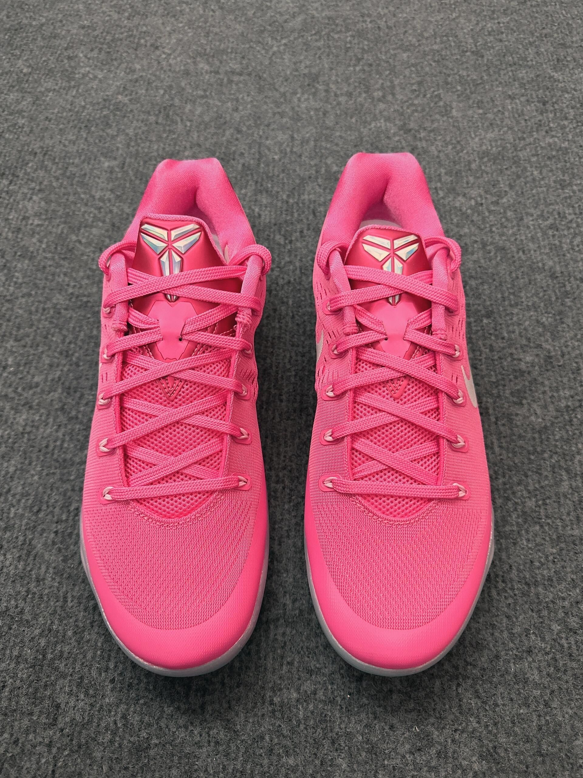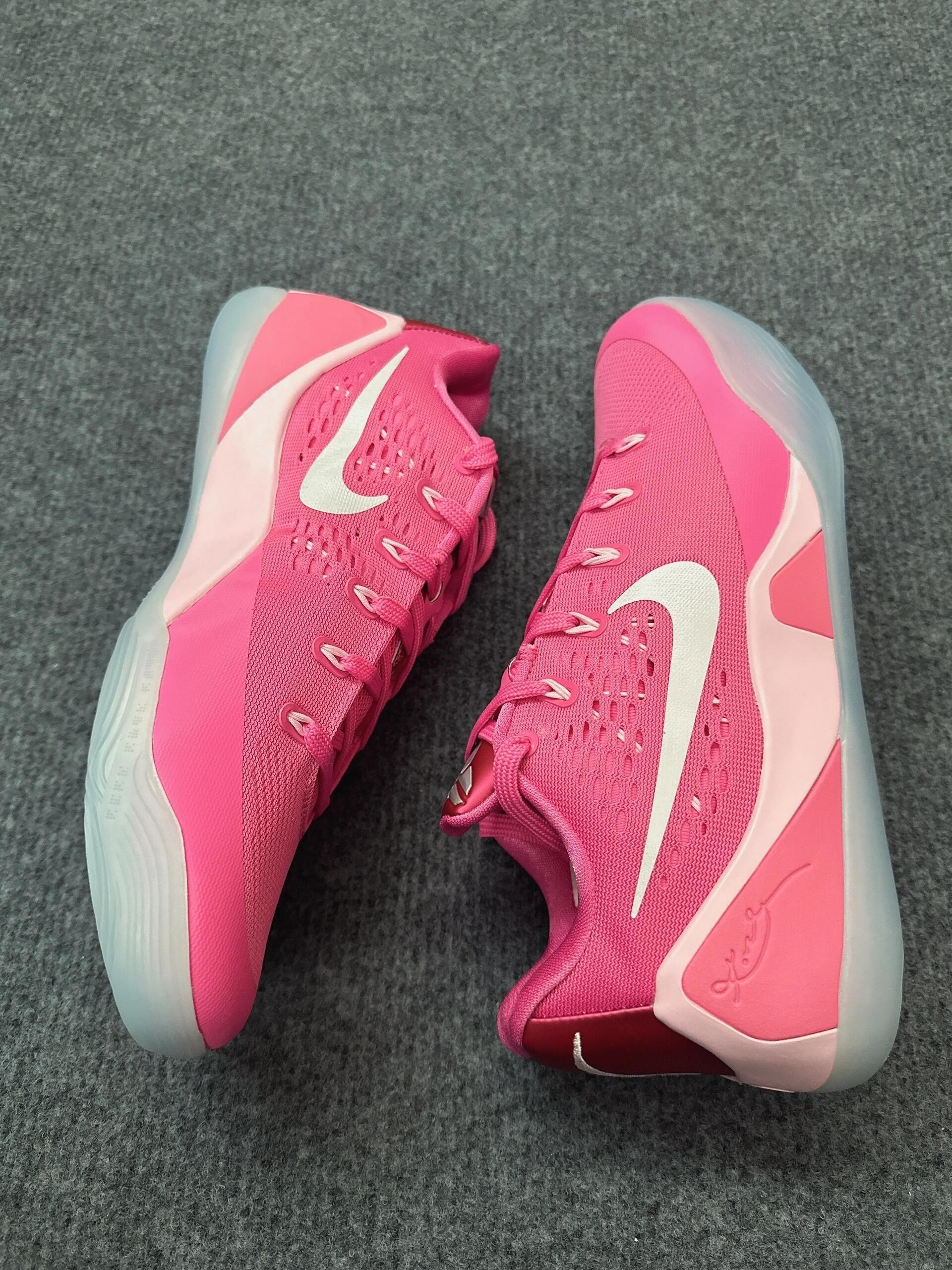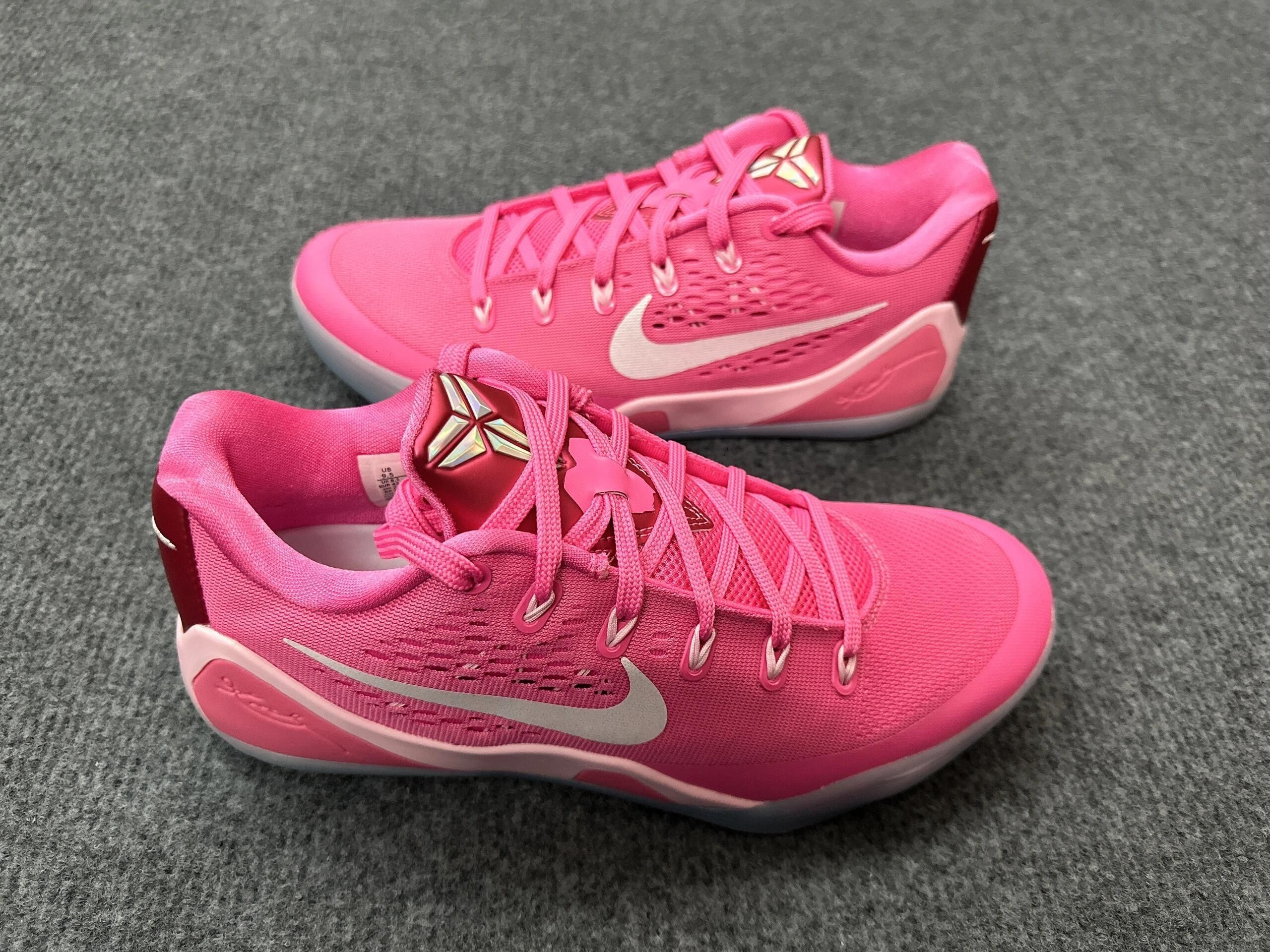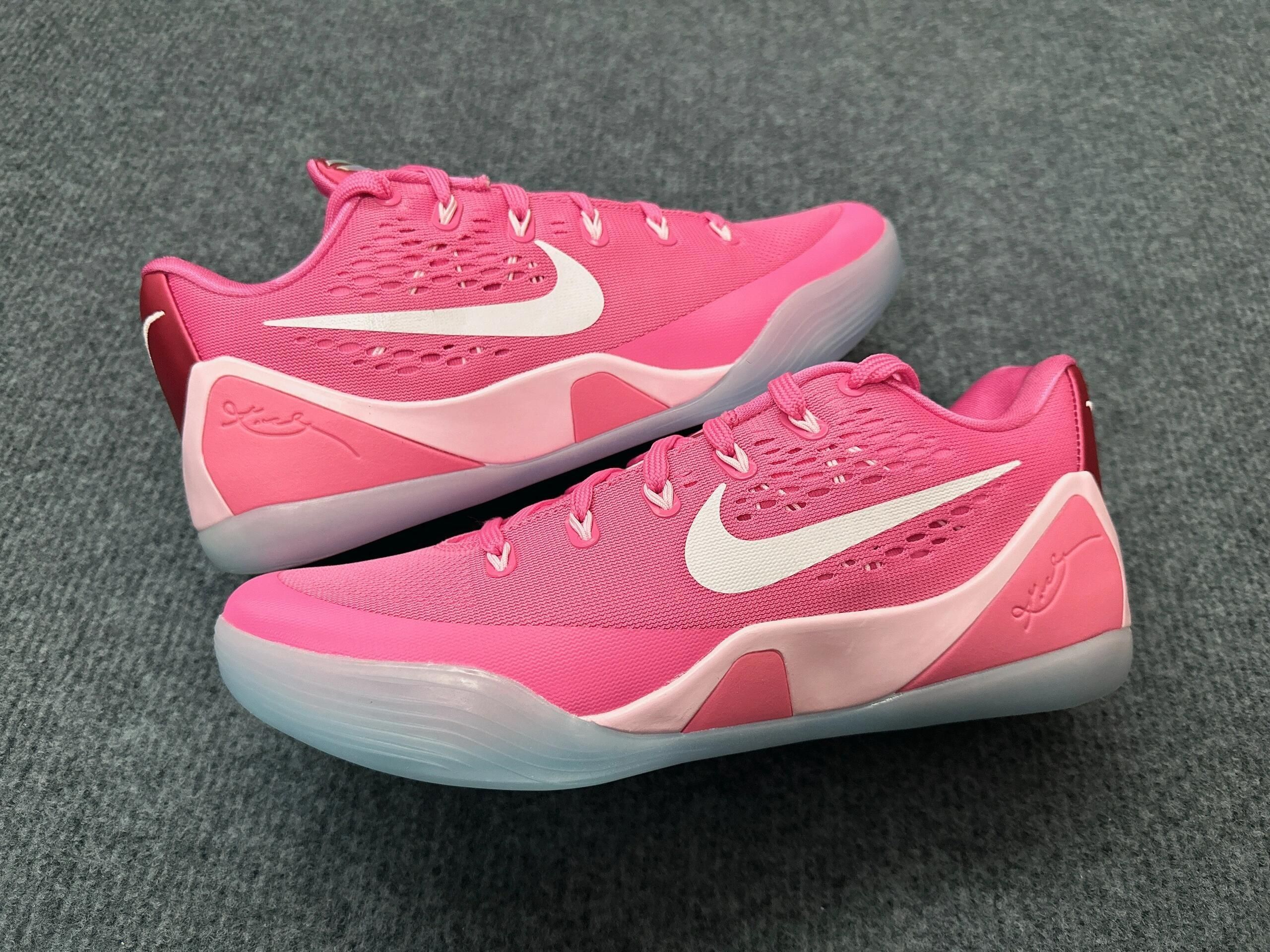 这双是 Nike Kobe 9 EM “Think Pink”,是当年为了支持乳腺癌防治公益推出的特别配色,从鞋身到细节都铺满了亮眼的粉色系。 鞋款延续了 Kobe 9 EM 标志性的低帮流线造型,网眼织物鞋面保证了透气感,鞋舌处的科比 Logo 用银色点缀,和后跟的酒红色细节形成温柔又有力量的对比。 半透明的水晶外底上印着粉色的科比 Logo,搭配鞋身渐变的浅粉装饰,既保留了实战鞋的利落...