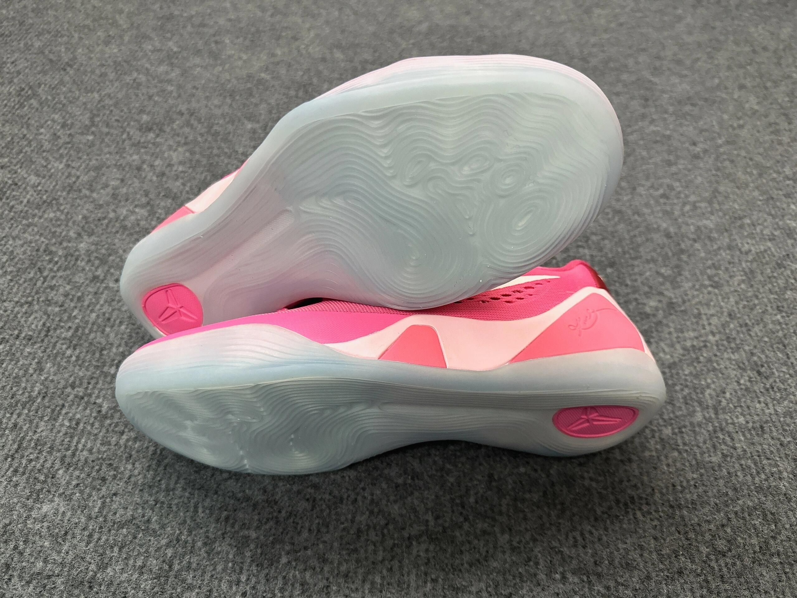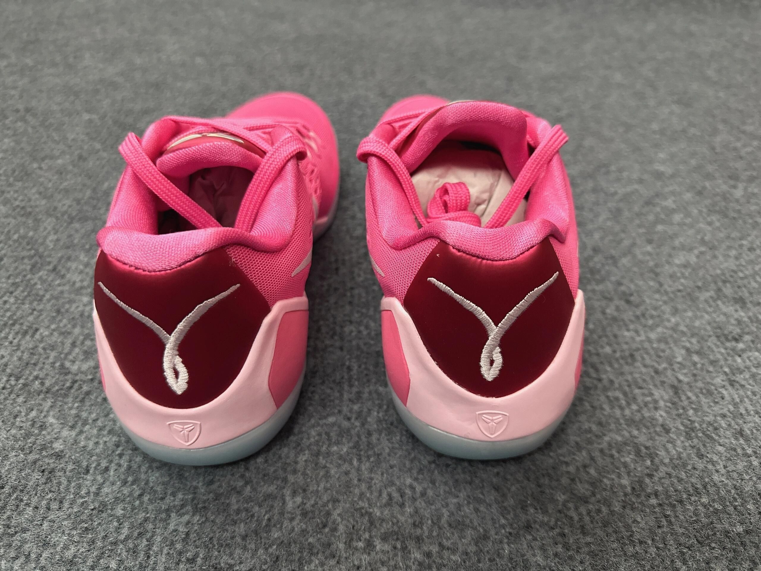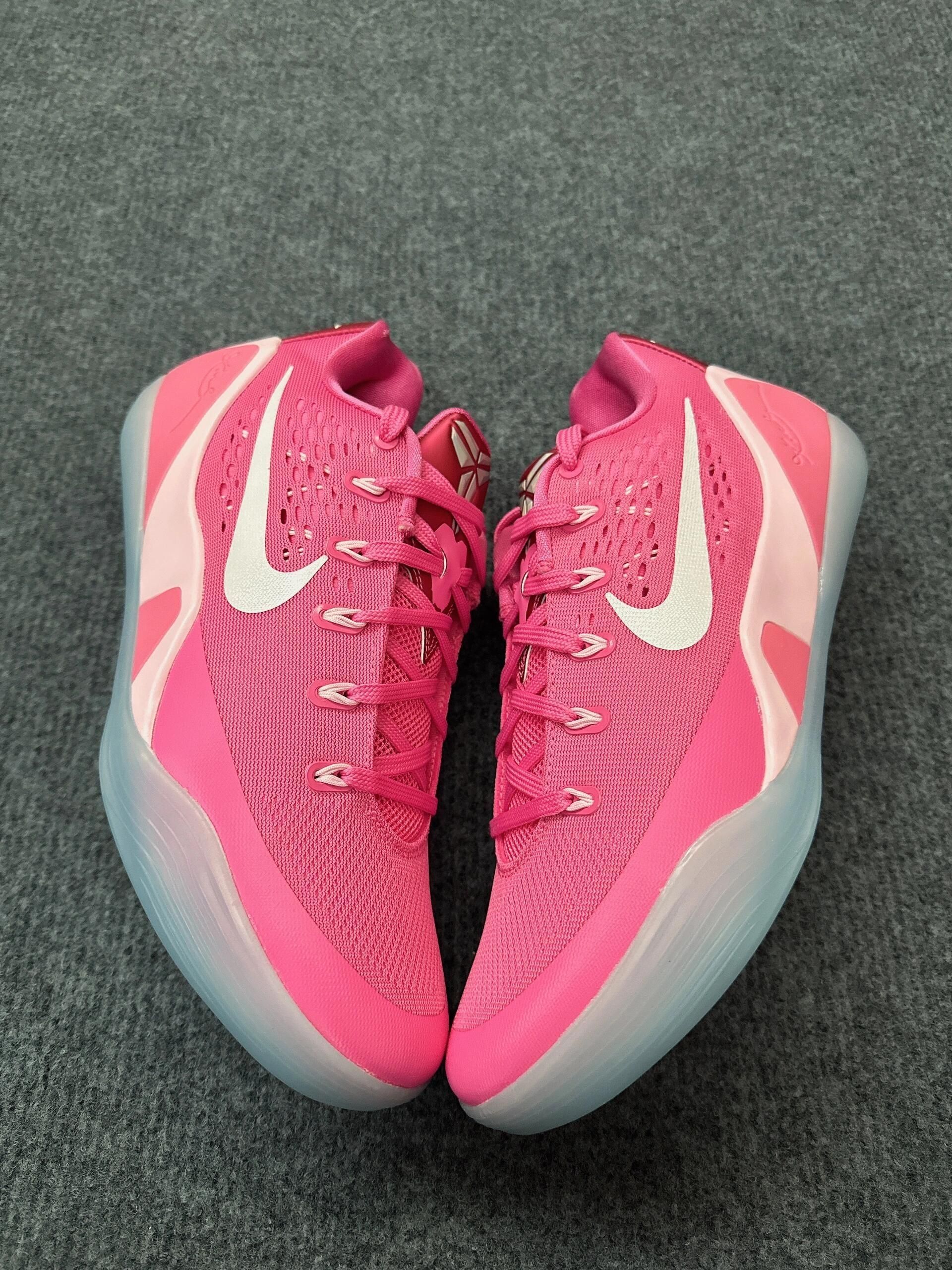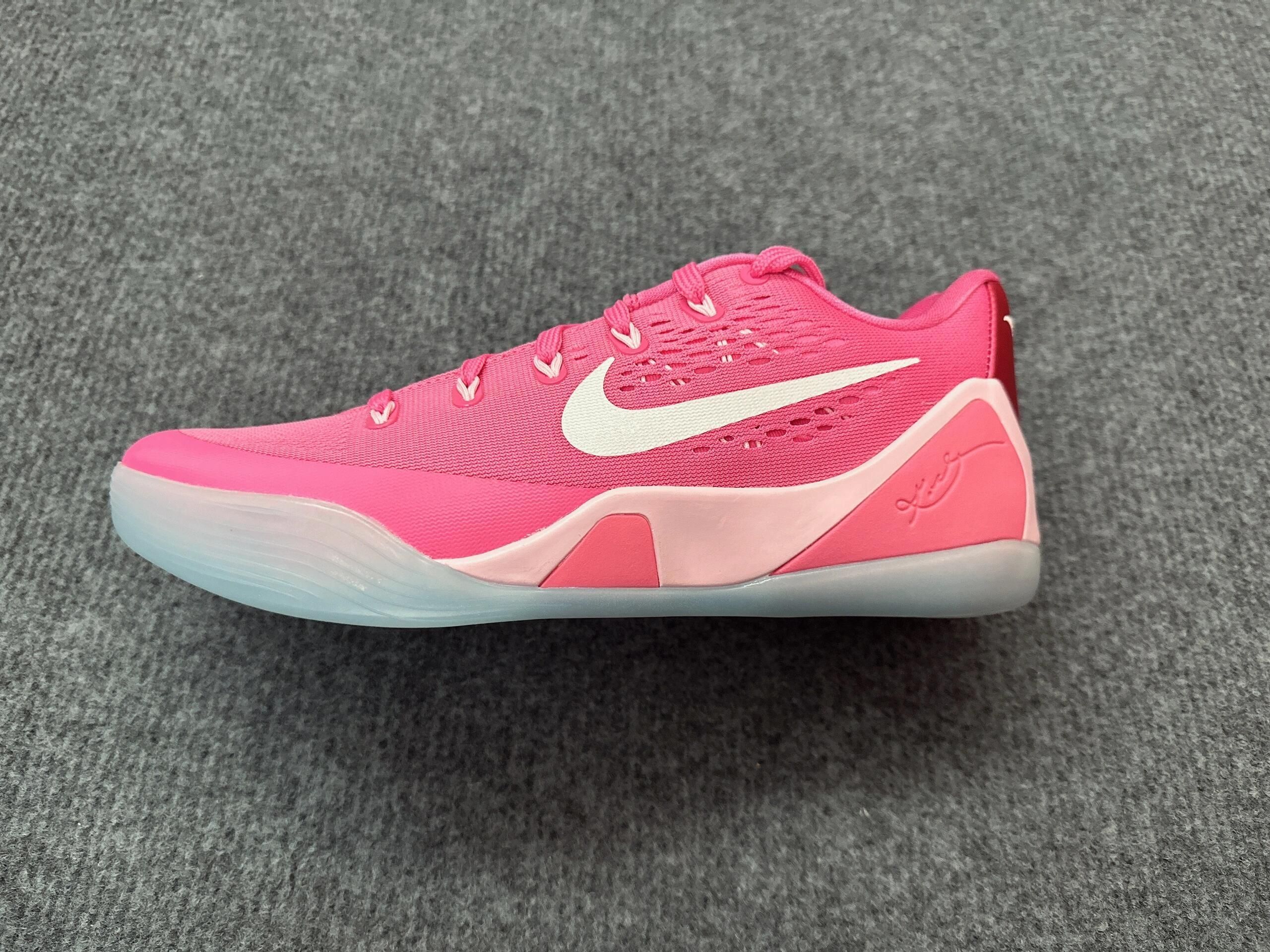 这双是 Nike Kobe 9 EM “Think Pink”,是当年为了支持乳腺癌防治公益推出的特别配色,从鞋身到细节都铺满了亮眼的粉色系。 鞋款延续了 Kobe 9 EM 标志性的低帮流线造型,网眼织物鞋面保证了透气感,鞋舌处的科比 Logo 用银色点缀,和后跟的酒红色细节形成温柔又有力量的对比。 半透明的水晶外底上印着粉色的科比 Logo,搭配鞋身渐变的浅粉装饰,既保留了实战鞋的利落...