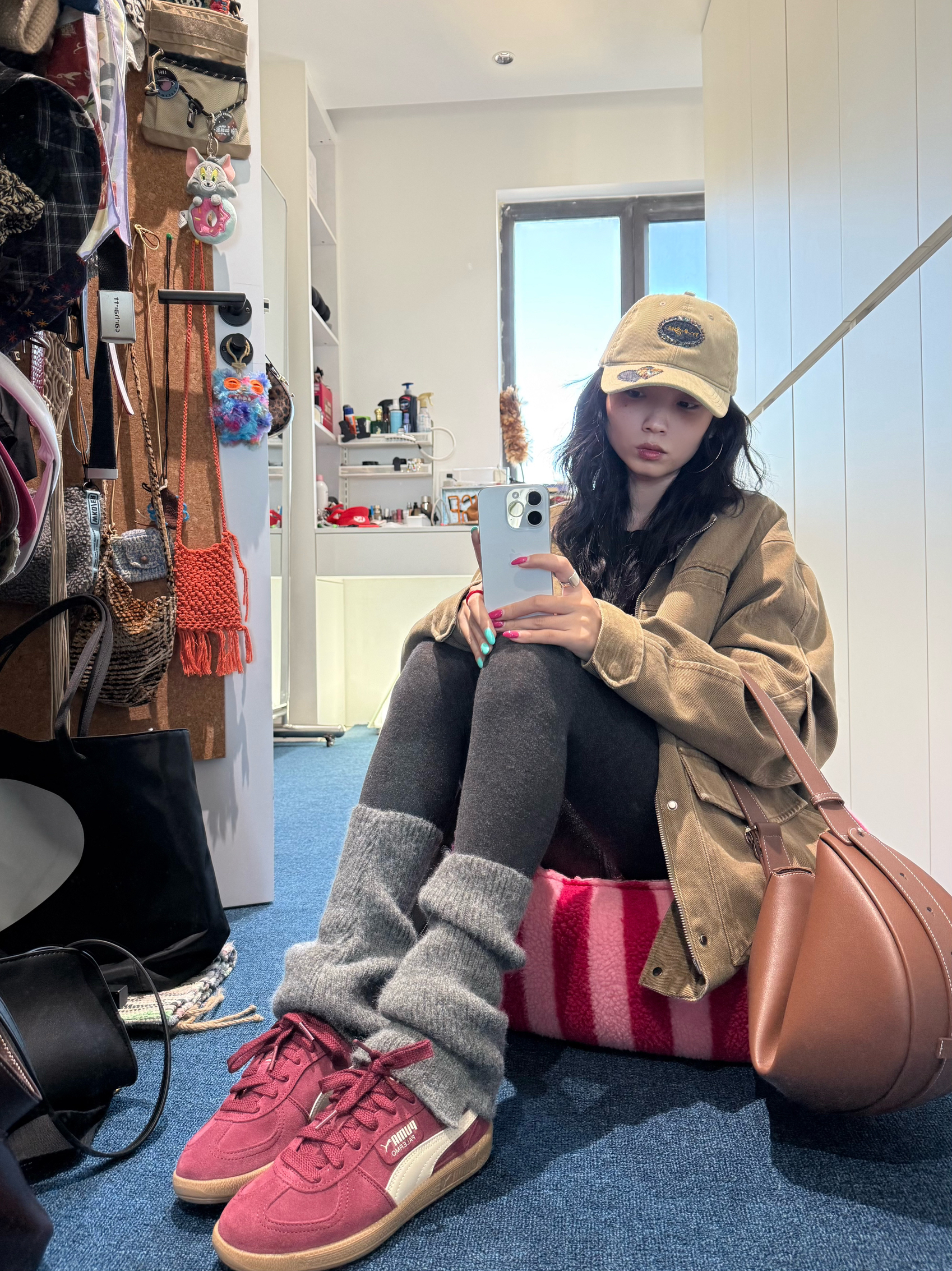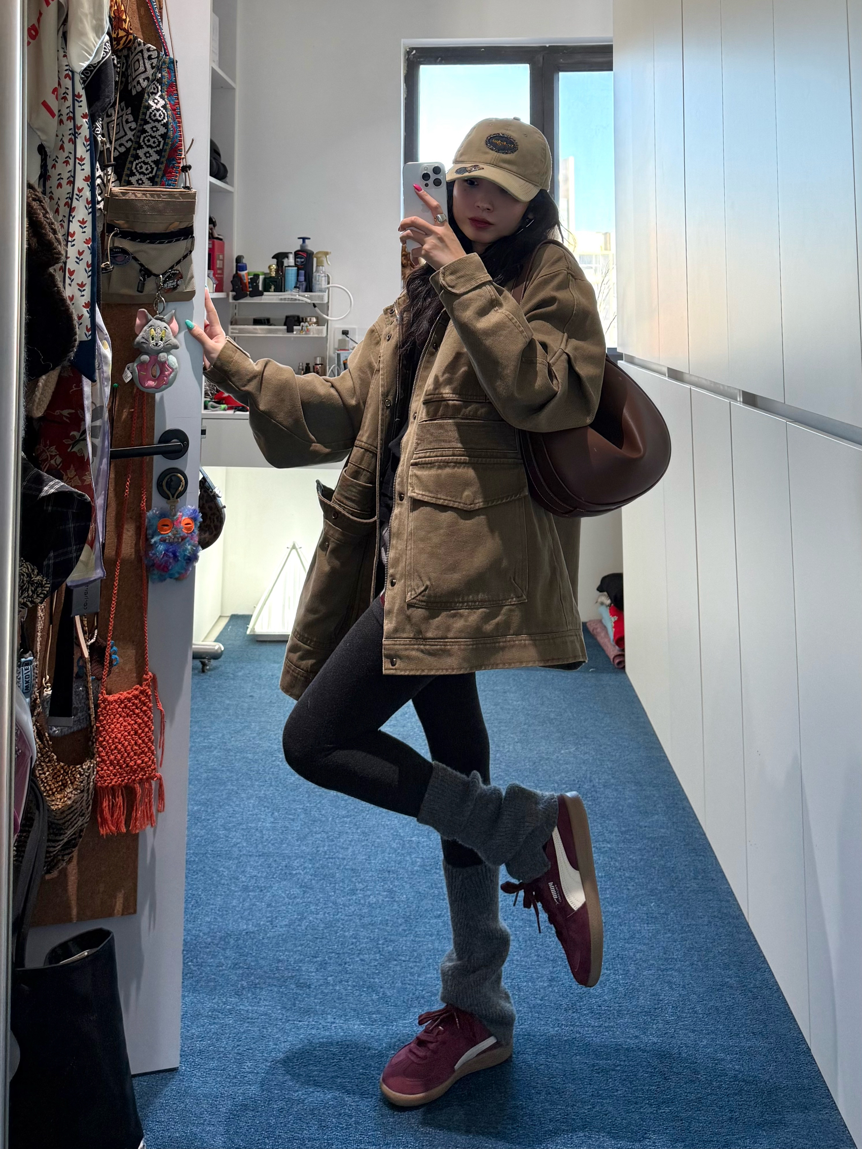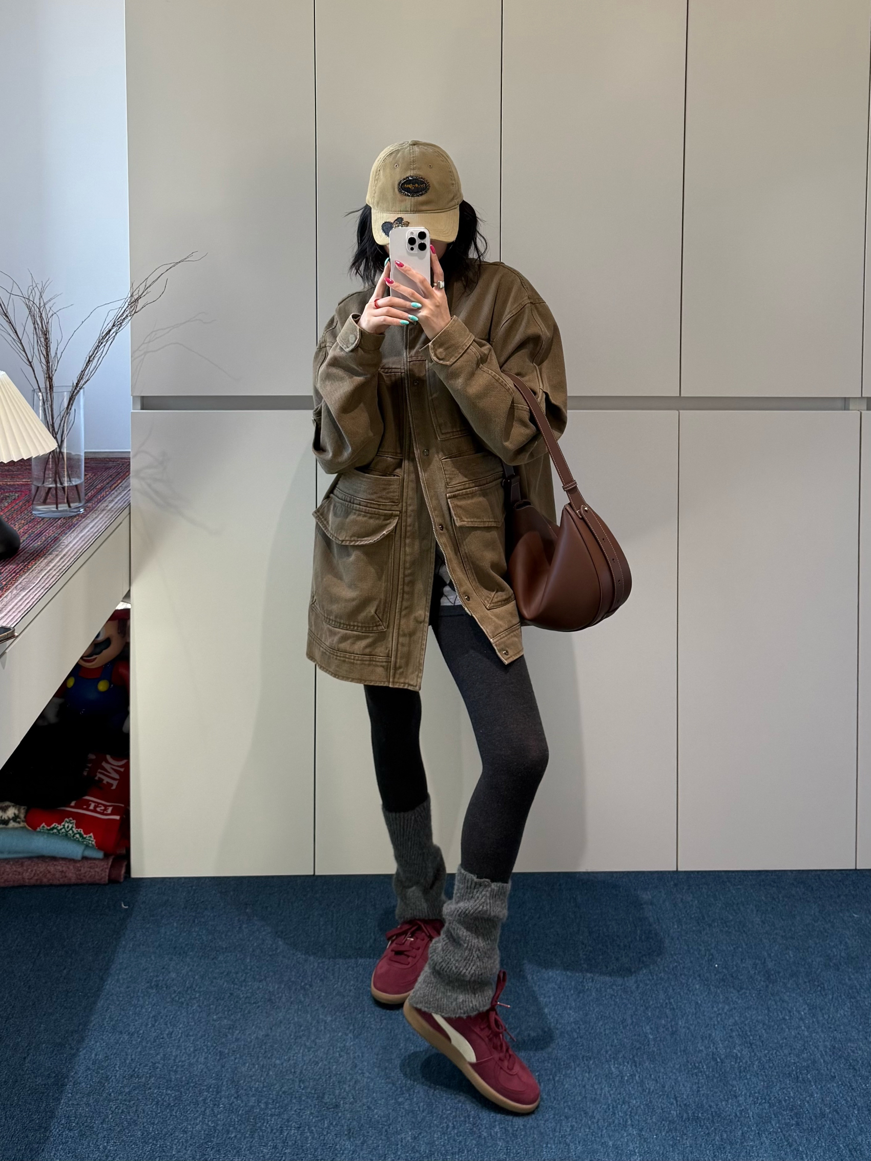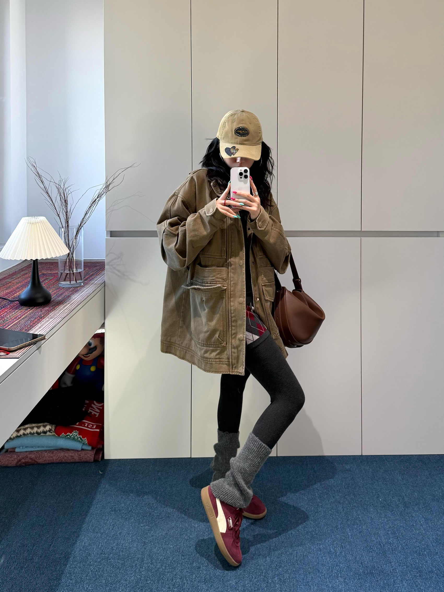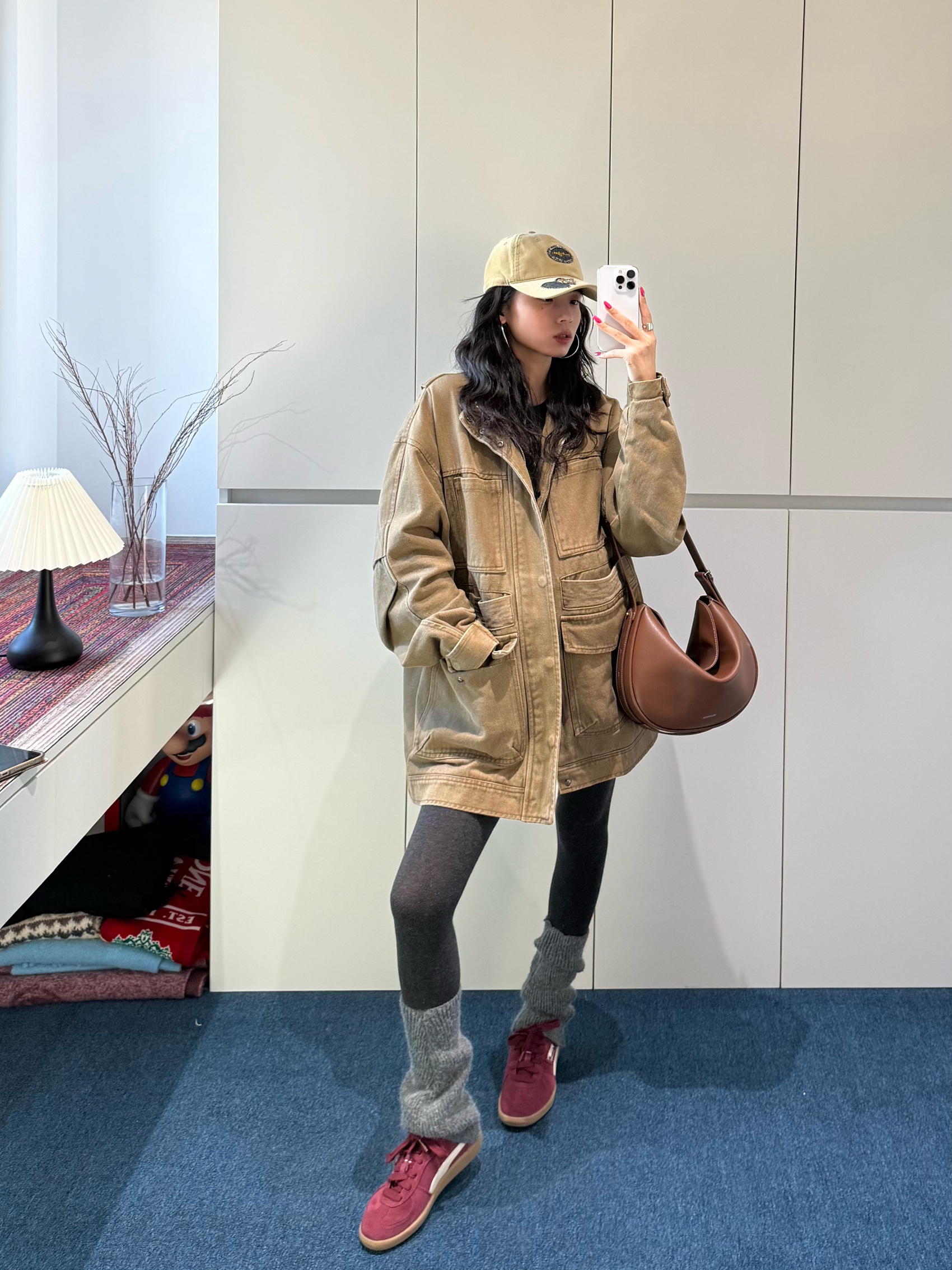 卡其工装外套的做旧纹理,刚好衬出打底裤的利落线条👖 露一截格纹短裤是宽松版型里的层次巧思✨ 酒红PUMA鞋和棕包搭配同色系,棒球帽让整体更稳得下来🧢 你们搭宽松外套时,会用紧身下装找这种“松-紧”的平衡感吗?