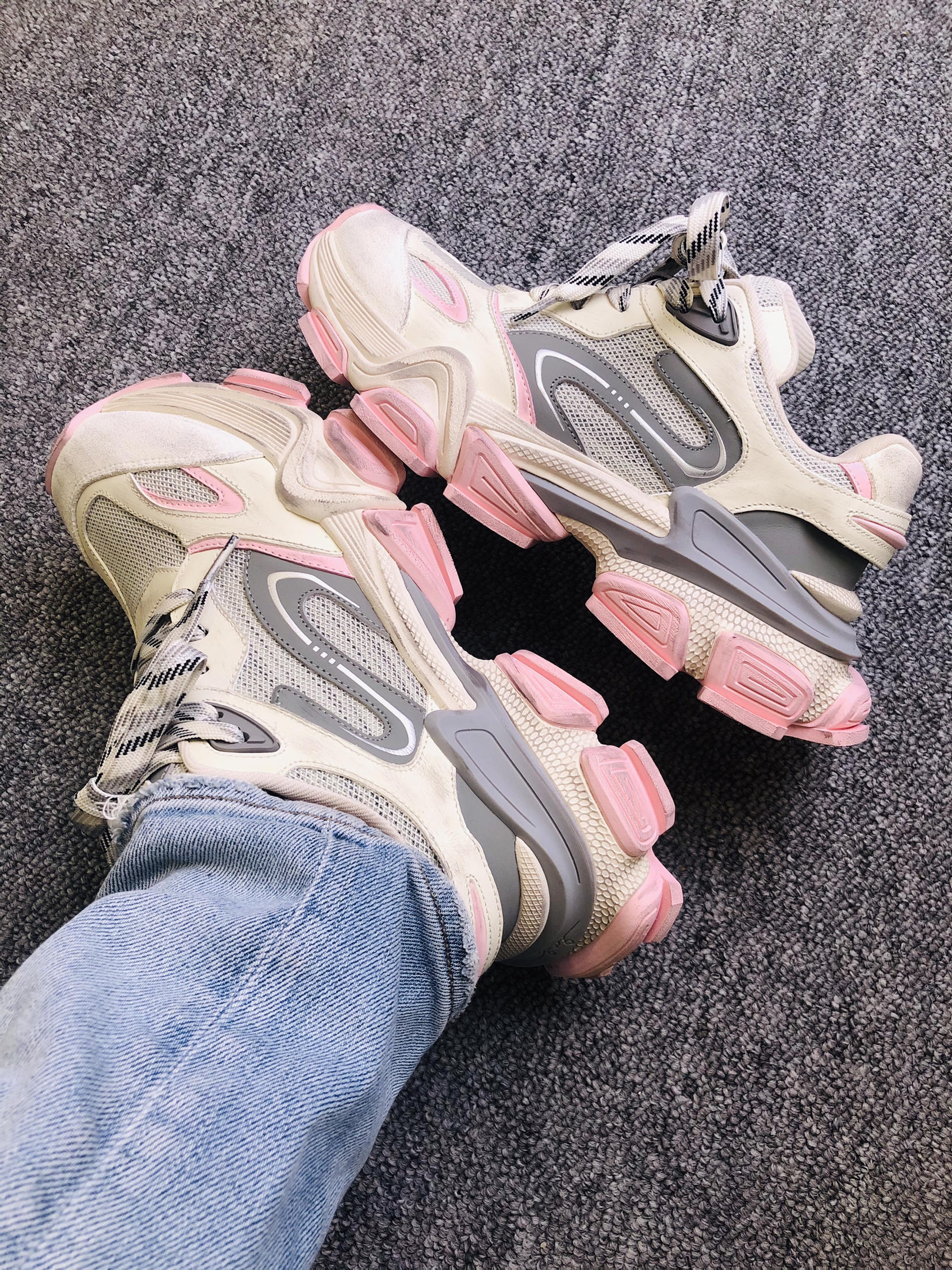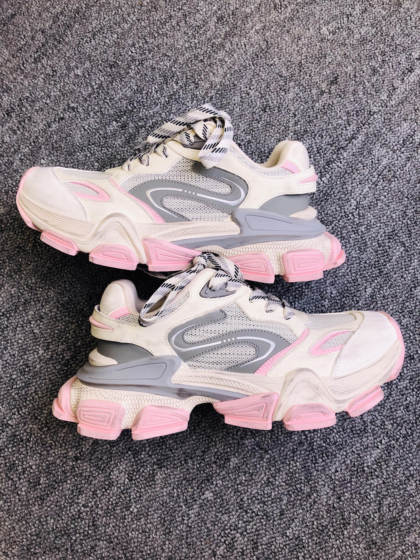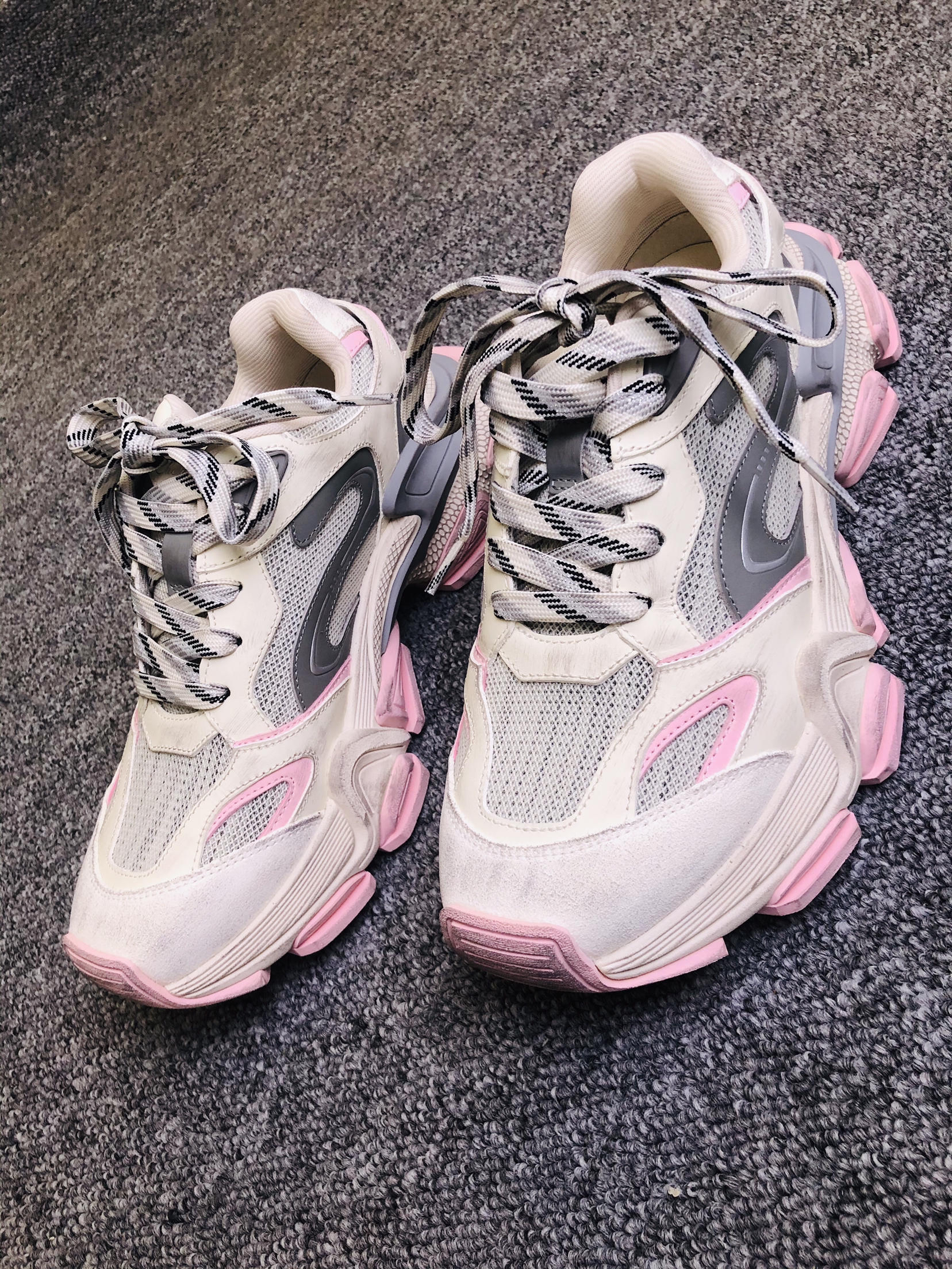 上脚瞬间:5cm厚底软得像踩发糕,但完全不笨重! 和闺蜜逛街半天,脚底板愣是没罢工,网布夹层透气不闷脚,汗脚夏天也能苟住。 脏脏粉甜甜的感觉,鞋底纹路抓地也稳. 脏粉做旧配色专治选择困难,搭阔腿牛仔裤是90年代复古咖,配碎花裙秒变甜酷拽姐,低帮设计露脚踝,视觉拉腿3cm