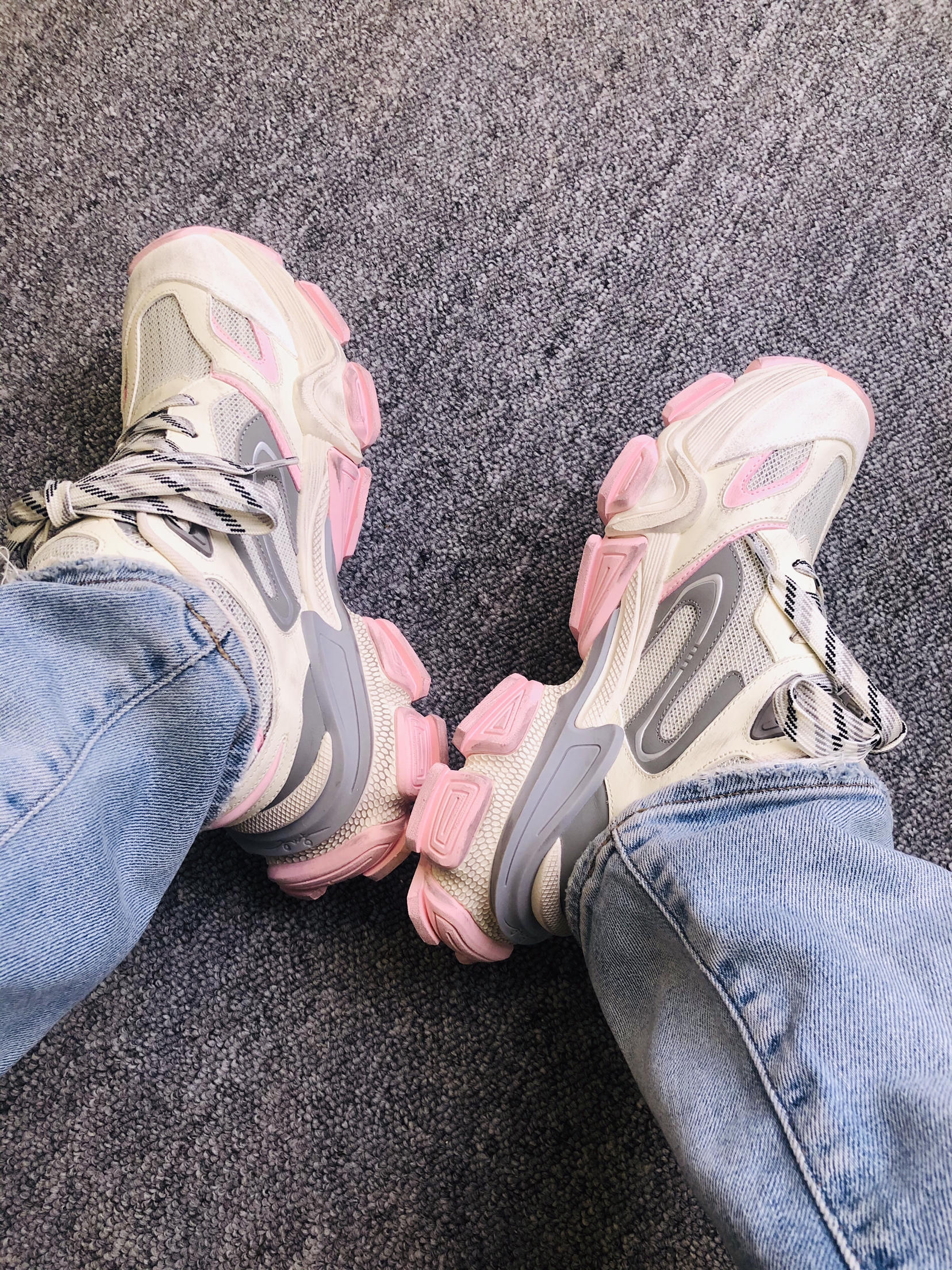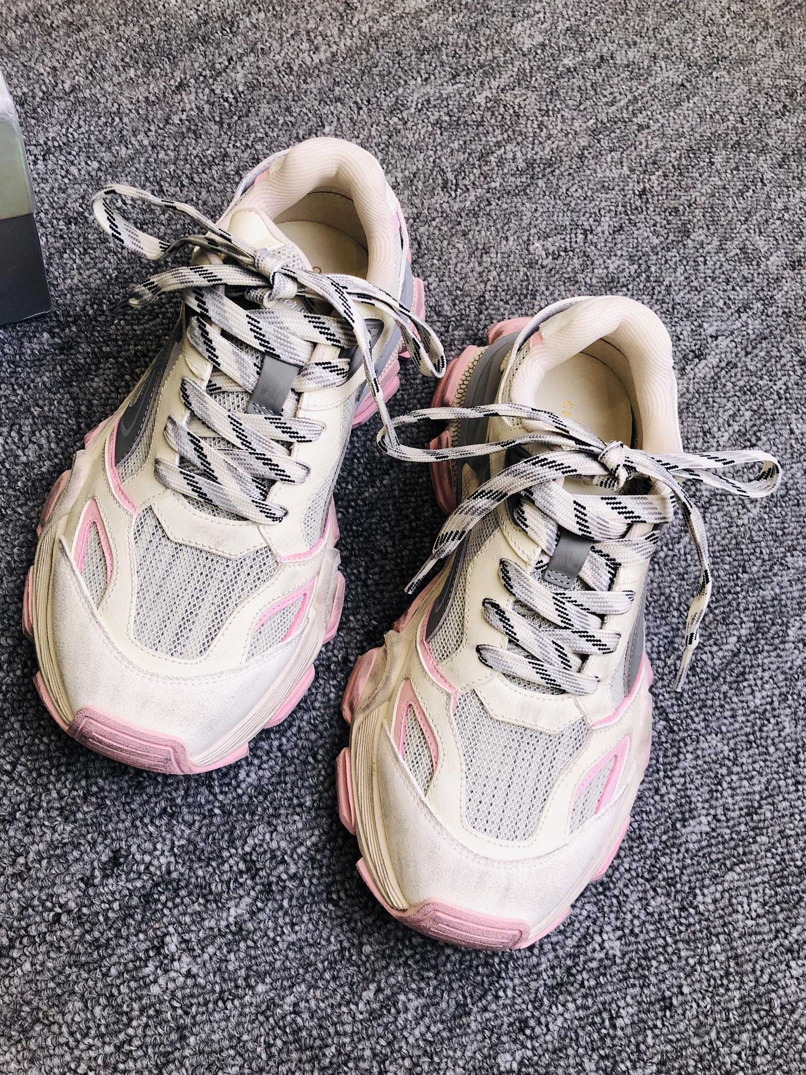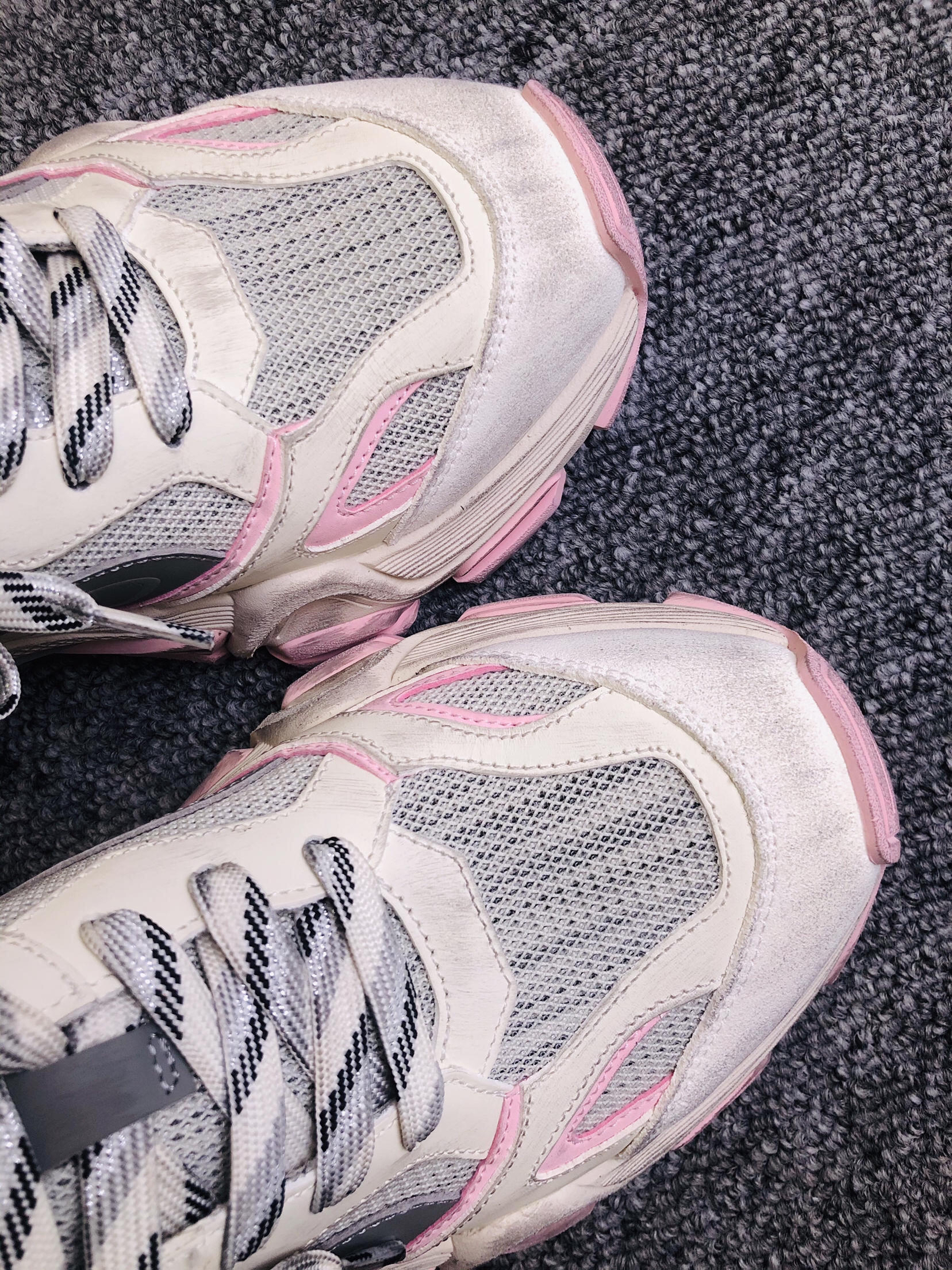上脚瞬间:5cm厚底软得像踩发糕,但完全不笨重! 和闺蜜逛街半天,脚底板愣是没罢工,网布夹层透气不闷脚,汗脚夏天也能苟住。 脏脏粉甜甜的感觉,鞋底纹路抓地也稳. 脏粉做旧配色专治选择困难,搭阔腿牛仔裤是90年代复古咖,配碎花裙秒变甜酷拽姐,低帮设计露脚踝,视觉拉腿3cm