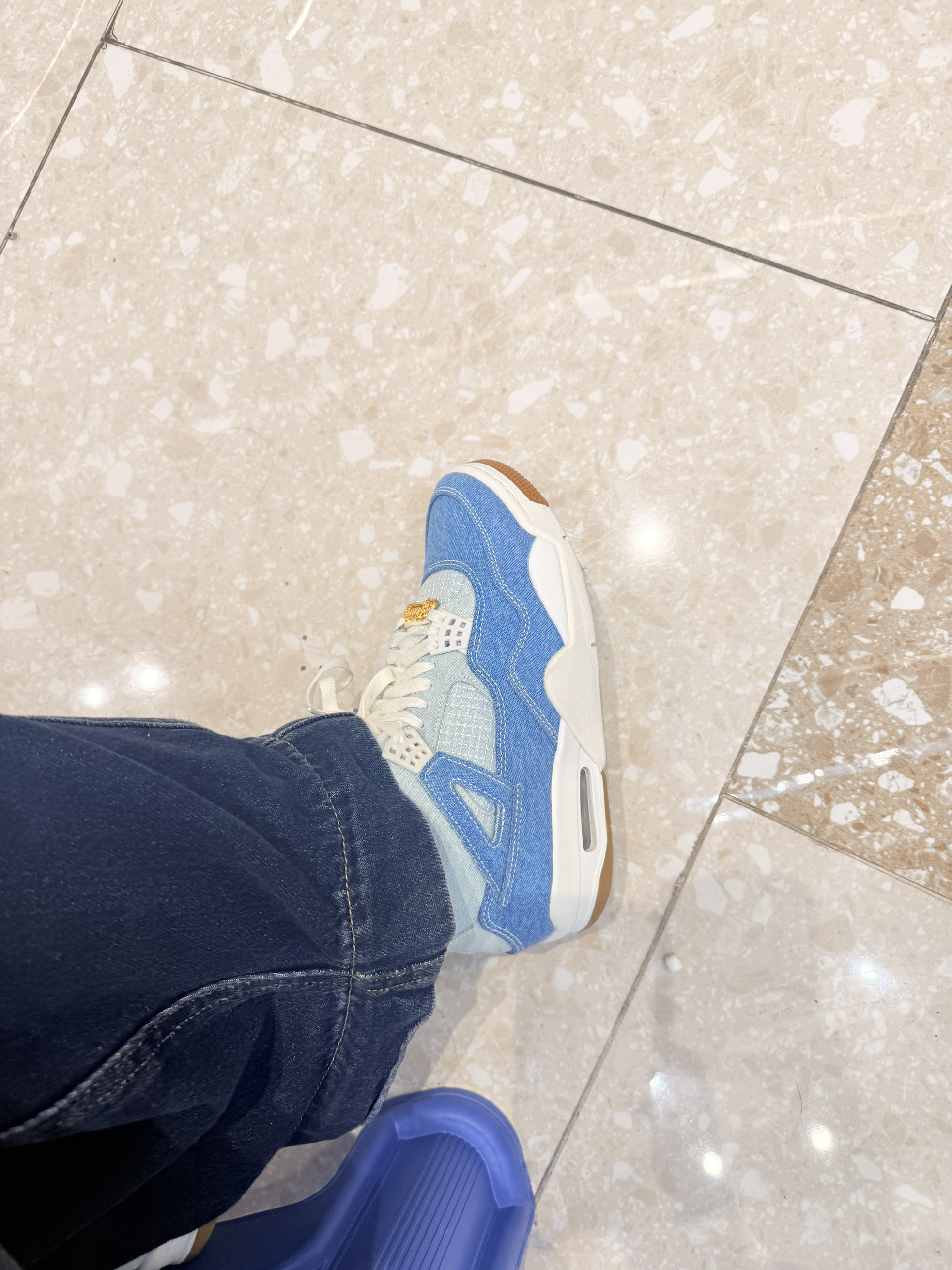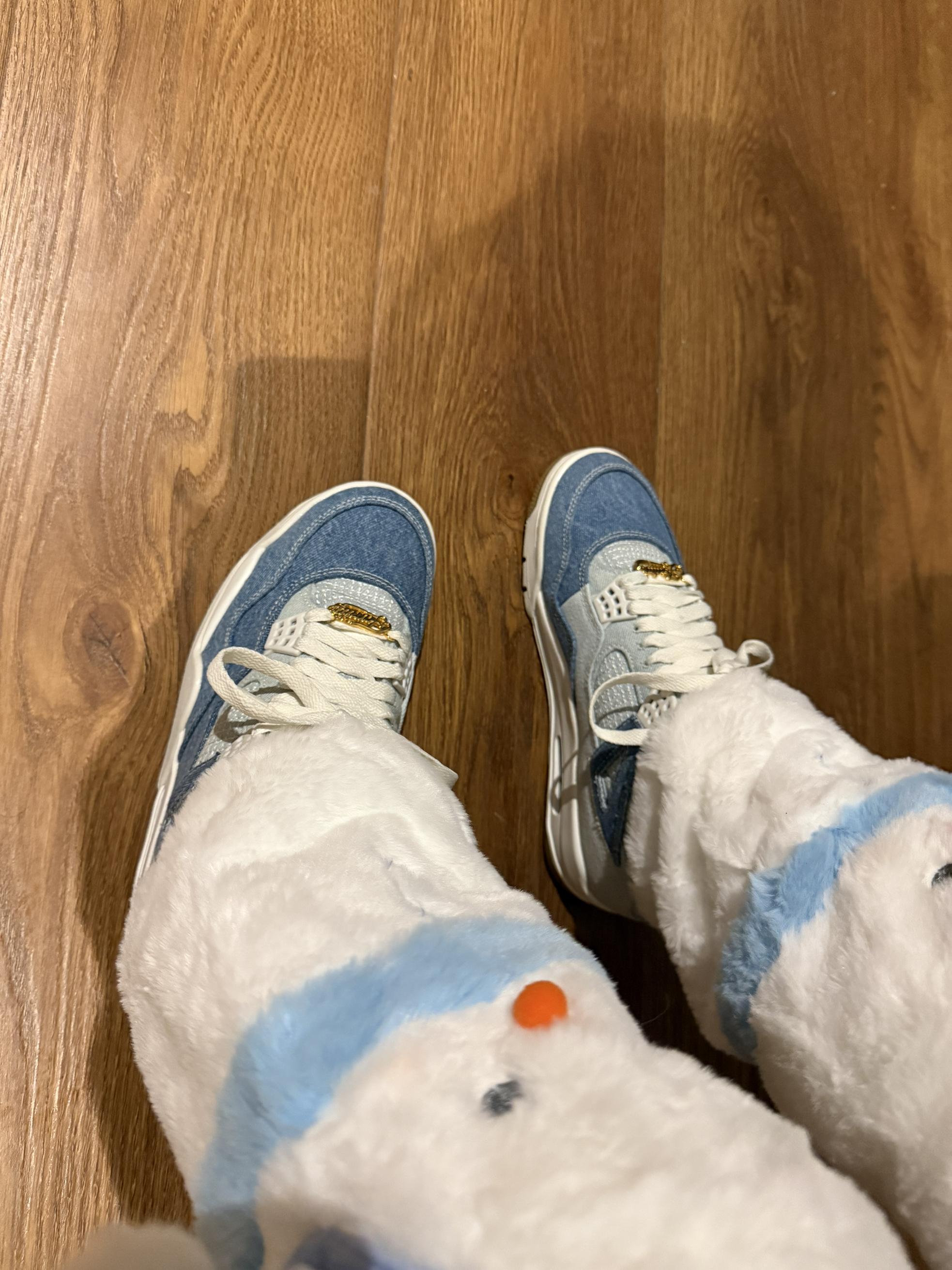 谁懂啊!这双AJ4牛仔蓝上脚直接焊在脚上了🤩 浅水洗牛仔布+奶白鞋身,特别帅气.金扣细节直接戳中我——低调但显贵气,复古感和街头感平衡得刚好~ 今天搭了条毛绒雪人机毛绒腿套,软fufu的白蓝撞色和鞋子完美呼应,走在街上被问了三次链接!鞋子脚感也很顶,透气网面+缓震中底,逛一下午街都不觉得累👟