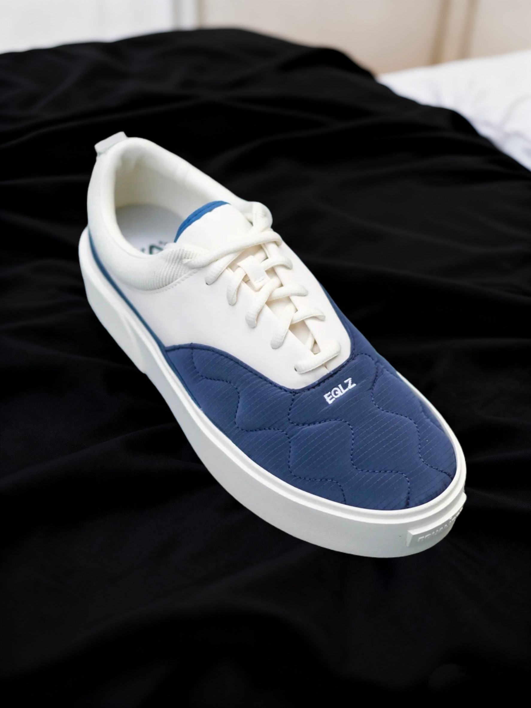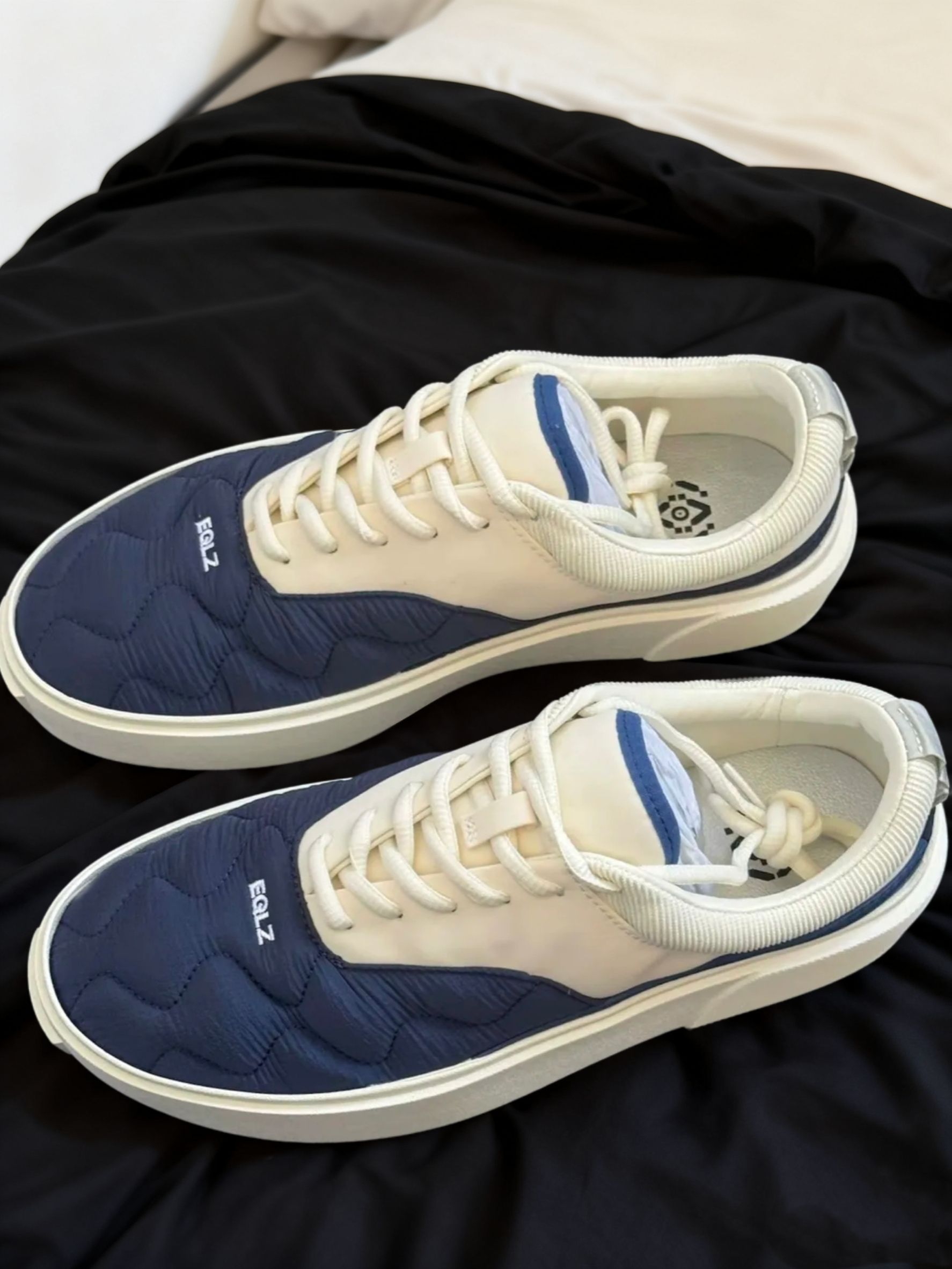 这鞋面料像软薄的压纹布,轻便但容易皱,白色部分是类似皮质的软面,贴脚不闷脚。鞋底有点厚度,走路挺软和,但搭裤装得注意——阔腿裤显拖沓,修身牛仔裤或短款运动裤更和谐,配色是百搭的米蓝,但材质偏休闲,不太搭正式风格👟。