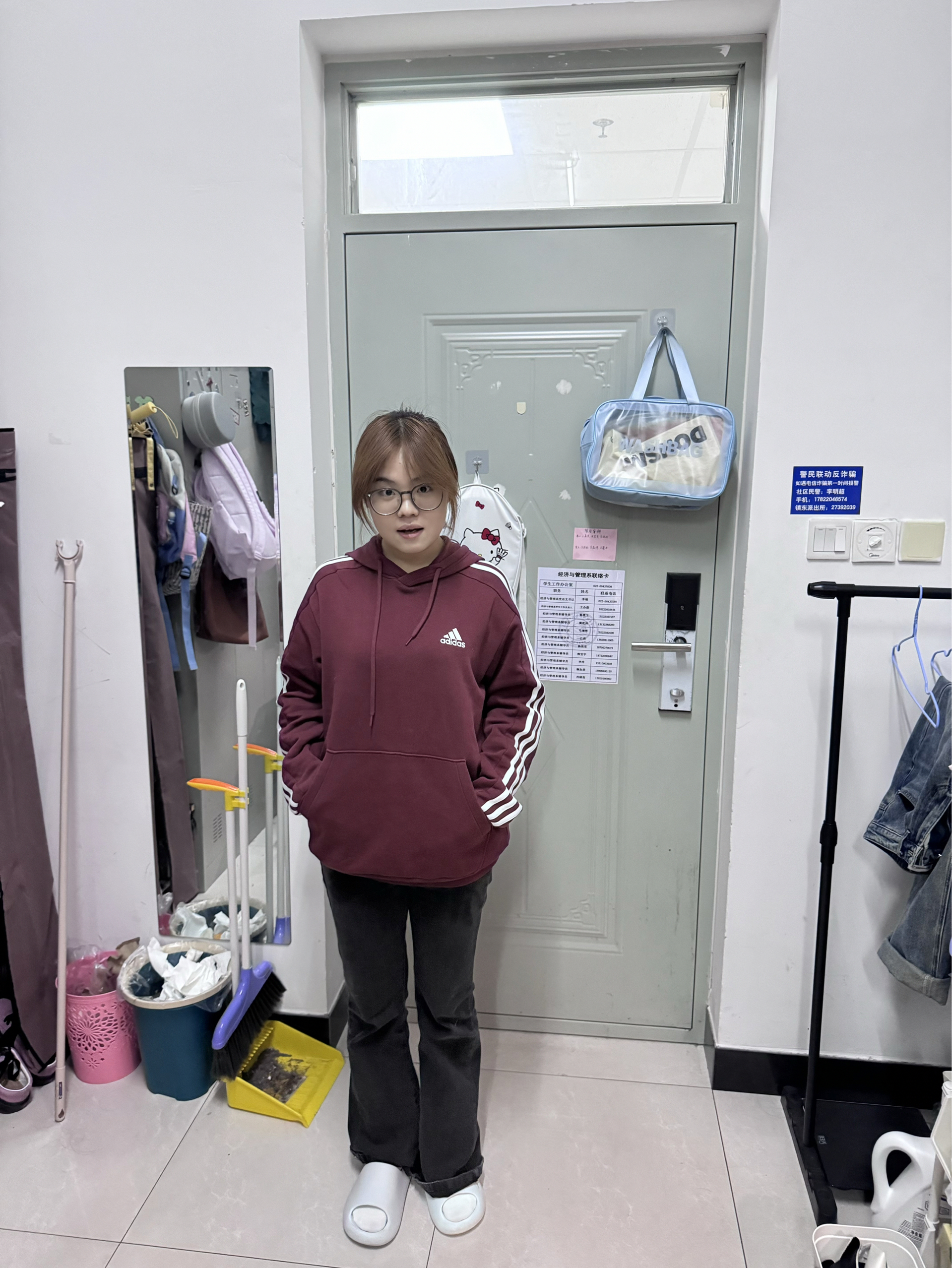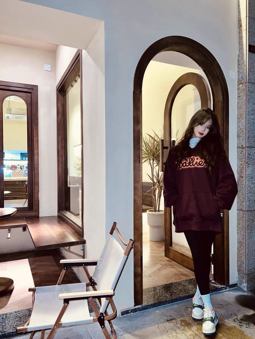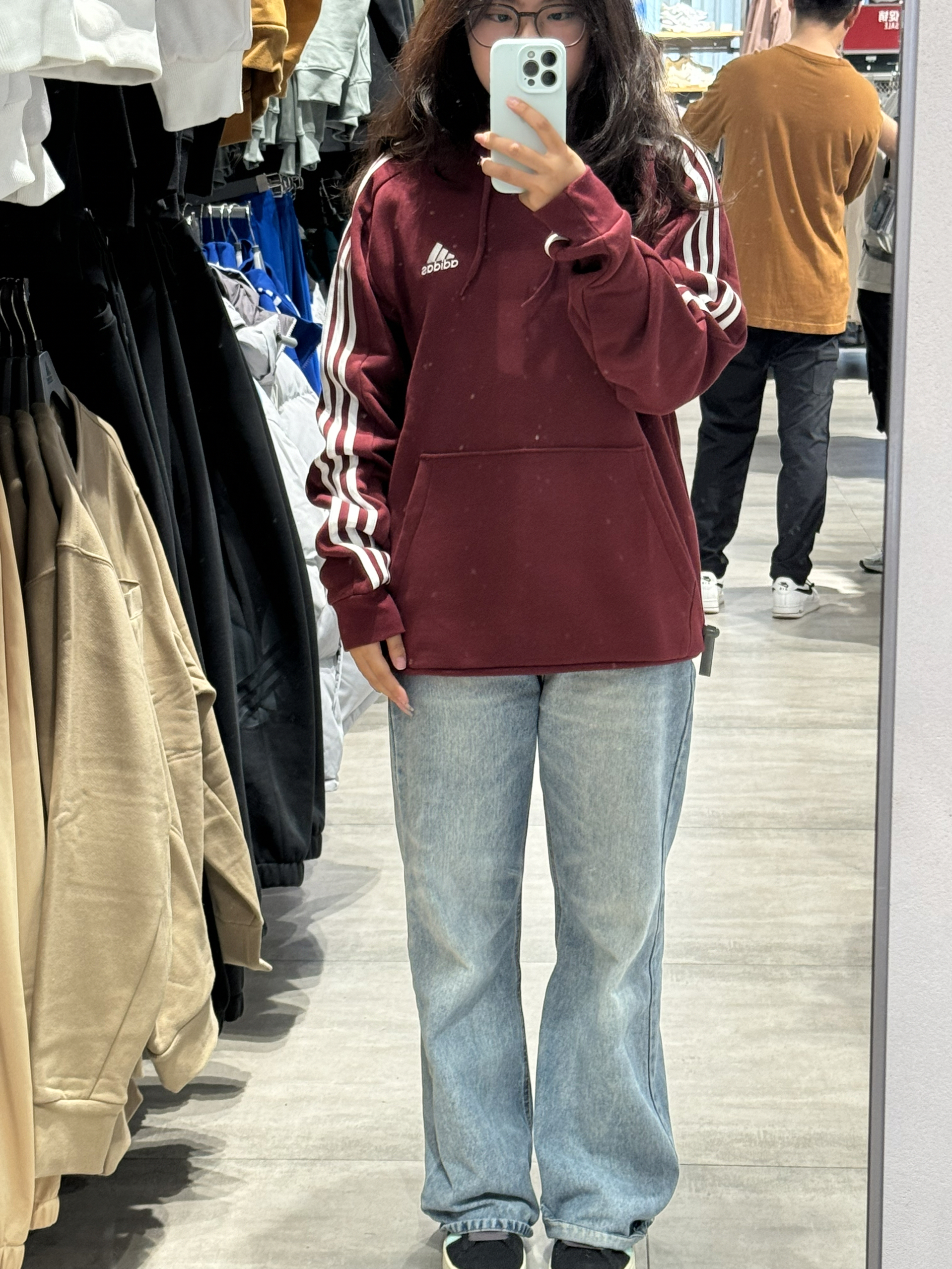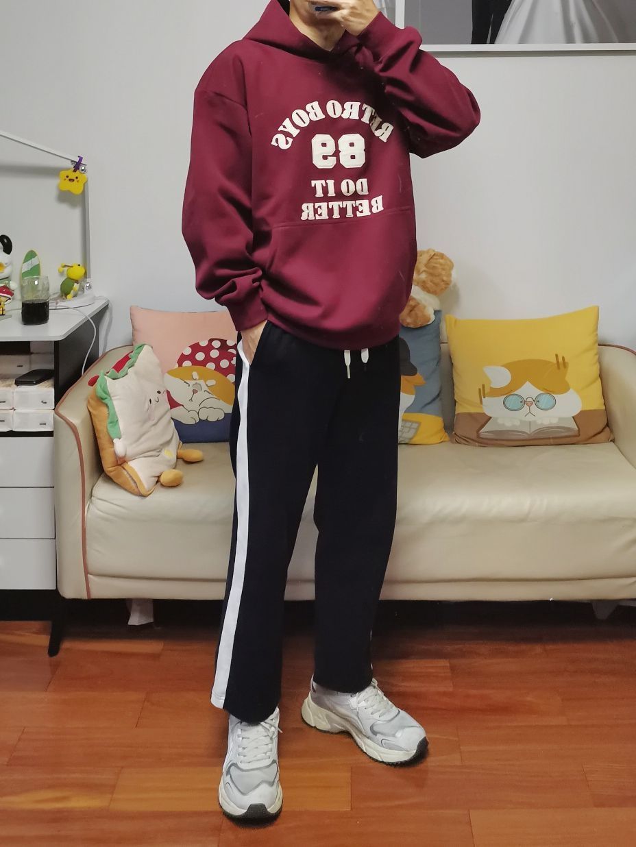 身高|体重:160cm|55kg 👔 上衣:酒红色阿迪达斯卫衣 👖 下装:黑色裤子