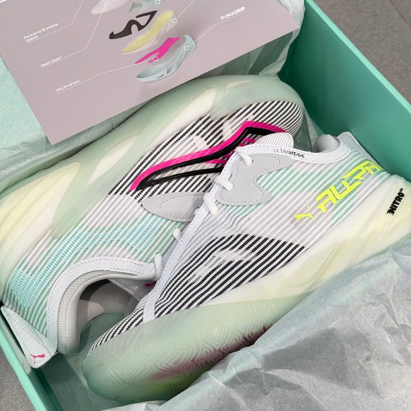 延续初代低帮流线型鞋身,ALL-PRO NITRO 2以纯白为 主基调,粉色与淡蓝色以自由感勾勒出流线型轮廓。 鞋头标志性的PUMA Formstrip条纹被亮眼的粉色点 亮,而后跟与大底的淡蓝点缀则像球场上空流转的气 流,将视觉轻盈感与竞技张力完美融合,视觉冲击力 十足。 鞋面采用PWR Print科技,轻盈透气的同时亦稳若磐 石。革新系带系统从中底延伸至鞋面,精准锁定双 脚,侧向移动时安全感拉...