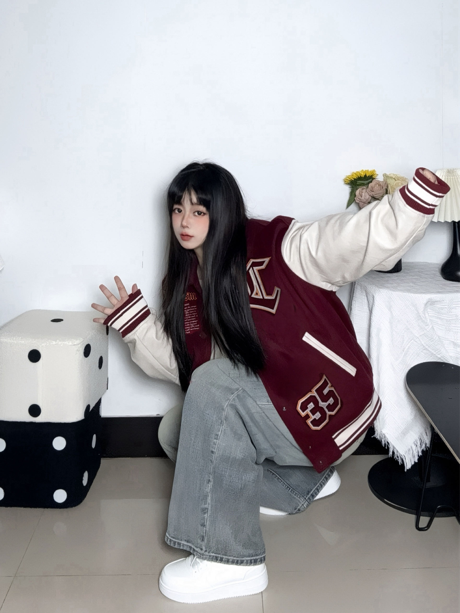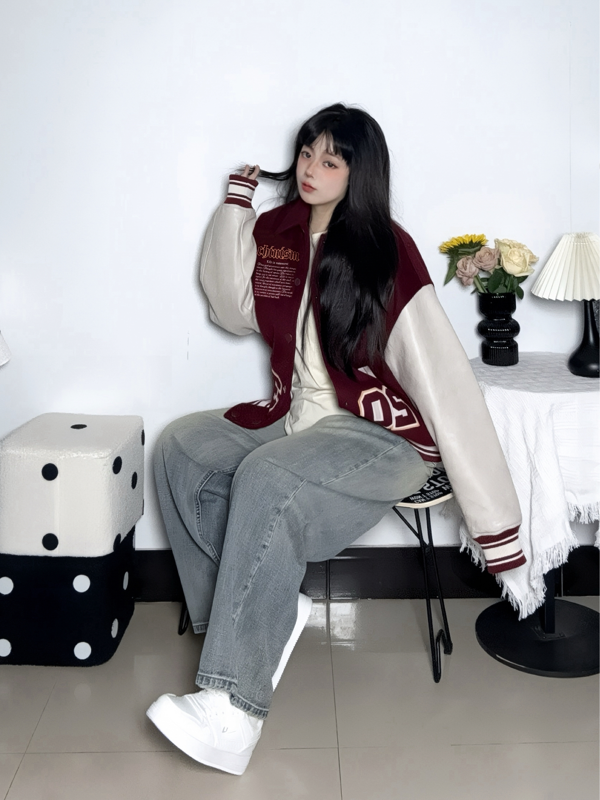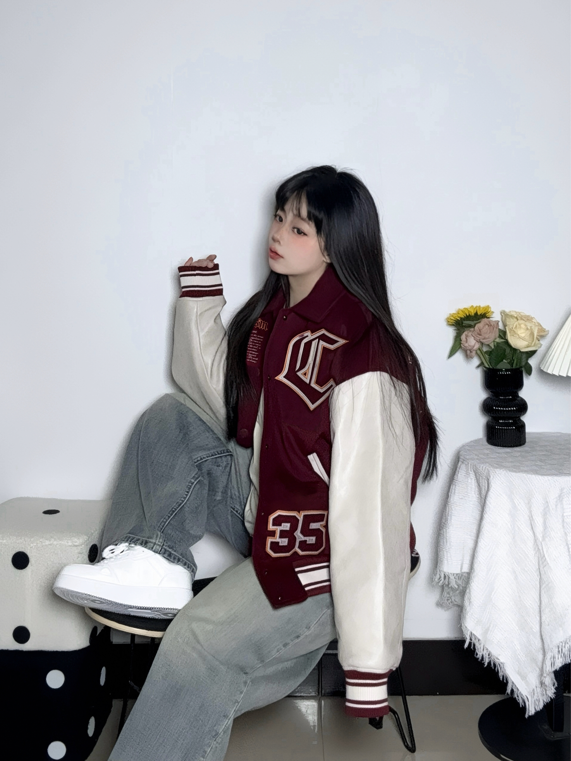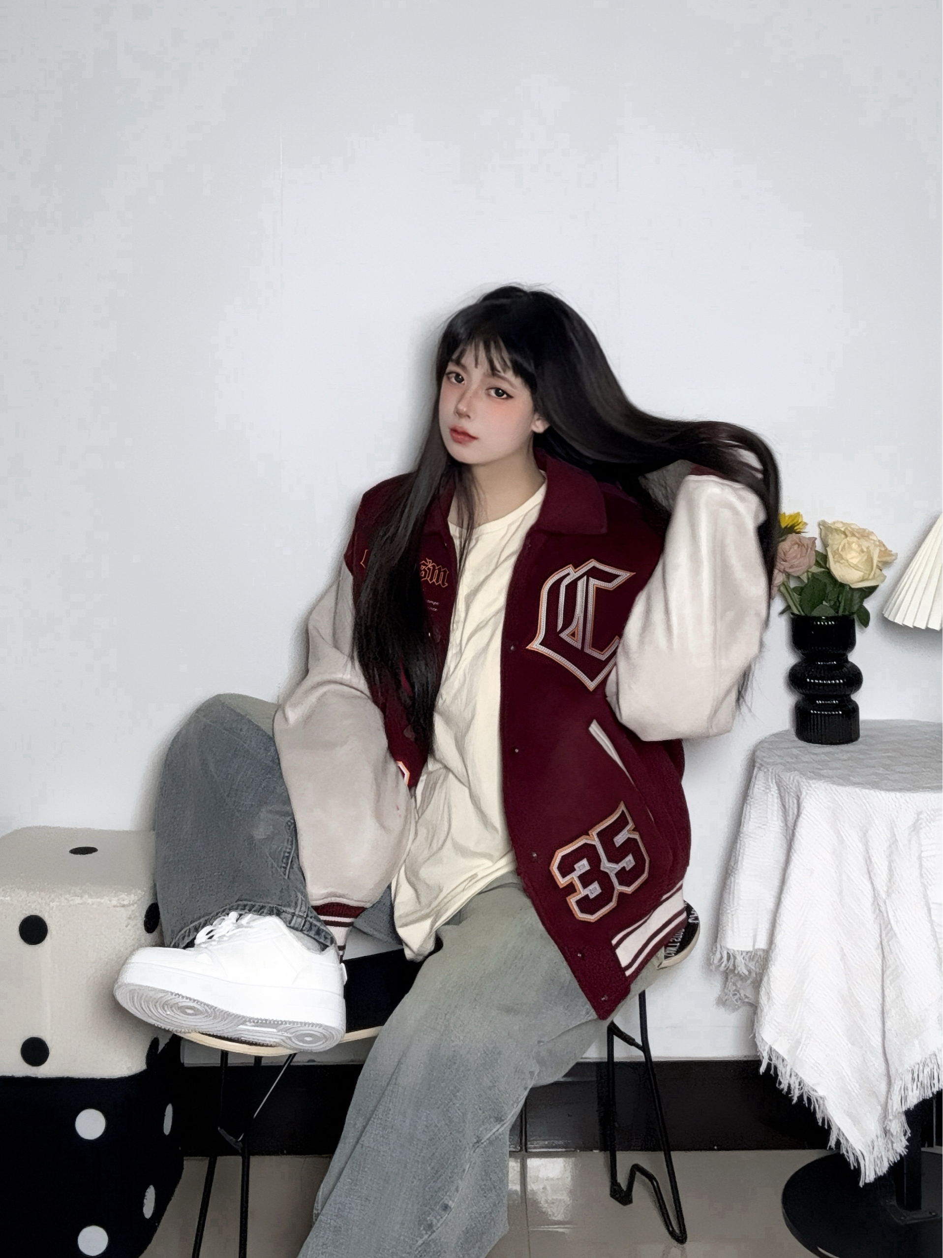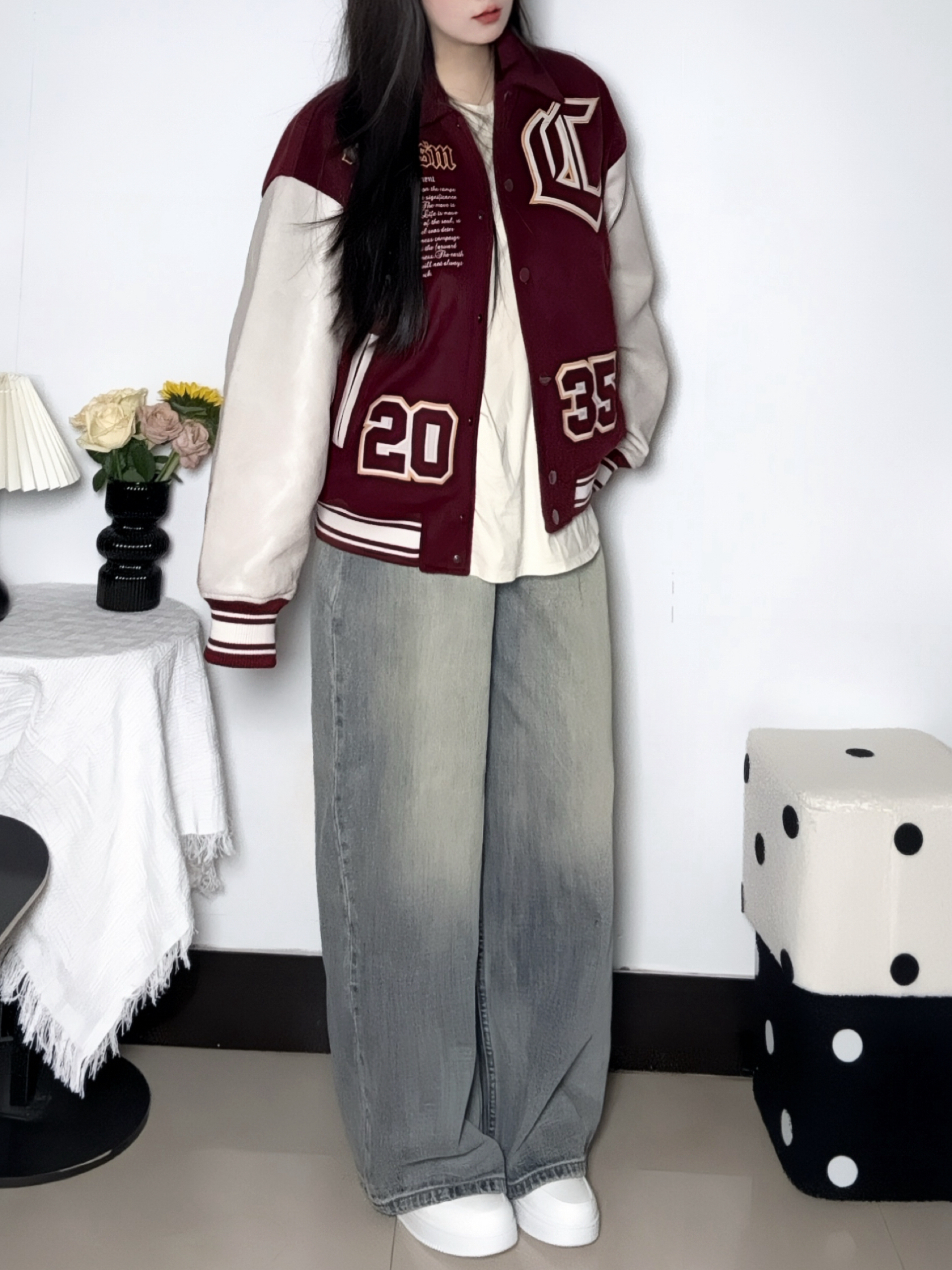 今天穿酒红拼白的棒球服 加棉的厚度下雪穿也不会冷哦 Pu拼接平时也更好打理啦 - 脚上这双基础加绒小白板鞋 是带点厚底的款式 不担心冻脚 感觉压马路也不会累jio 配色也干净更好搭衣服 刚好衬得整体不杂乱 日常这么穿还挺自在的~ 参考尺码:均码