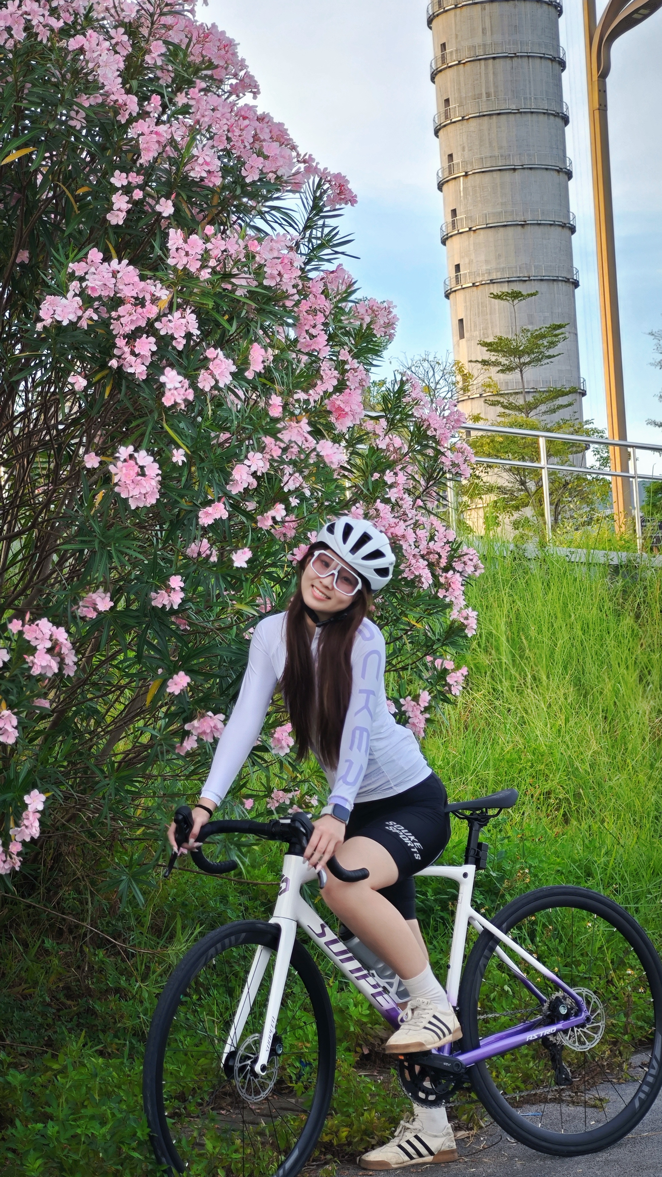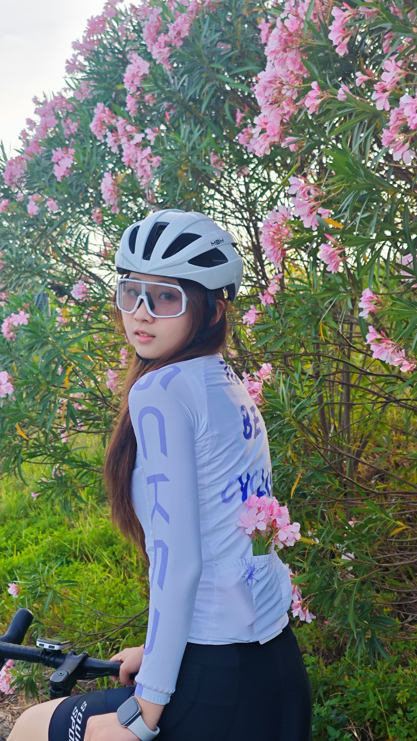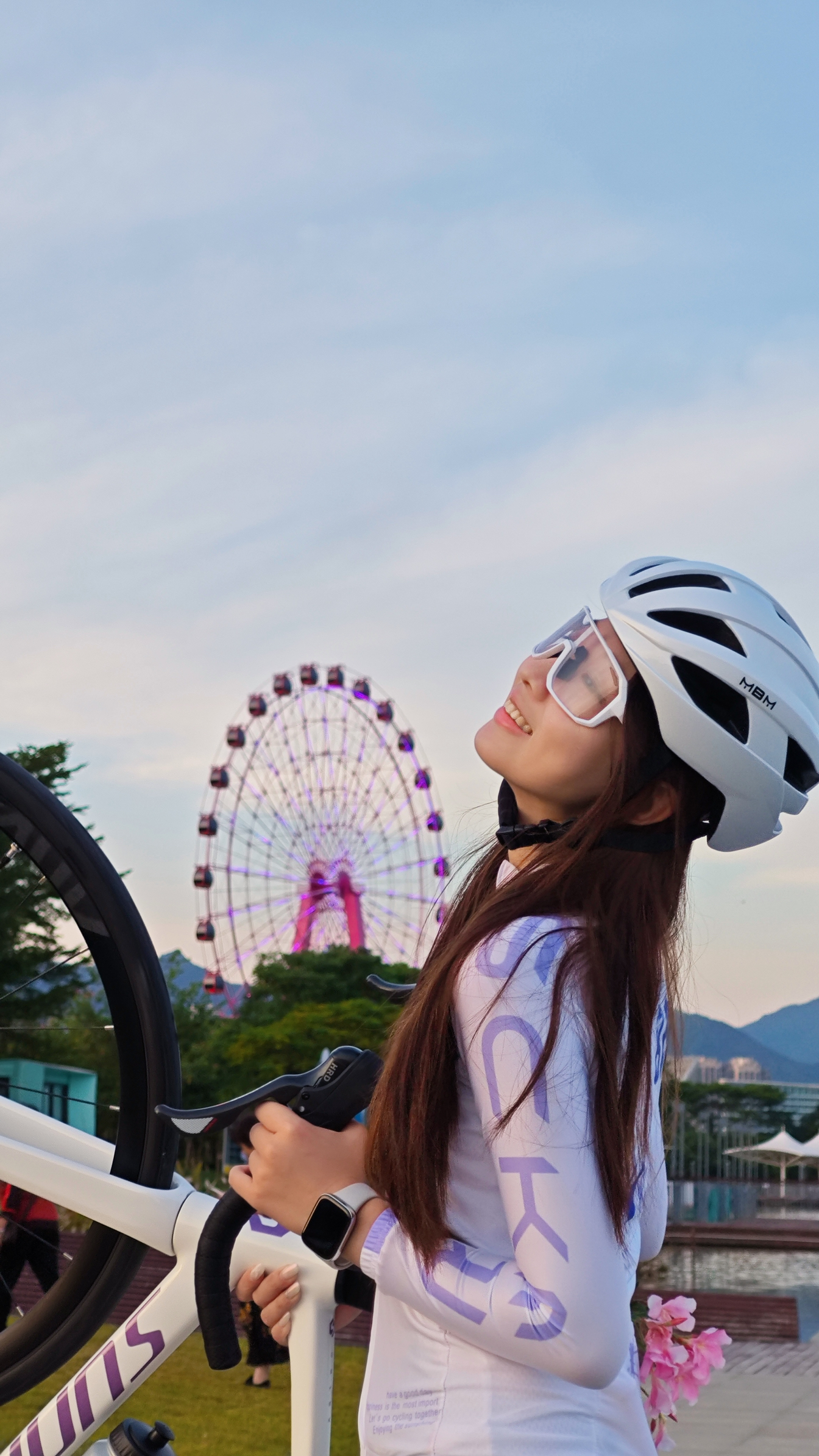 当骑行服遇见盛开的花墙🌷 纯白战袍与粉色花海撞个满怀 把秋天藏进背后口袋 带着一整片温柔继续前行 最爱摩天轮下的巧合瞬间 举起爱车 让车轮与幸福同频转动 秋风拂过长发的时刻 突然懂了骑行的浪漫主义 骑行穿搭清单: ▫️白色骑行服+紫色印花|背后口袋装得下整个秋天!面料轻薄透气,秋日骑行不闷汗 ▫️黑色骑行裤|修身剪裁勾勒骑行线条 ▫️白色长袜+运动鞋|简约搭配永不过时 ▫️白色头盔+骑行镜|安...