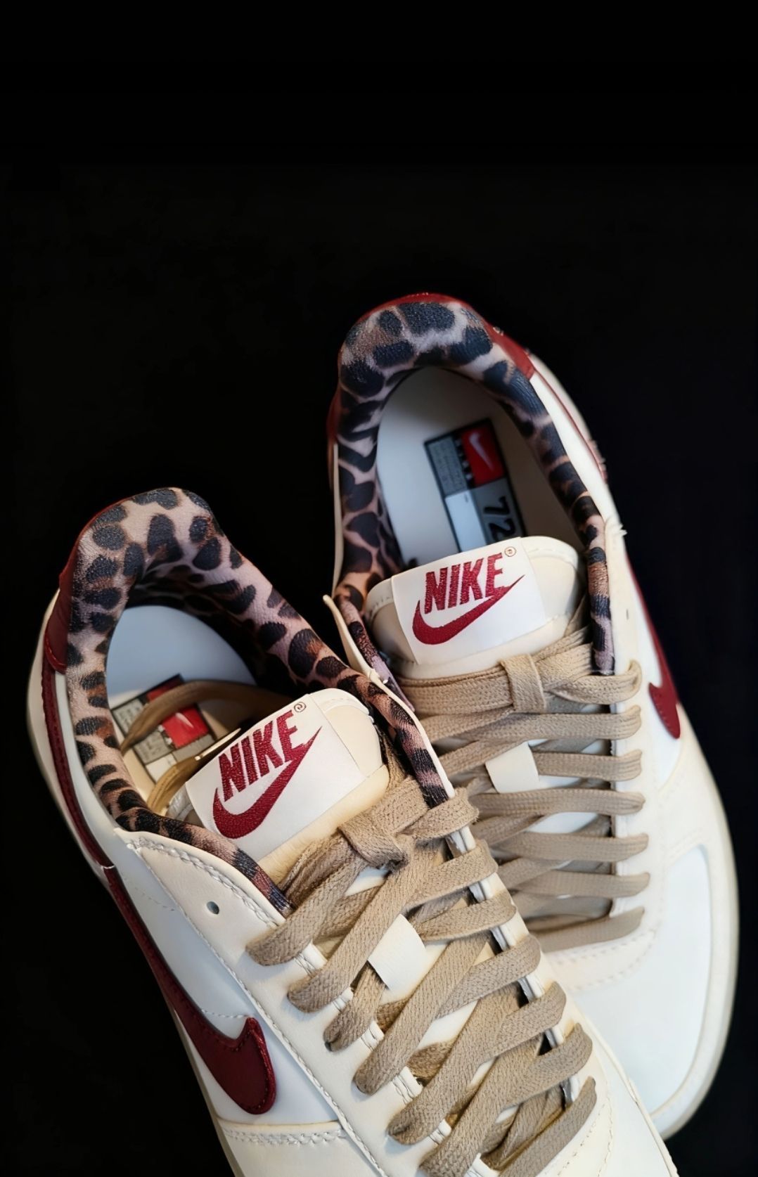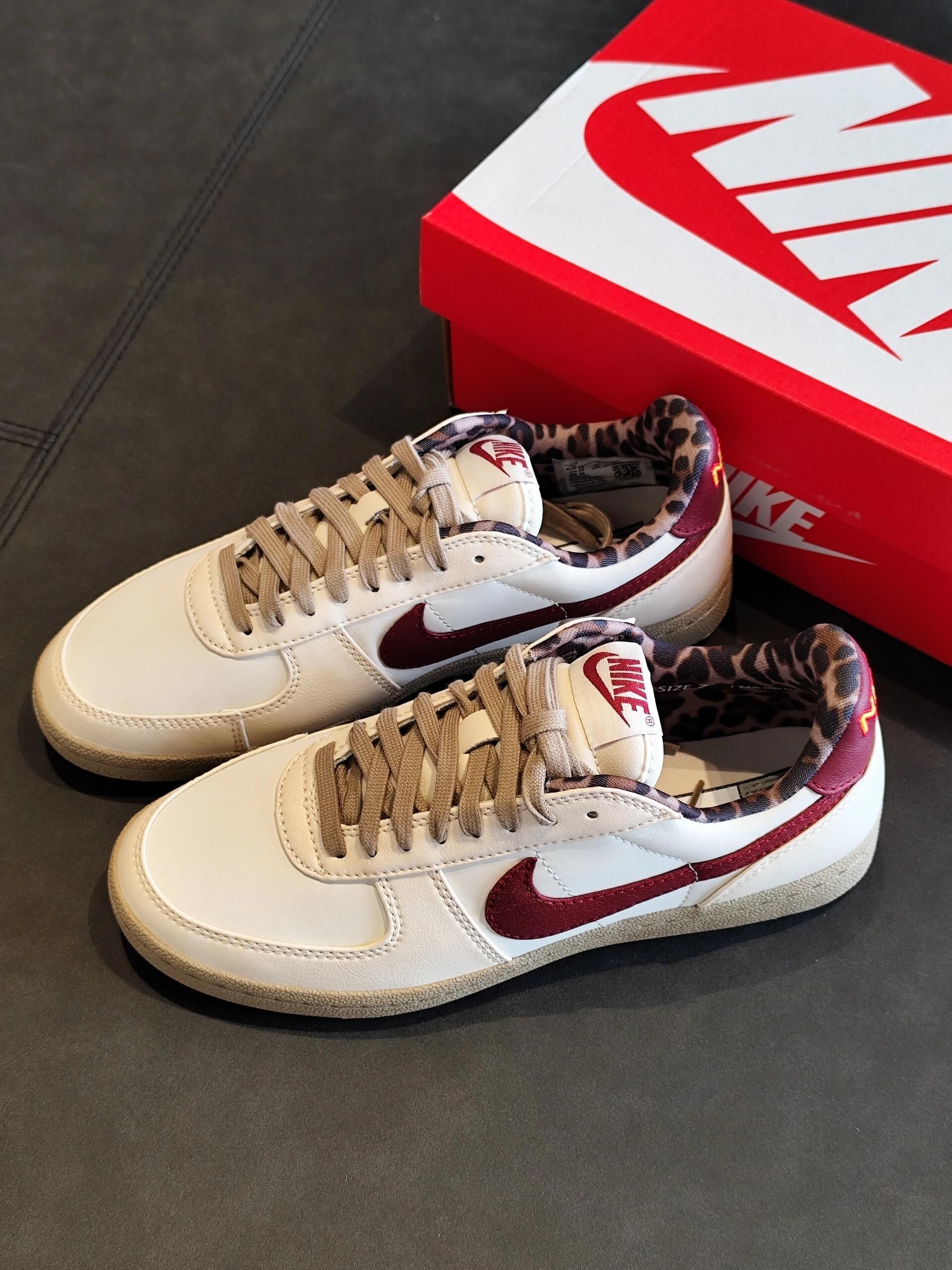 ✅ 核心亮点 1️⃣ 设计语言:米白鞋身搭配酒红钩子,豹纹内衬打造「含蓄的野性」 2️⃣ 材质组合:头层牛皮鞋面搭配仿貂毛内衬,触感与视觉双重享受 3️⃣ 细节把控:后跟复古刺绣采用做旧工艺,生胶大底还原90年代质感 🔥 穿着体验 ・ 加厚鞋垫提供持久缓冲,逛展三小时依然舒适 ・ 鞋领豹纹内衬在卷裤脚时自然显露设计巧思 ・ 中底弯折度经过优化,前掌自然弯曲无压迫感