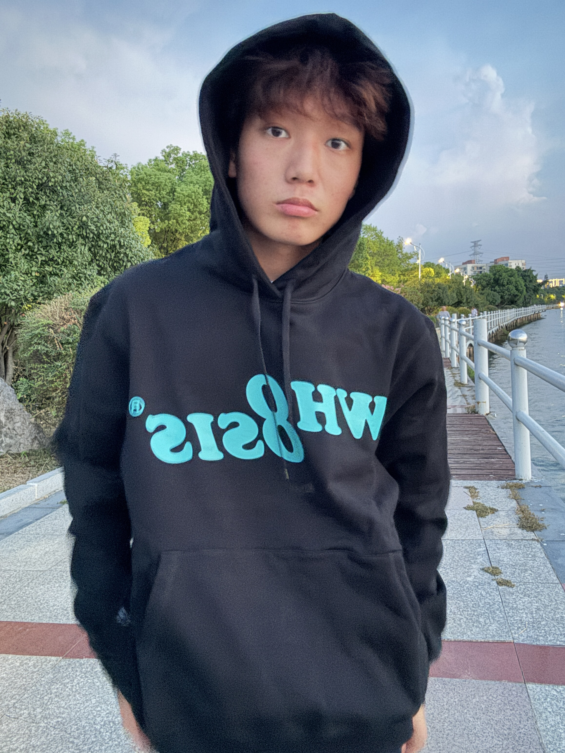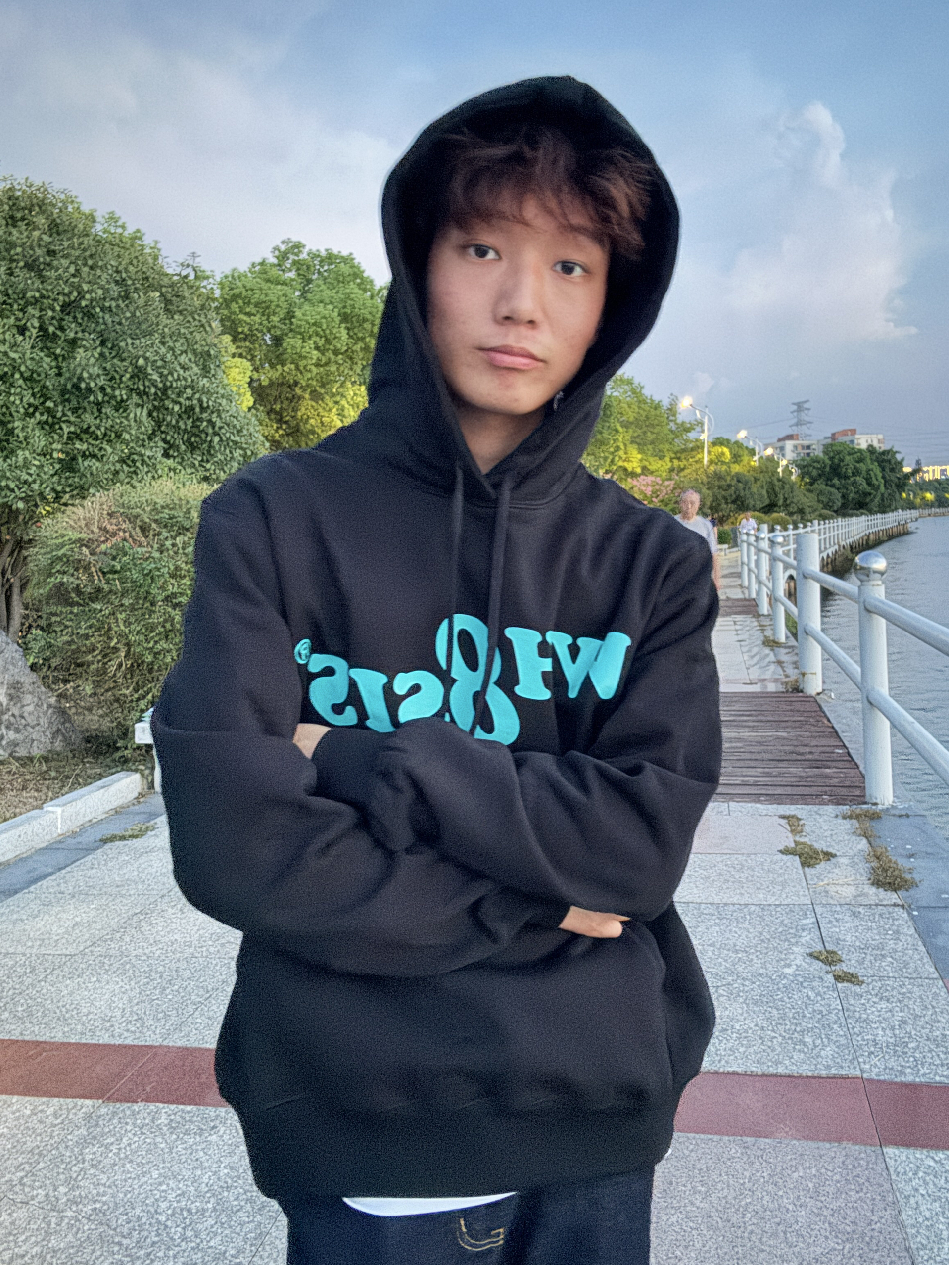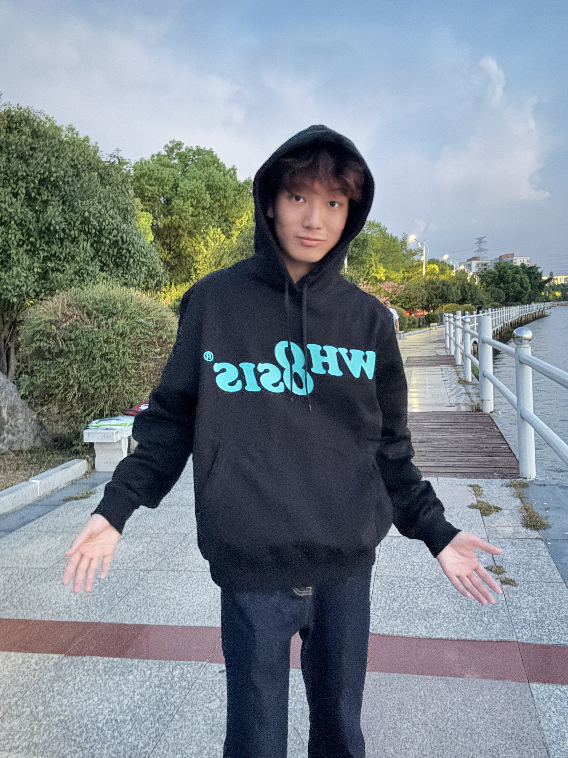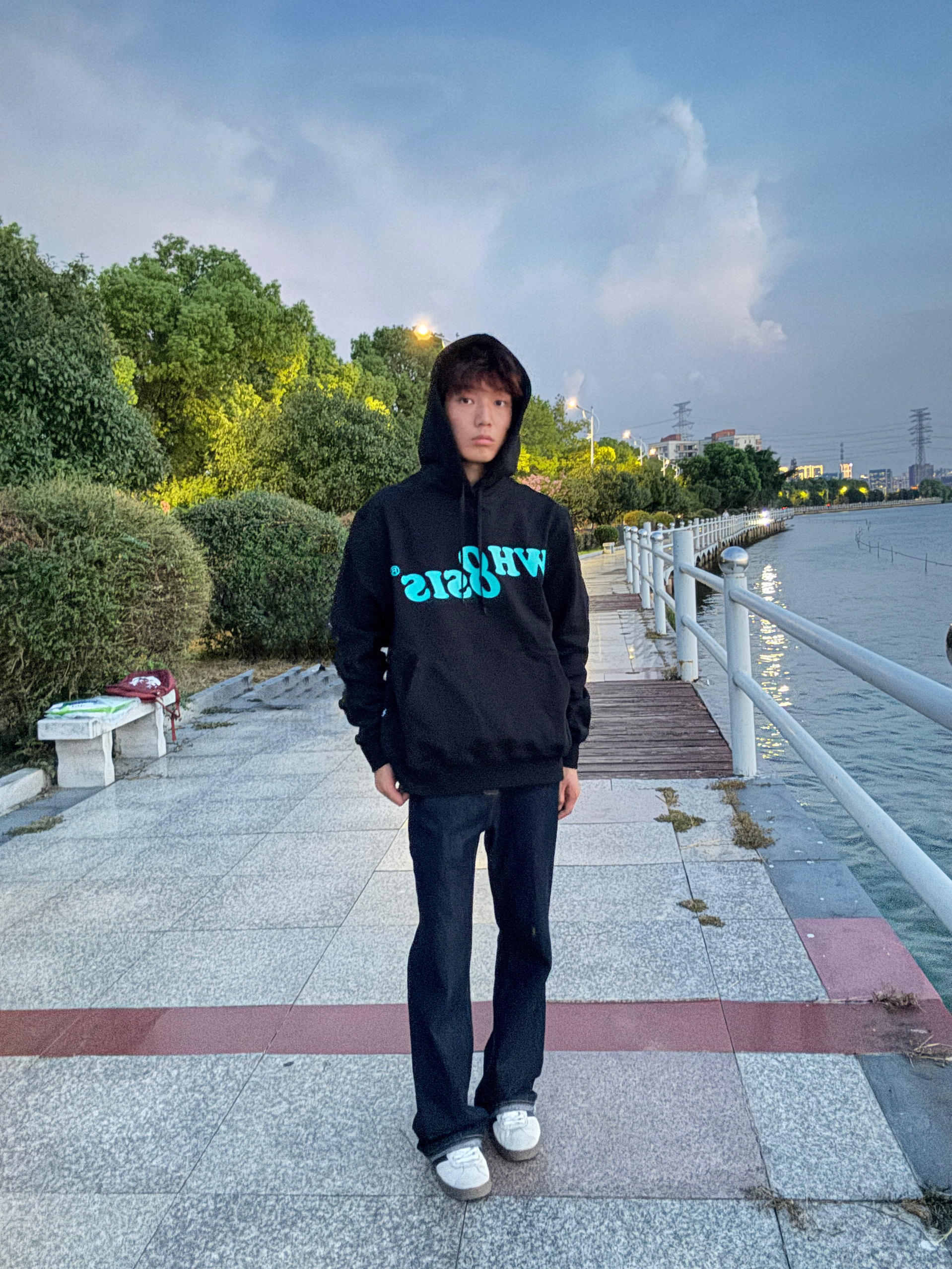 经典黑色百搭又高级,胸前亮眼的蓝绿色字母印花超吸睛,瞬间让整体造型有了亮点✨ 连帽设计随性又有范儿,不管是搭配牛仔裤,还是运动裤,都能轻松打造出街头潮流感,版型宽松舒适,不挑身材都能轻松驾驭,穿上它,秒变氛围感男神🥰 我的身高是176体重是115穿M码正合适.
