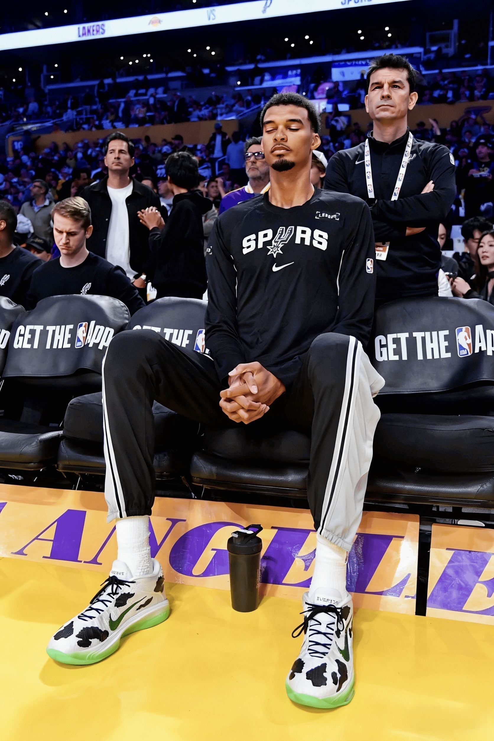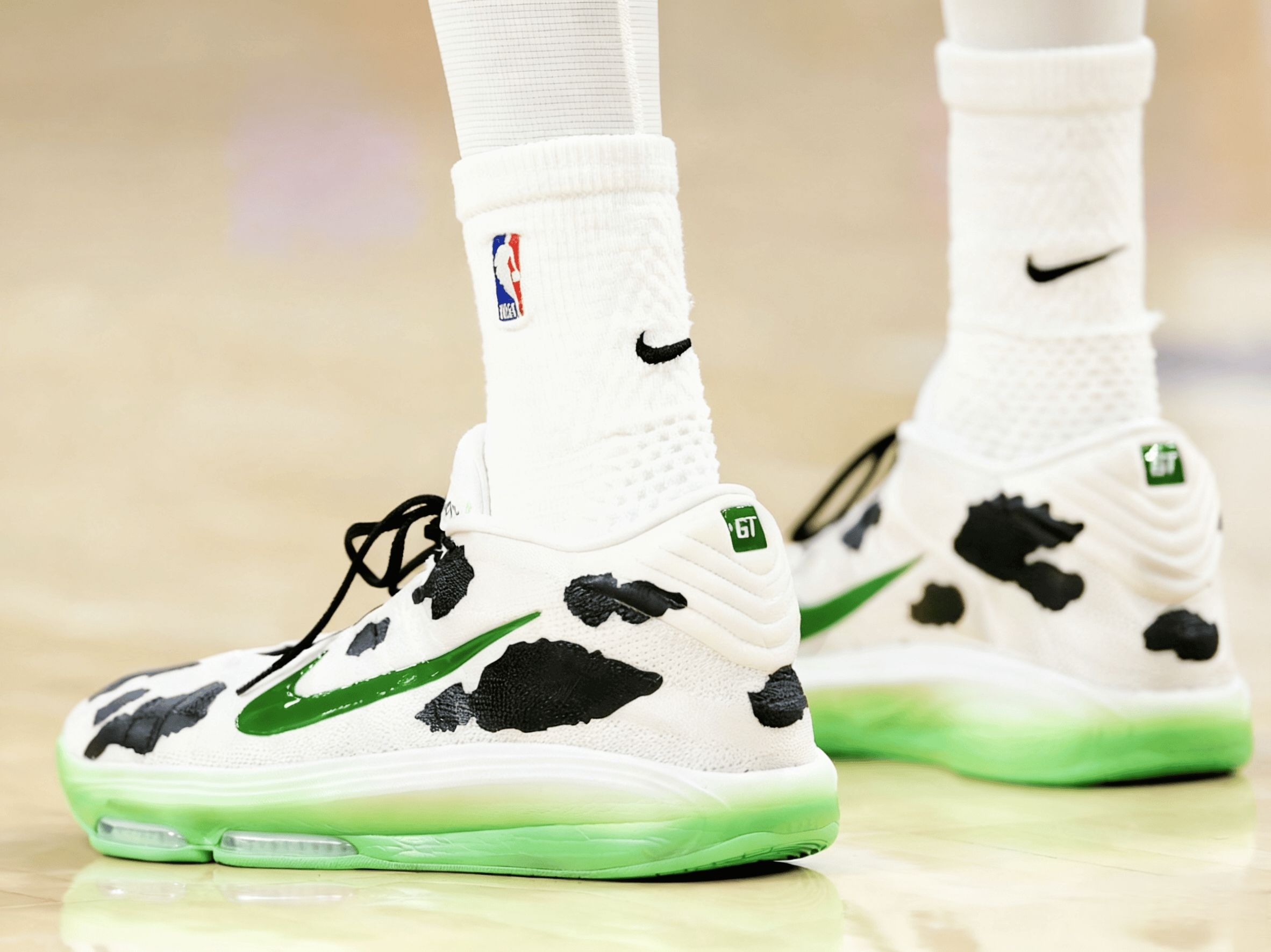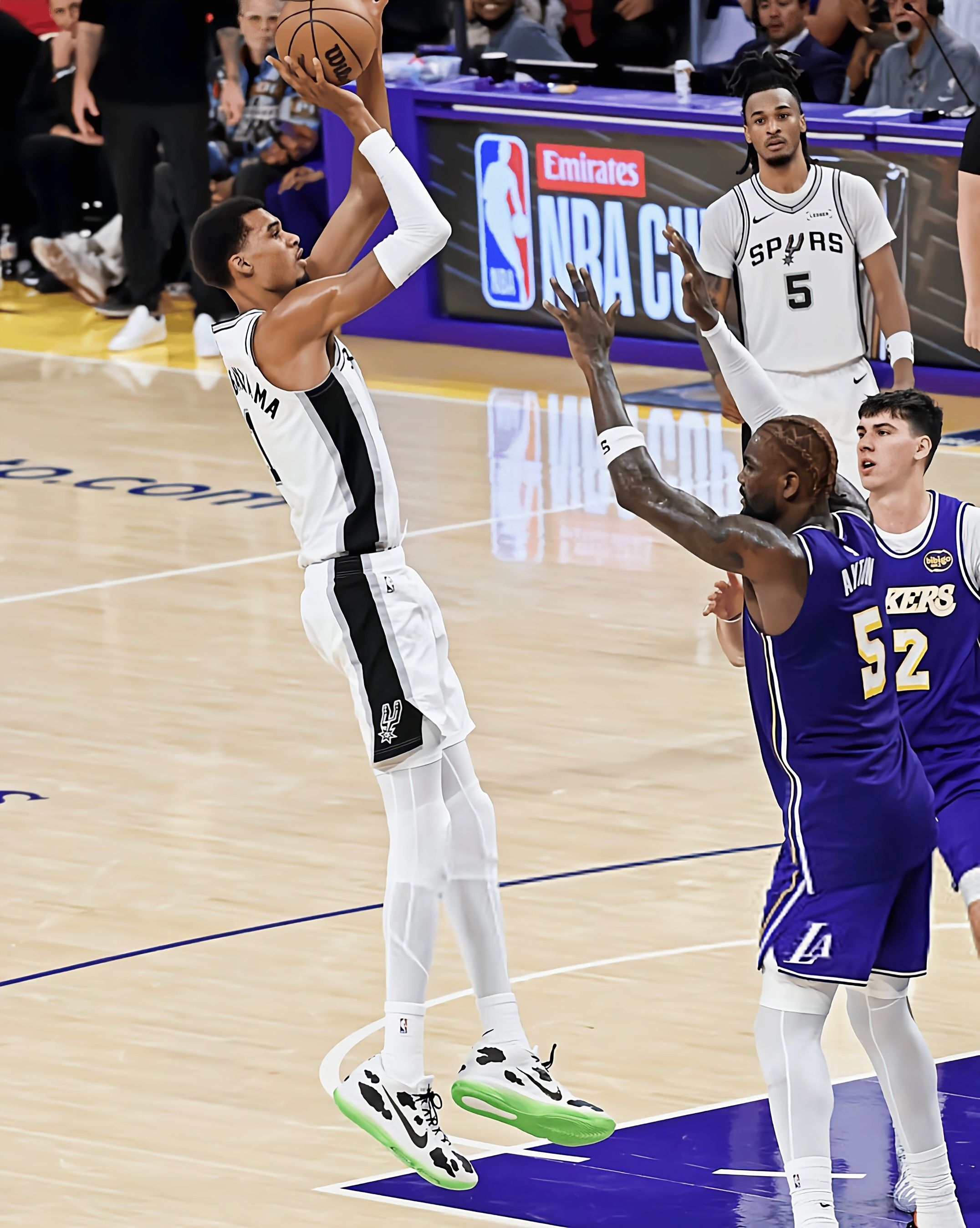 看马刺比赛时,文班脚上这双奶牛纹G.T. Hustle 3是真吸睛——黑白斑点配亮绿底,在球场上又扎眼又不违和。不过这配色是定制款,普通版的南海岸、纯白金这些配色也都好看,性能完全一样,不用盯着限定款。 从观赛角度看这鞋的实战表现,是真适配他这种高个的打法:他连续起跳封盖时,后跟落地的动作看着特稳,缓冲应该够扎实;突破变向那一下,前掌蹬地的节奏特别利落,估计气垫反馈够快,没拖动作;就连快攻冲起...