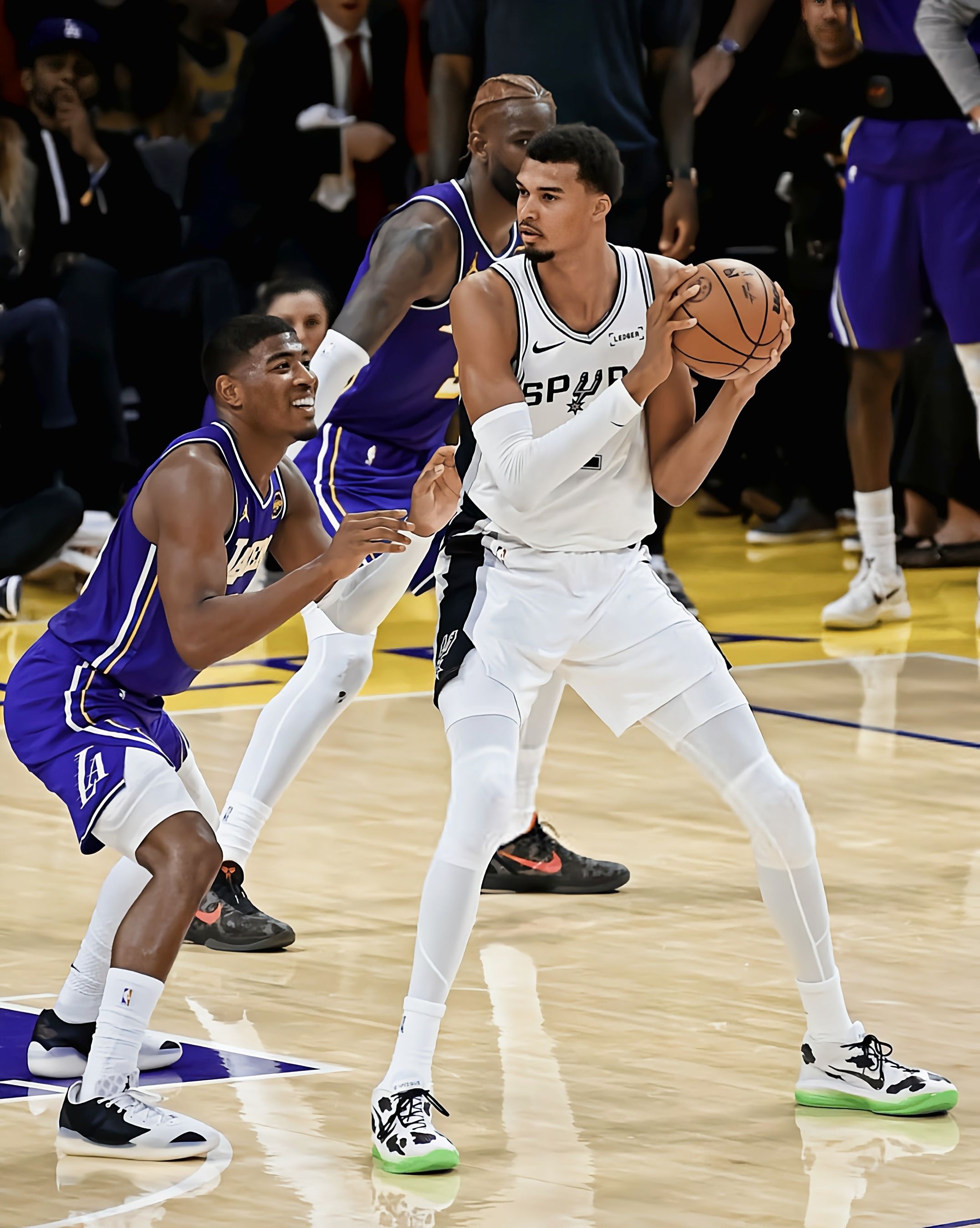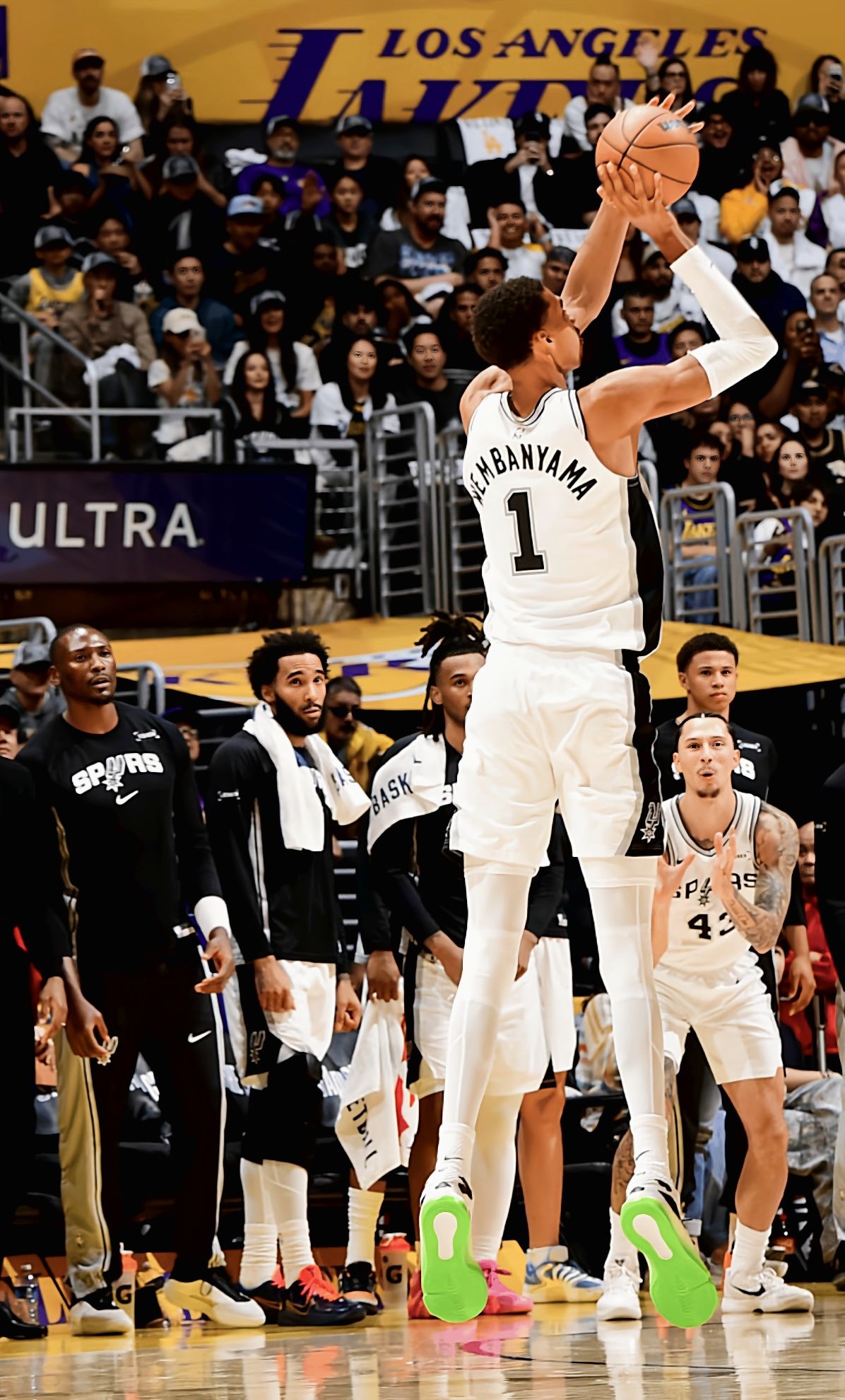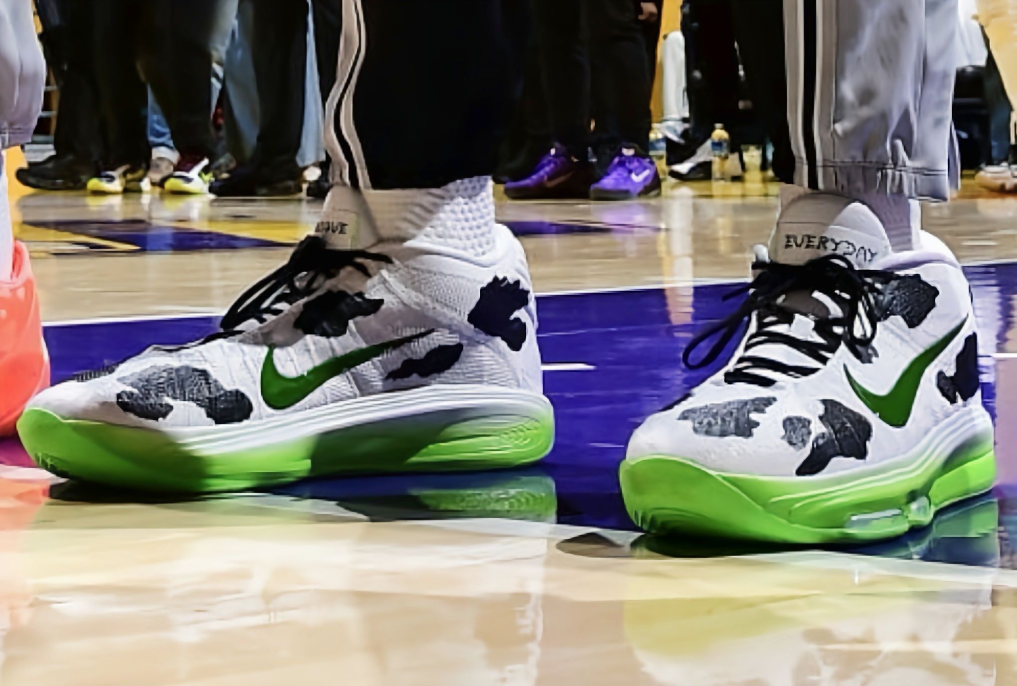 看马刺比赛时,文班脚上这双奶牛纹G.T. Hustle 3是真吸睛——黑白斑点配亮绿底,在球场上又扎眼又不违和。不过这配色是定制款,普通版的南海岸、纯白金这些配色也都好看,性能完全一样,不用盯着限定款。 从观赛角度看这鞋的实战表现,是真适配他这种高个的打法:他连续起跳封盖时,后跟落地的动作看着特稳,缓冲应该够扎实;突破变向那一下,前掌蹬地的节奏特别利落,估计气垫反馈够快,没拖动作;就连快攻冲起...
