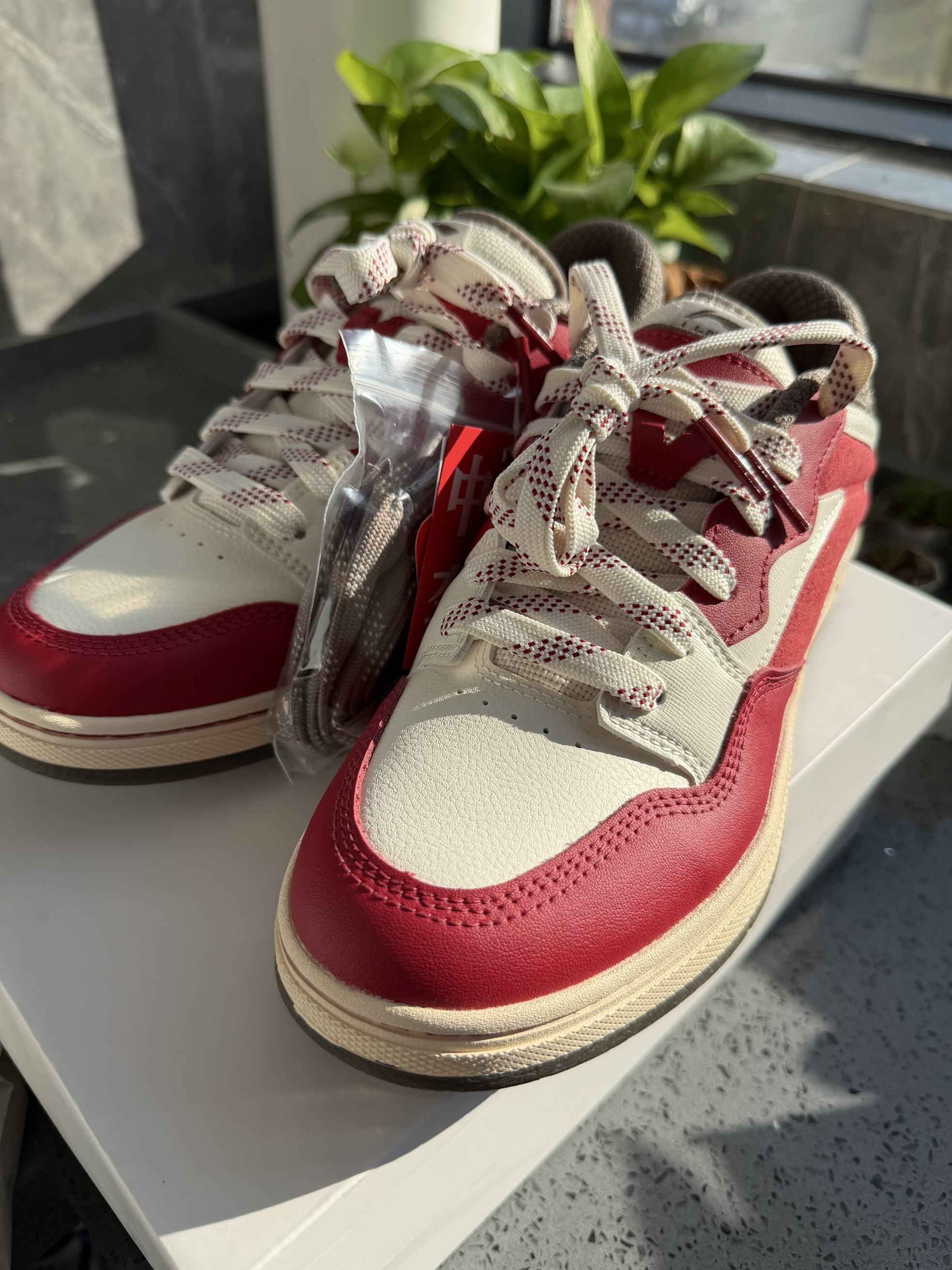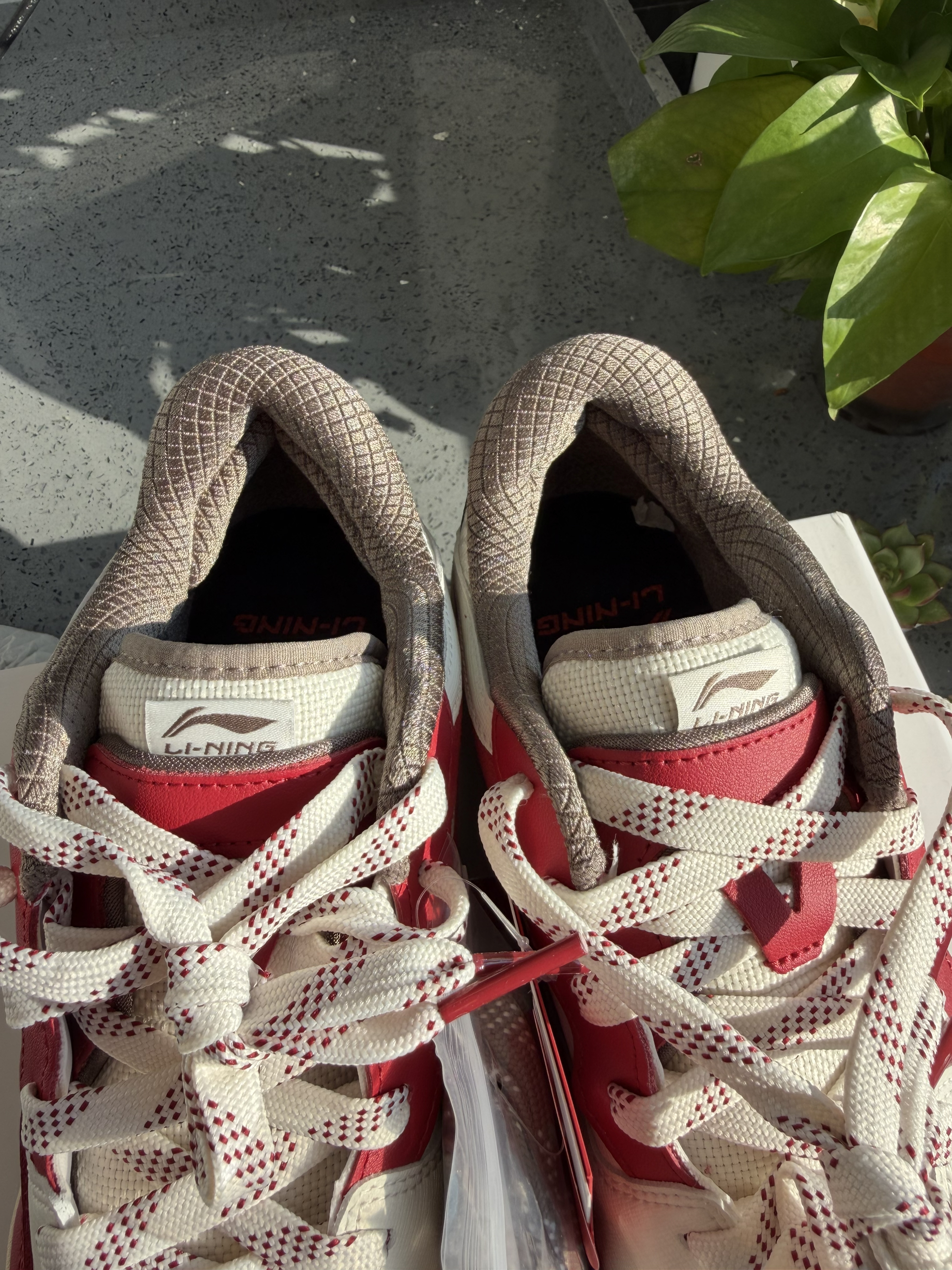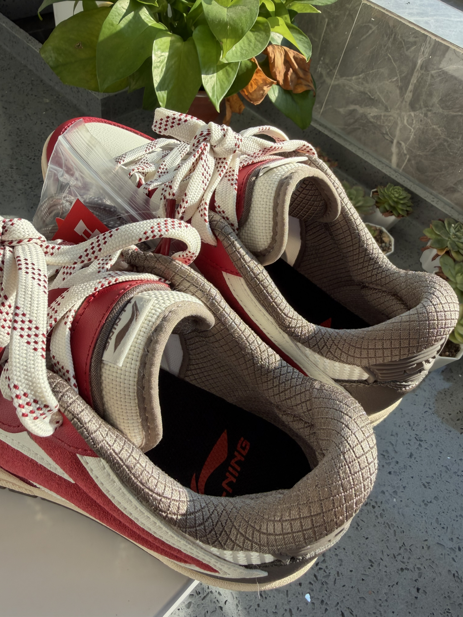 谁懂啊!李宁这双新鞋直接戳中我的审美点👟 • 配色:米白+酒红+浅棕的组合,复古感拉满!酒红部分是细腻的麂皮,米白是软乎乎的皮质,浅棕内衬带点编织纹理,细节质感直接封神。 • 设计:鞋带是带红纹的撞色款,鞋型是不挑脚的低帮板鞋,鞋舌和后跟的李宁标低调又精致,配牛仔裤/运动裤都好看。 • 脚感:鞋底是软弹的那种,走路不累脚,日常通勤或出门逛街都适配。 拿到手拆开包装就被质感惊到,属于“实物比...