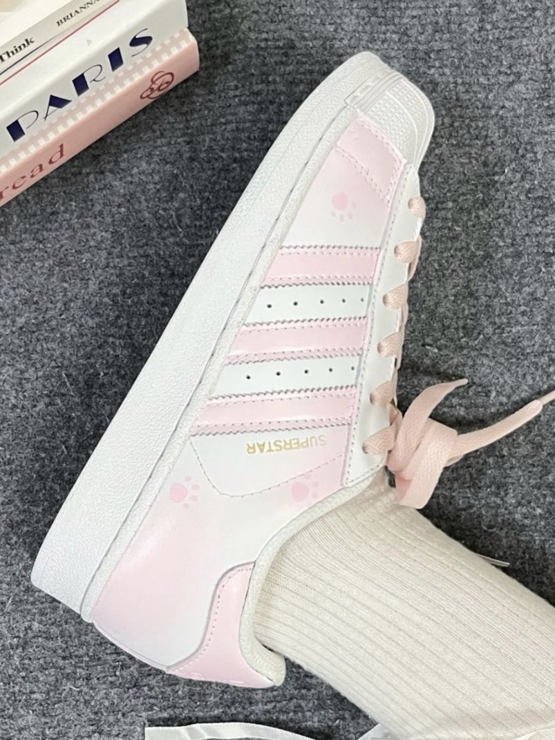 这双球鞋是定制款!定制前是白黑经典贝壳头,定制后是粉粉嫩嫩的。 还设计了猫爪印,一整个少女感拉满!搭配个白色小裙子你就是小甜妹! 鞋底是有一丢丢硬的,其他没什么毛病!尺码也是标准的! #阿迪达斯adidas#阿迪达斯定制球鞋#甜妹女孩的宝藏板鞋#高颜值粉色板鞋