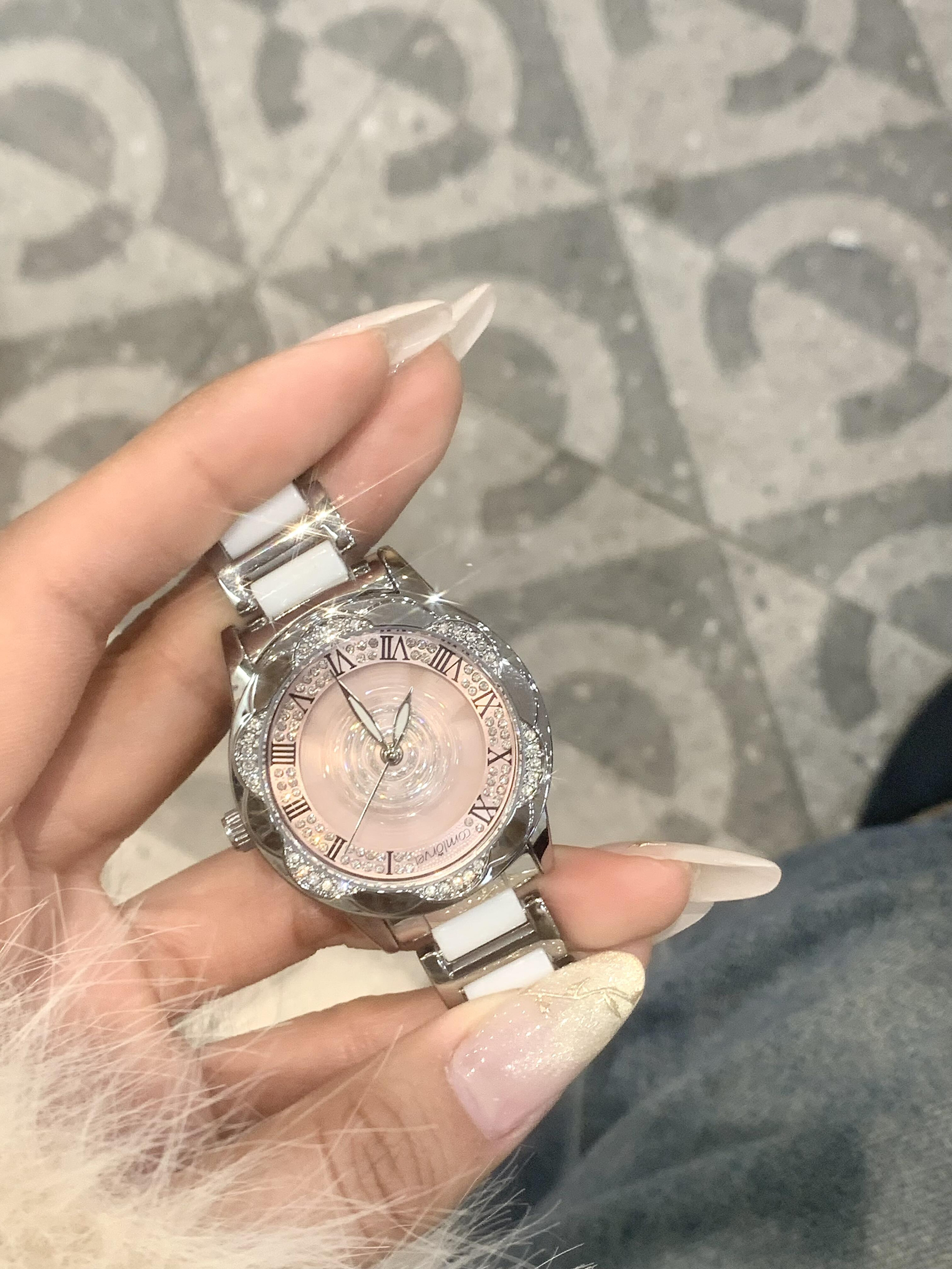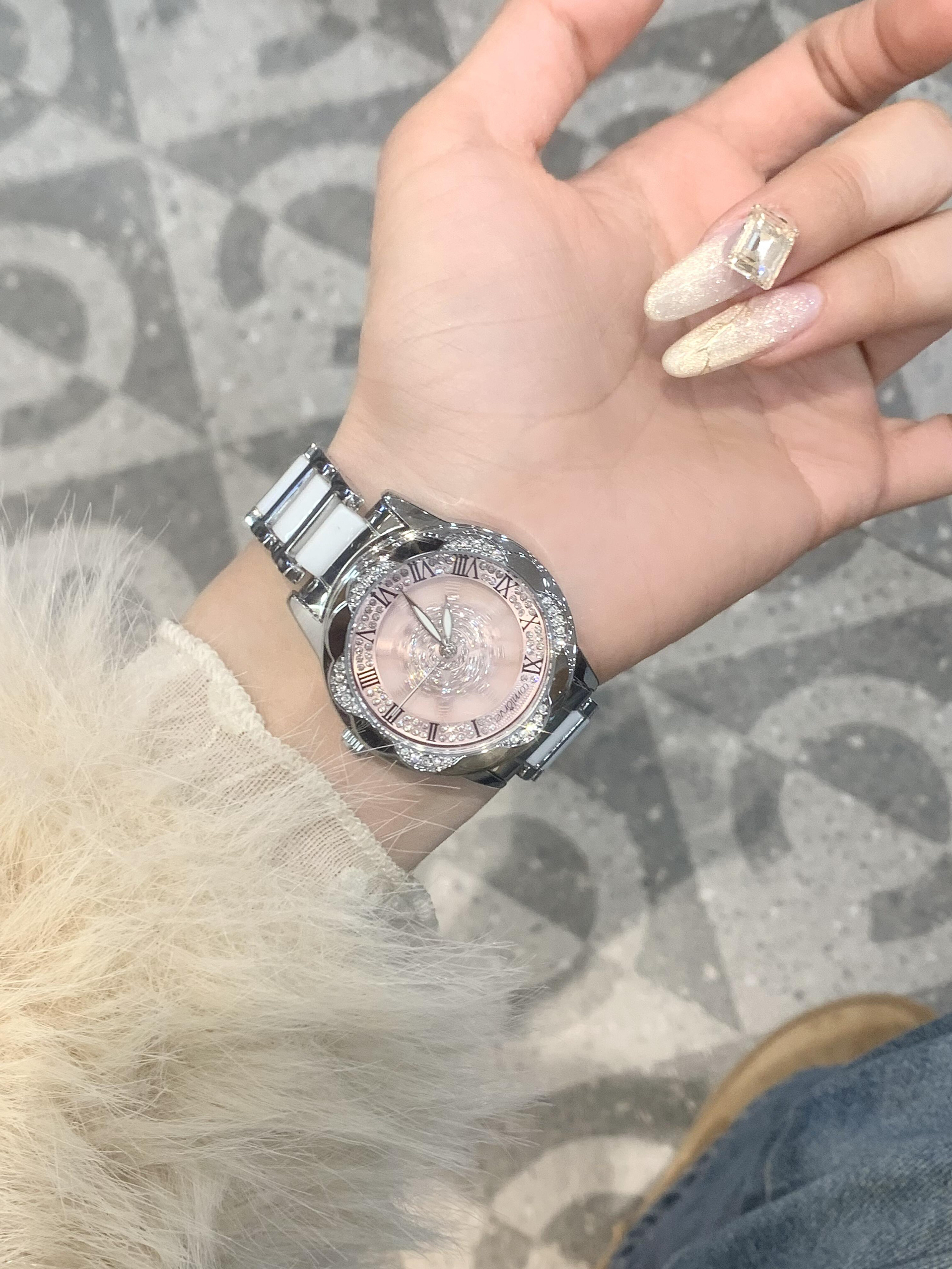 新入的粉盘手表也太戳我了😭 白陶瓷表带超显白,表盘一圈碎钻blingbling的,粉盘还带细闪,日常搭卫衣、小裙子都好看,抬手就是氛围感~