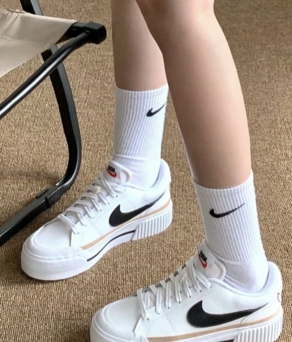 Nike白棕黑板鞋搭配通勤装不突兀,还是很好看的。低帮设计穿脱方便,短时间下楼买个菜、取个快递,脚感还算轻快。 但通勤穿真的有槽点:鞋型偏窄,走15分钟以上就觉得脚掌发紧😮💨;织物拼接的缝隙里藏灰,而且鞋底偏薄,走在石子路上能明显感觉到硌脚。