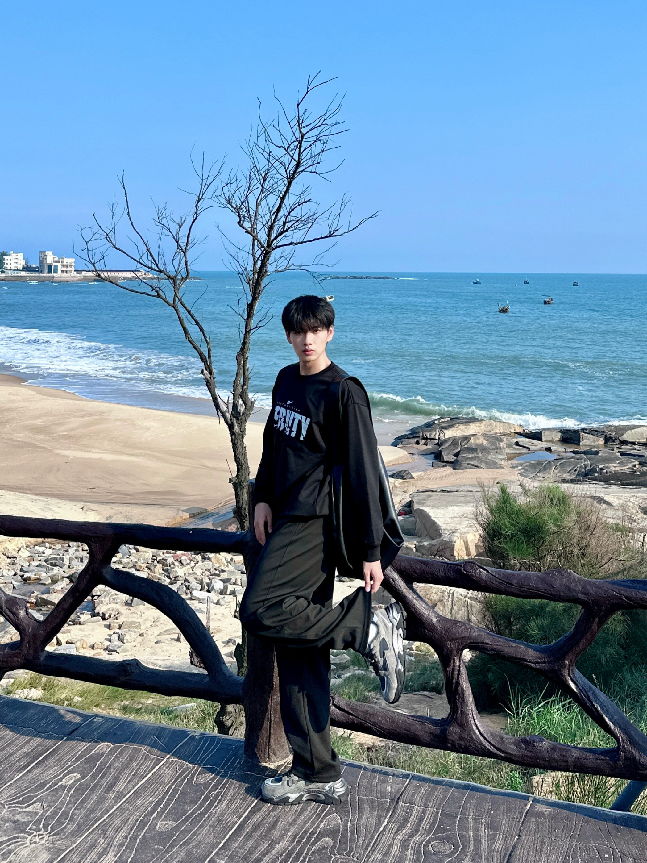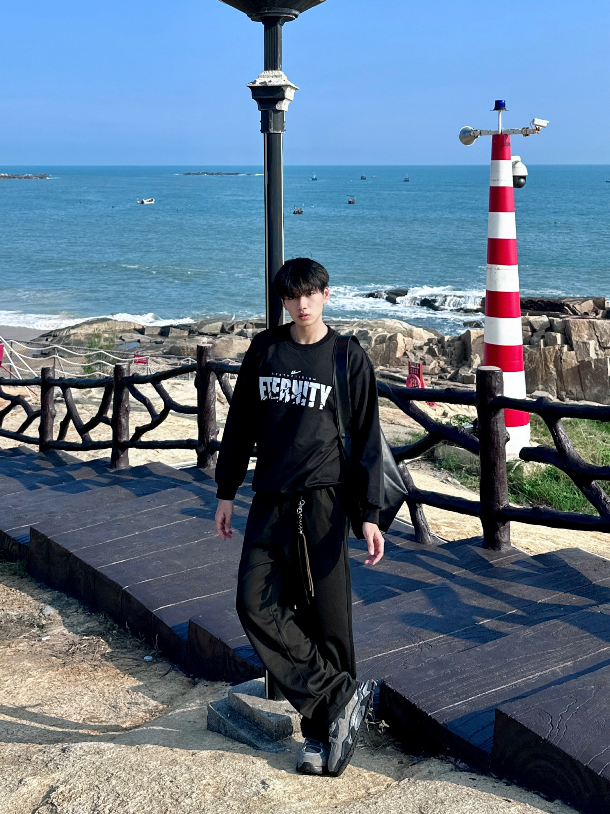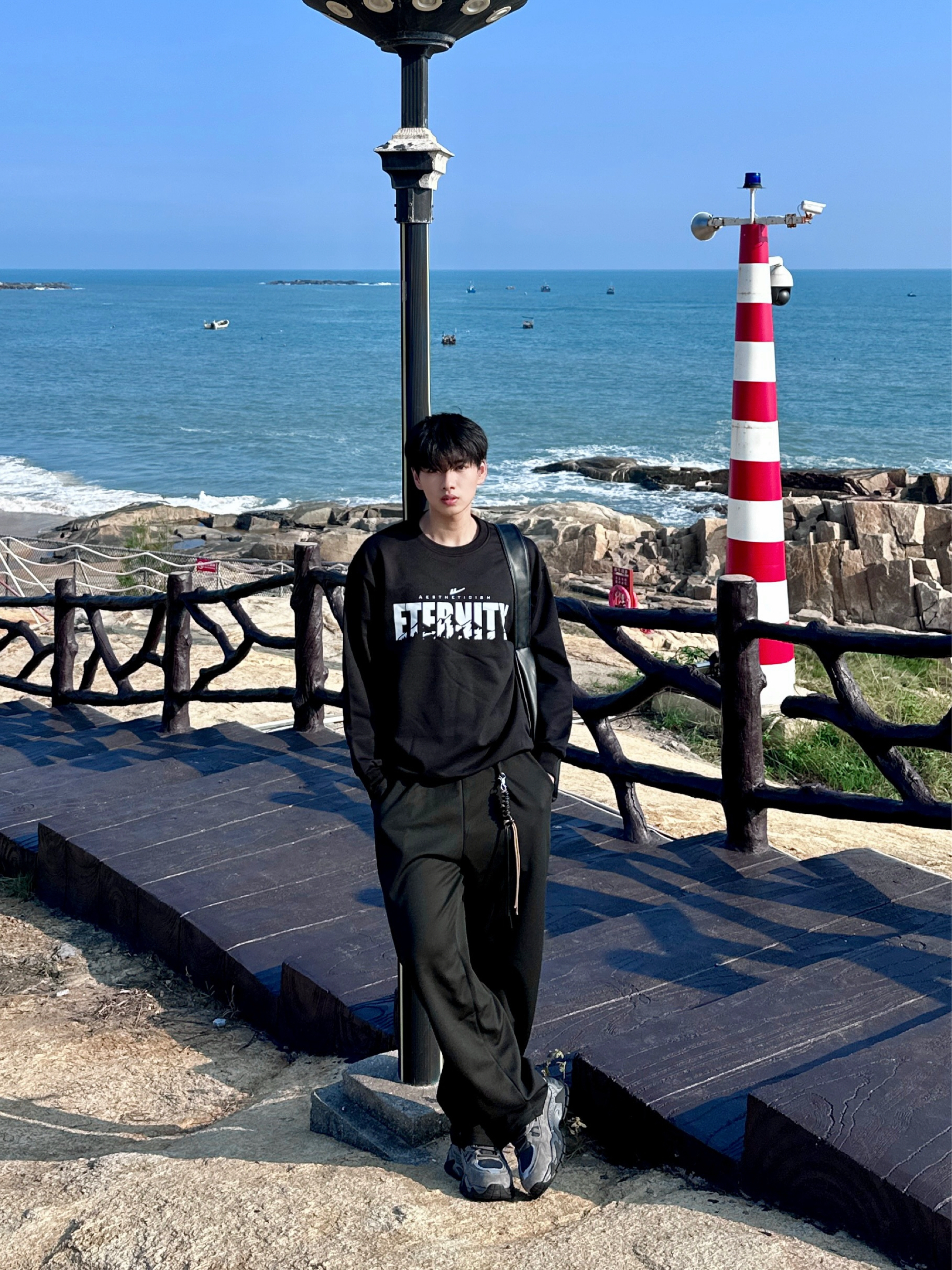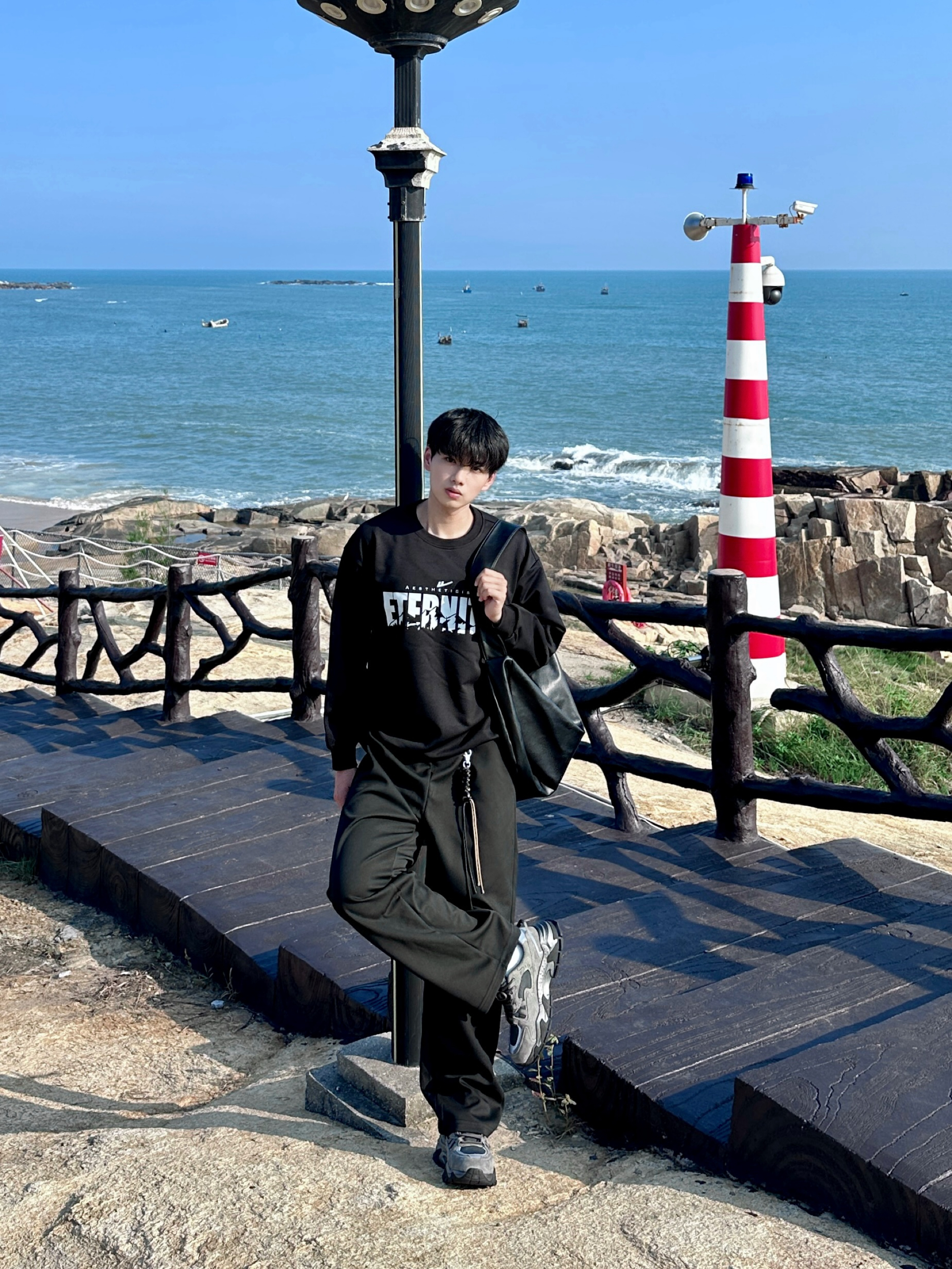 - 好喜欢海边毫不费力的松弛感 在海边灯塔下💡 感受海风拂面而来🌬️ 出行海边主打简单舒服自在为主~ 上身一套黑色系卫衣卫裤 面料细腻亲肤 宽松版型好适合户外海边 舒适度拉满 搭配双户外网面灰色老爹鞋 网面设计透气性与舒适性都很ok呢 而且还增高不少哈