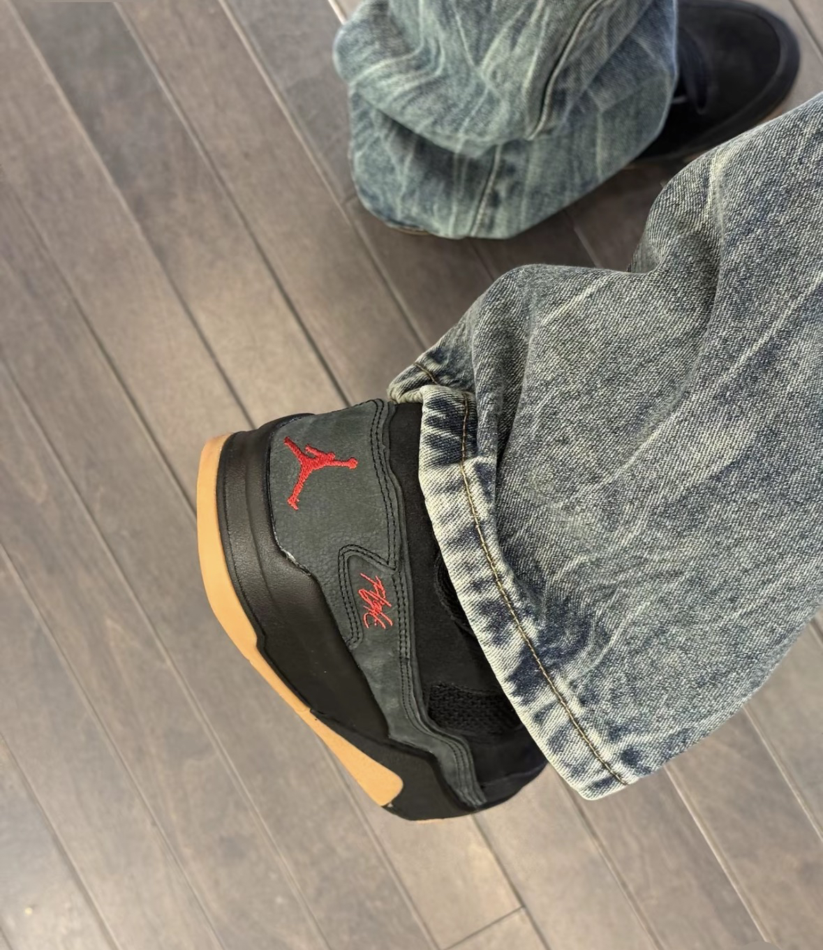 刚拿到手觉得就是双普通低帮鞋,但侧边暗红色的飞人标像藏在树荫下的浆果,走路时会若隐若现。我那双是灰调主色配棕底,麂皮和网面混搭的鞋面摸起来像摸小猫的耳背,粗粝里带着温软。