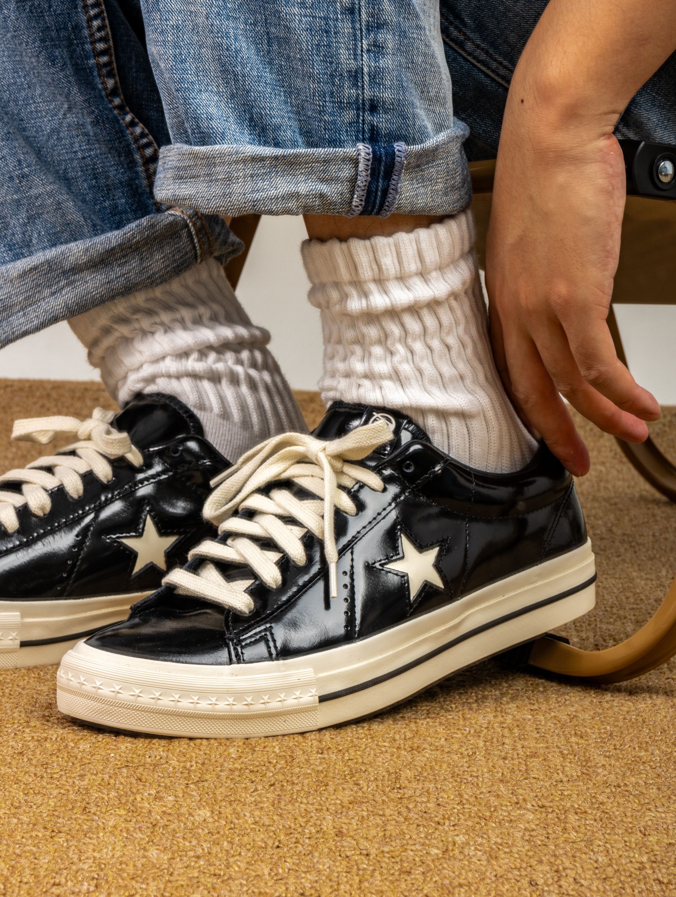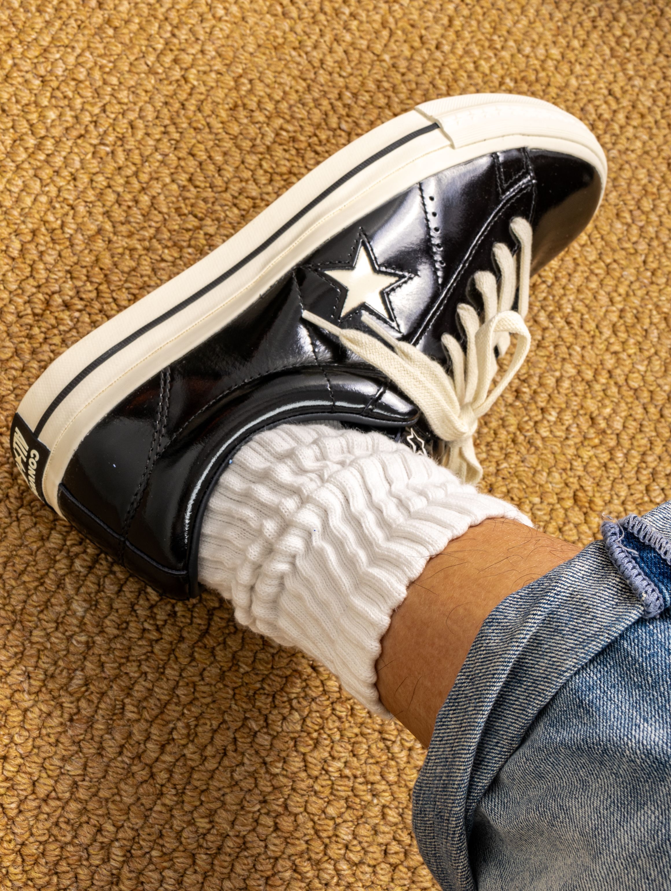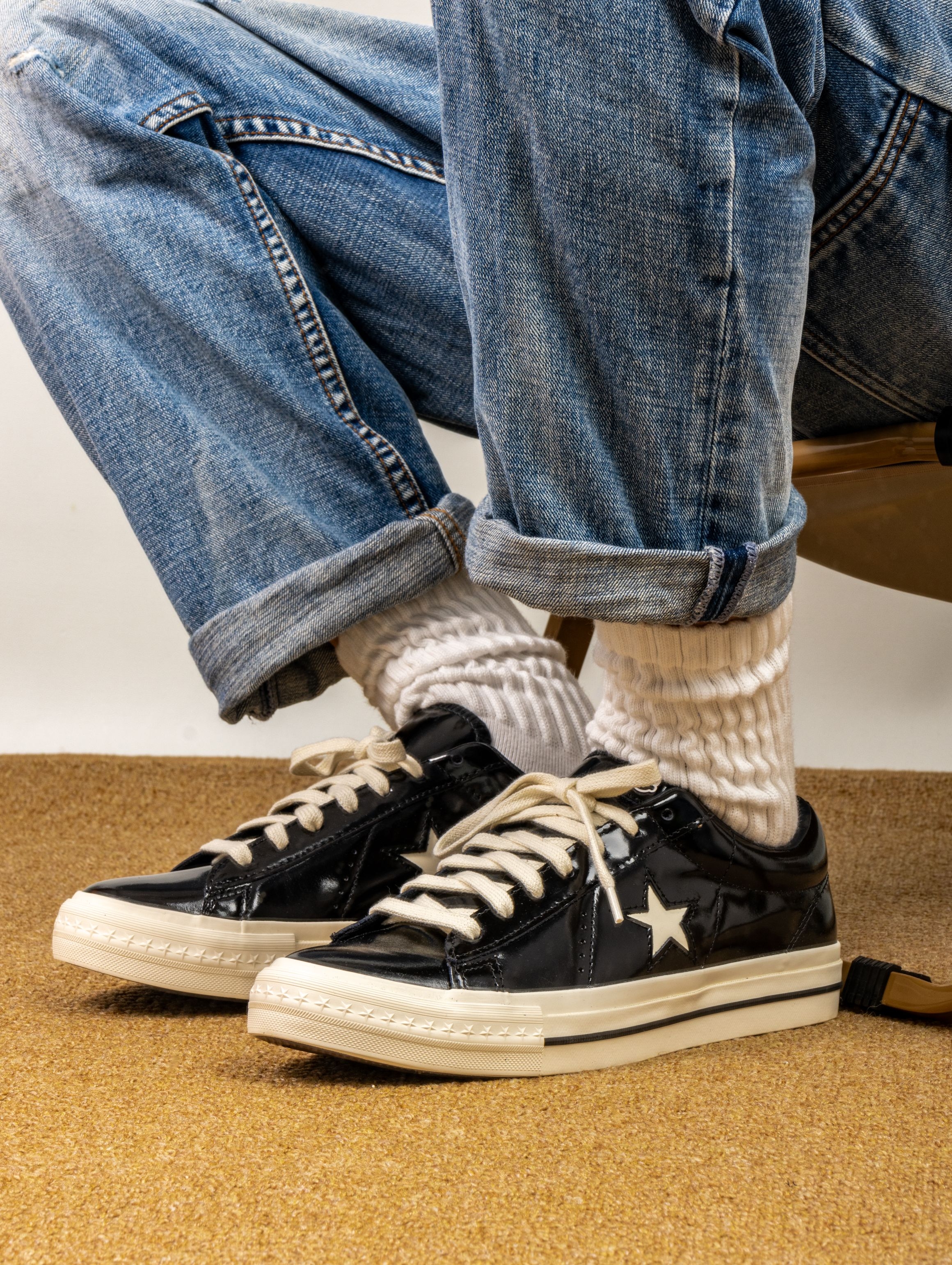 Converse x Noritake联名真的太戳我了,那个经典的小人简笔画印在鞋侧,每次低头看到都觉得好治愈。 漆皮材质很特别,比普通帆布更好打理,雨天穿出门也不怕。ONE STAR的鞋型果然名不虚传,鞋垫比想象中软,穿着逛了半天街也没磨脚。 配白袜子+牛仔裤就很好看,简约又有小心机。这个小人图案让整双鞋都变得有趣起来~是近期最爱的日常鞋没有之一