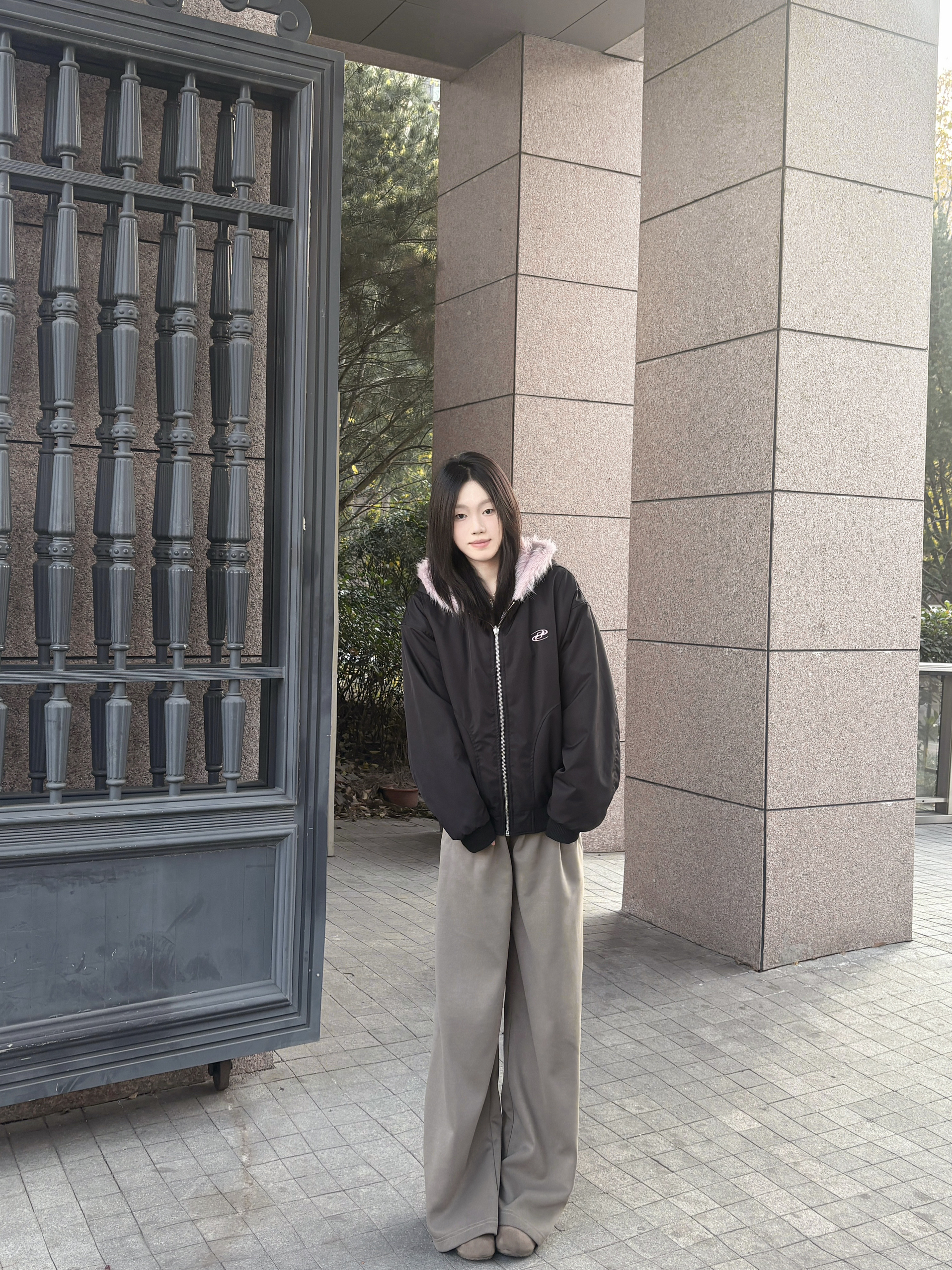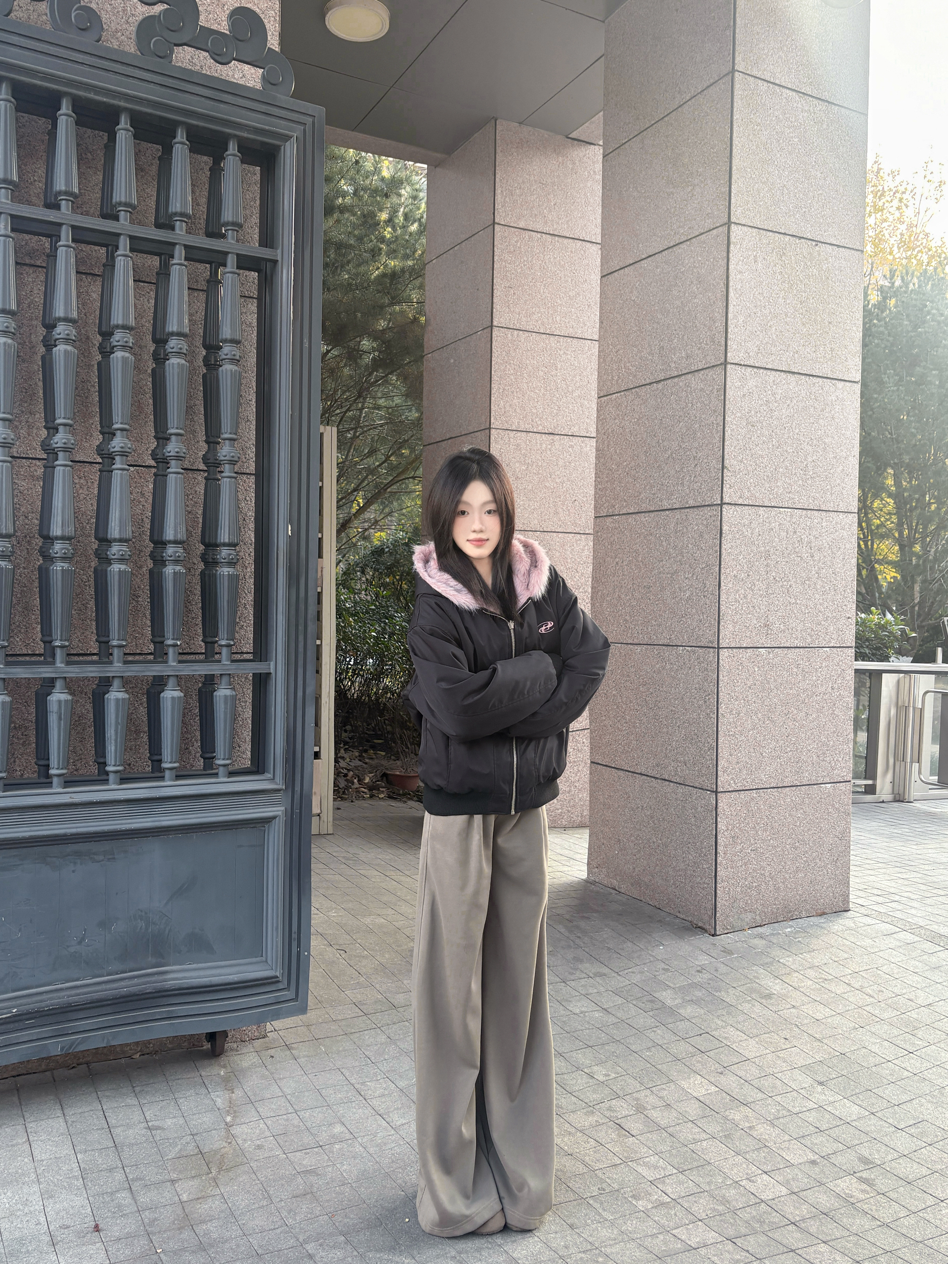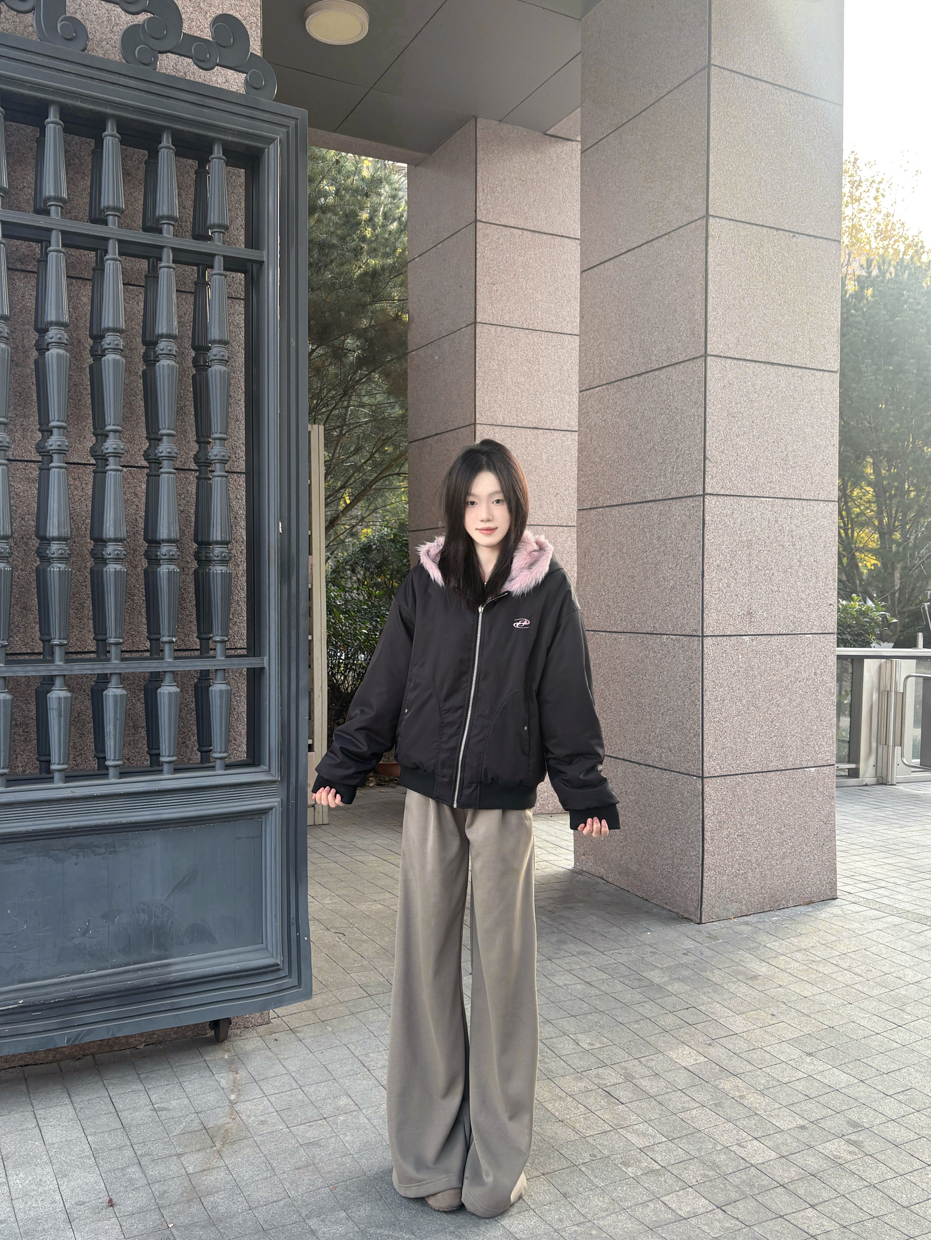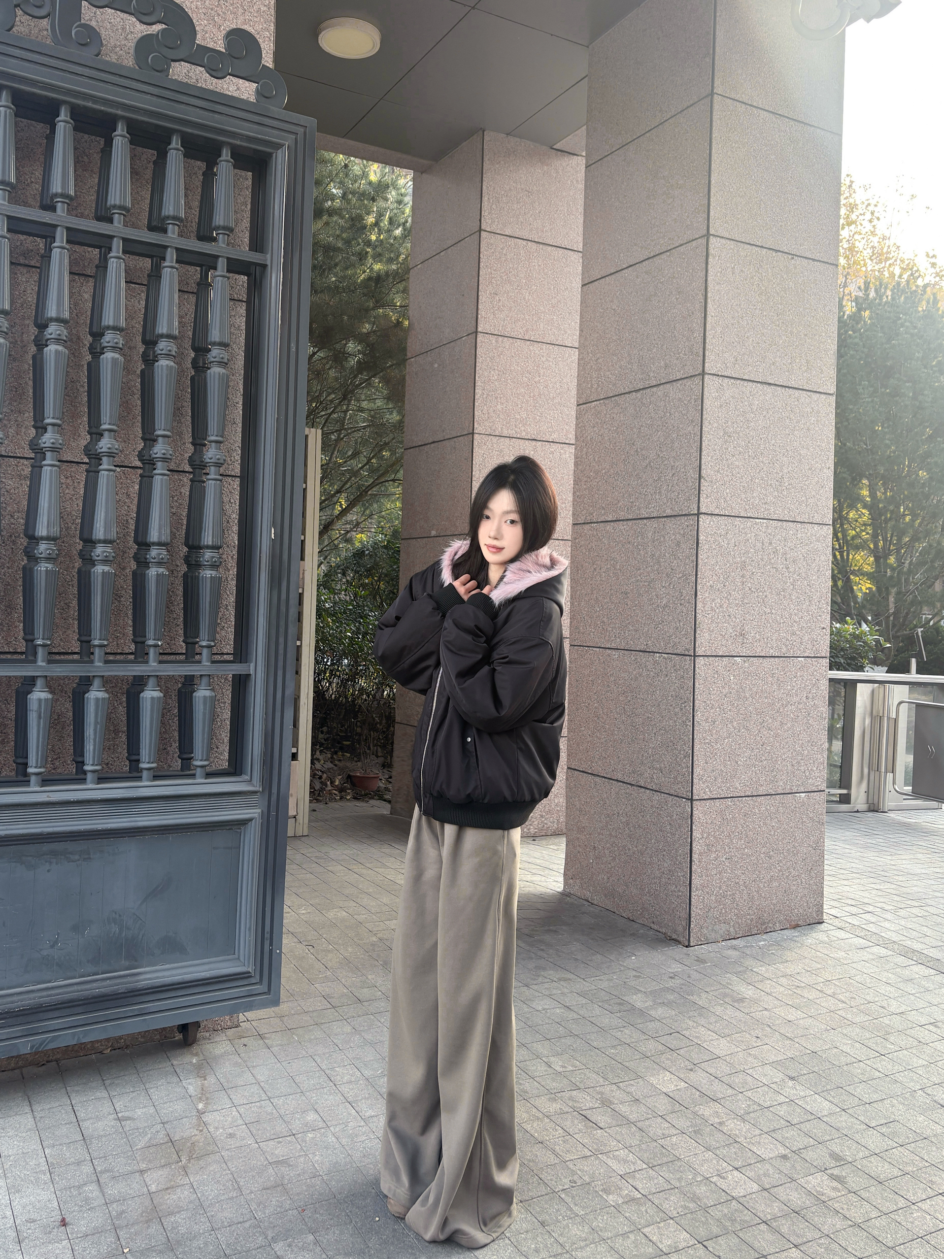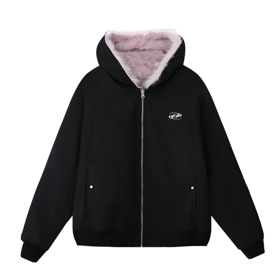 降温后这件两面穿棉服成了我的常穿款,版型是宽松的,里面套厚内搭也不局促,肩线做得刚好,不会显臃肿 一面是黑色配粉毛领,毛领摸着手感软,看着不廉价;另一面是毛绒面,贴身穿暖和但不闷,整体还不错呢